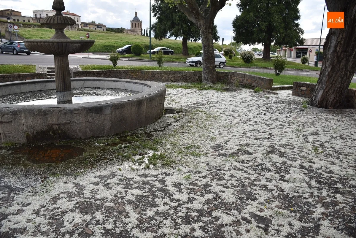 Aunque el cielo parece empeñarse algunos días en negarlo (como por ejemplo este mismo jueves desde el mediodía, con varios chaparrones periódicos a lo largo del día), el calendario marca que estamos en primavera, pudiéndose ver estos días una estampa totalmente propia de estas fechas en pleno corazón de Ciudad Rodrigo, en la Glorieta del Árbol Gordo.