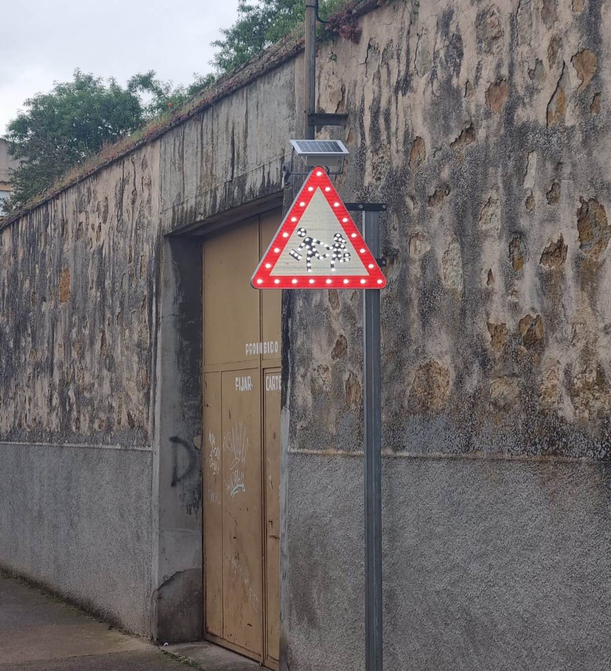 En total, el Consistorio ha adquirido 25 unidades de dos modelos de señales (de uno hay alguna más que del otro): la indicativa de peligro por la proximidad de un lugar frecuentado por niños, y la informativa de la existencia de un paso de cebra para peatones. Como se puede entender mejor viendo las imágenes, estas señales cuentan con luces leds, que van destellando (funcionan mediante una pequeña placa solar situada en su parte superior).