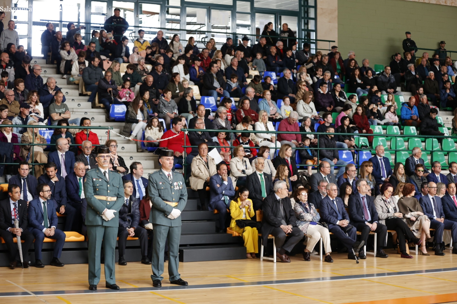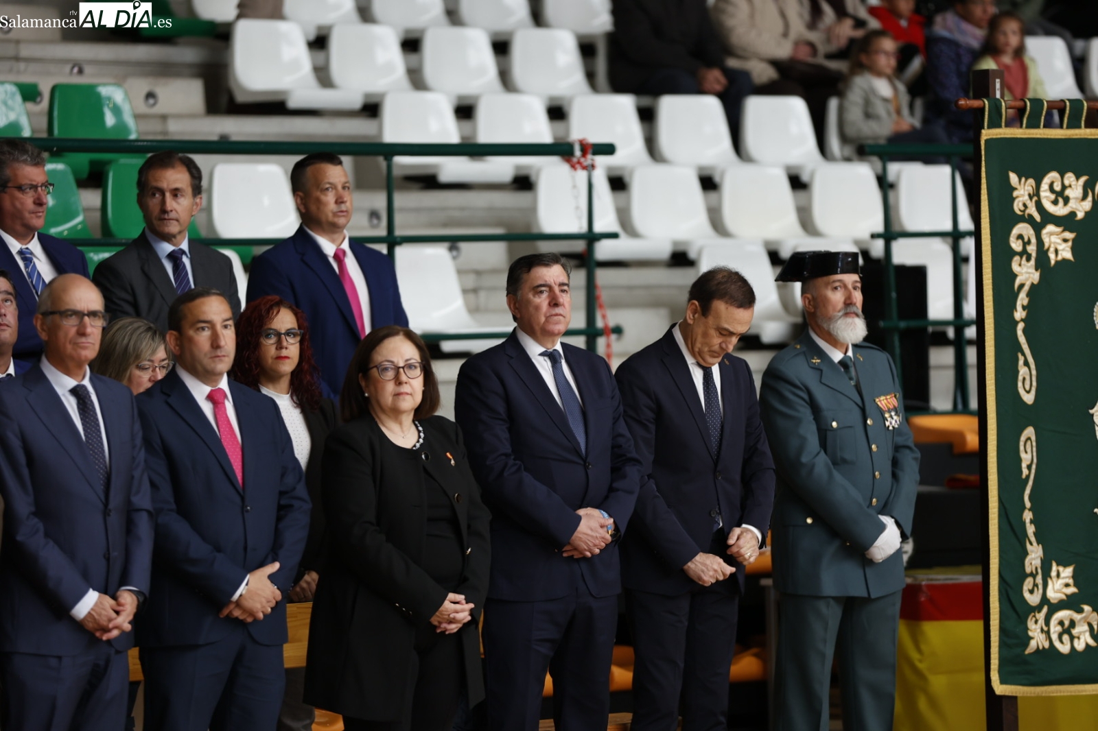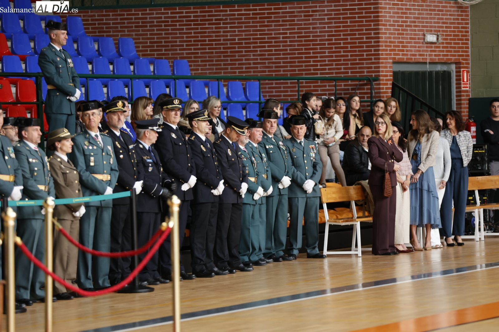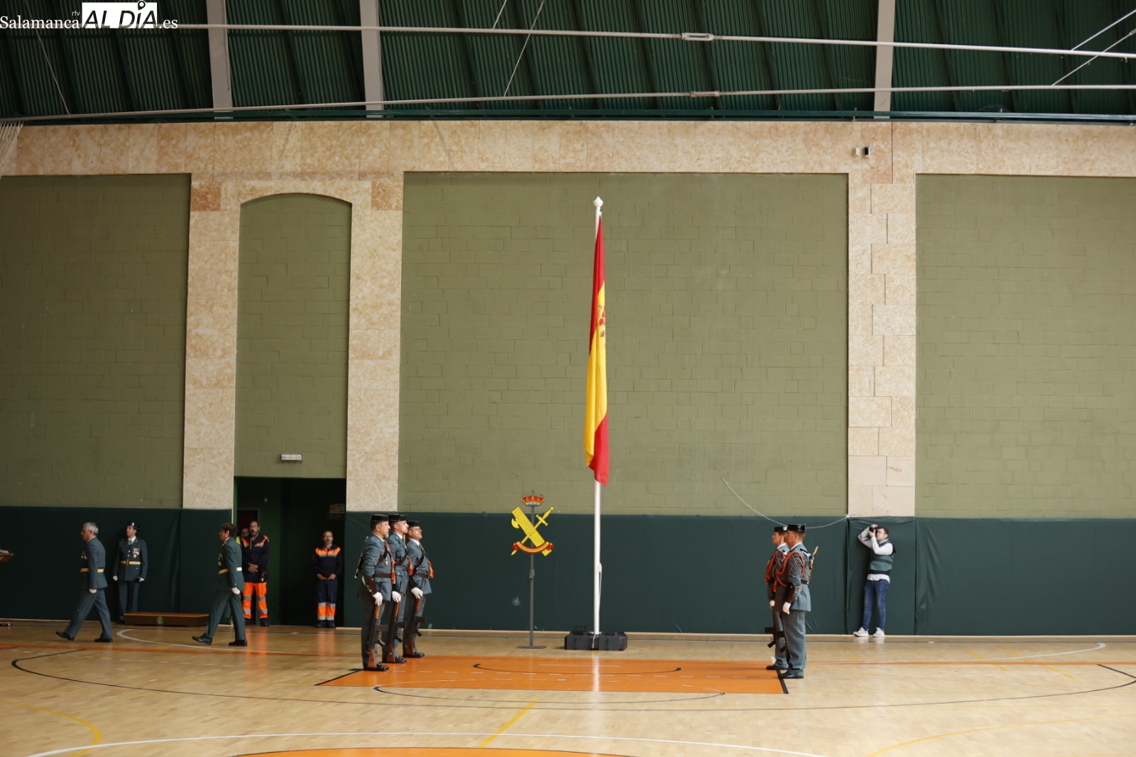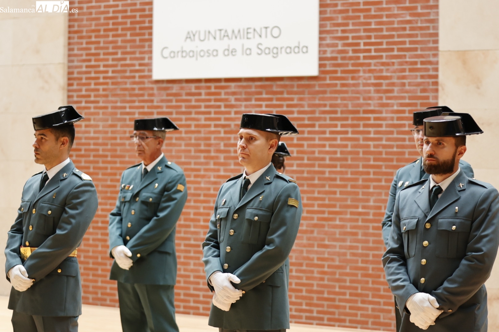 El pabellón municipal de Carbajosa de la Sagrada ha sido el escenario esta mañana de sábado, 10 de mayo, de los solemnes actos conmemorativos del 181 Aniversario de la Fundación del Cuerpo de la Guardia Civil. La celebración, presidida por Arturo Marcos, Teniente Coronel Jefe de la Comandancia de Salamanca y Rosa López, Subdelegada del Gobierno en Salamanca, ha contado con la asistencia de diversas autoridades civiles y militares de la provincia y ha congregado a numeroso público, en un evento que tuvo que ser celebrado bajo techo debido a las inclemencias meteorológicas.