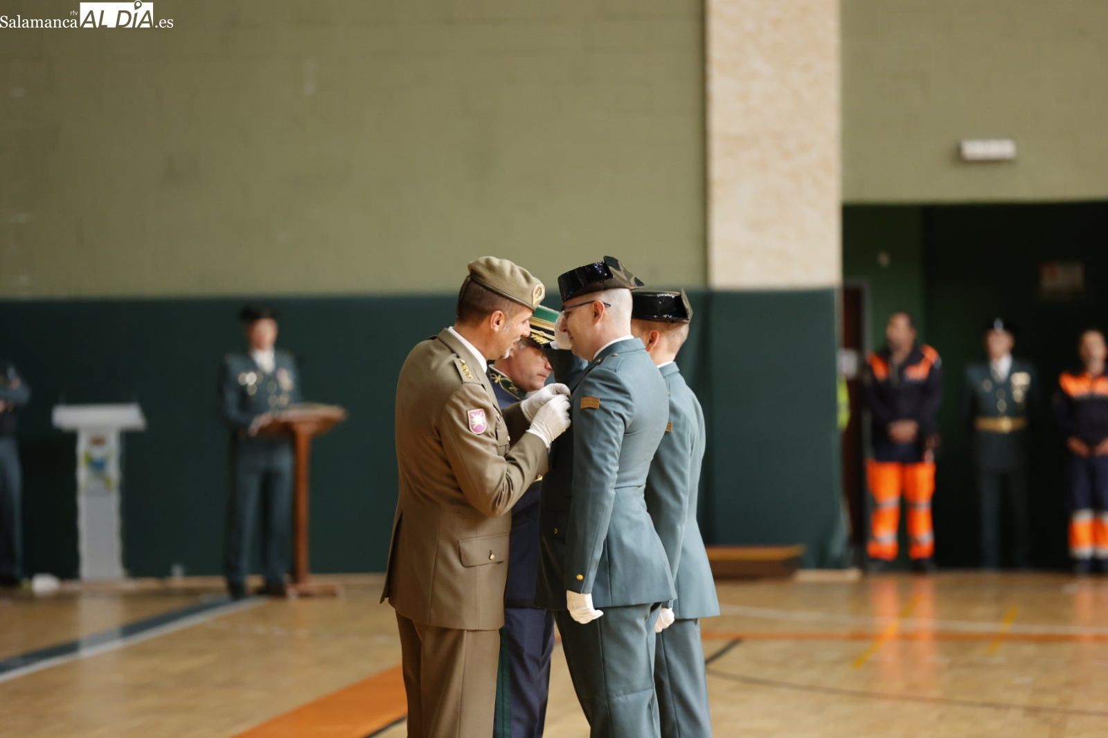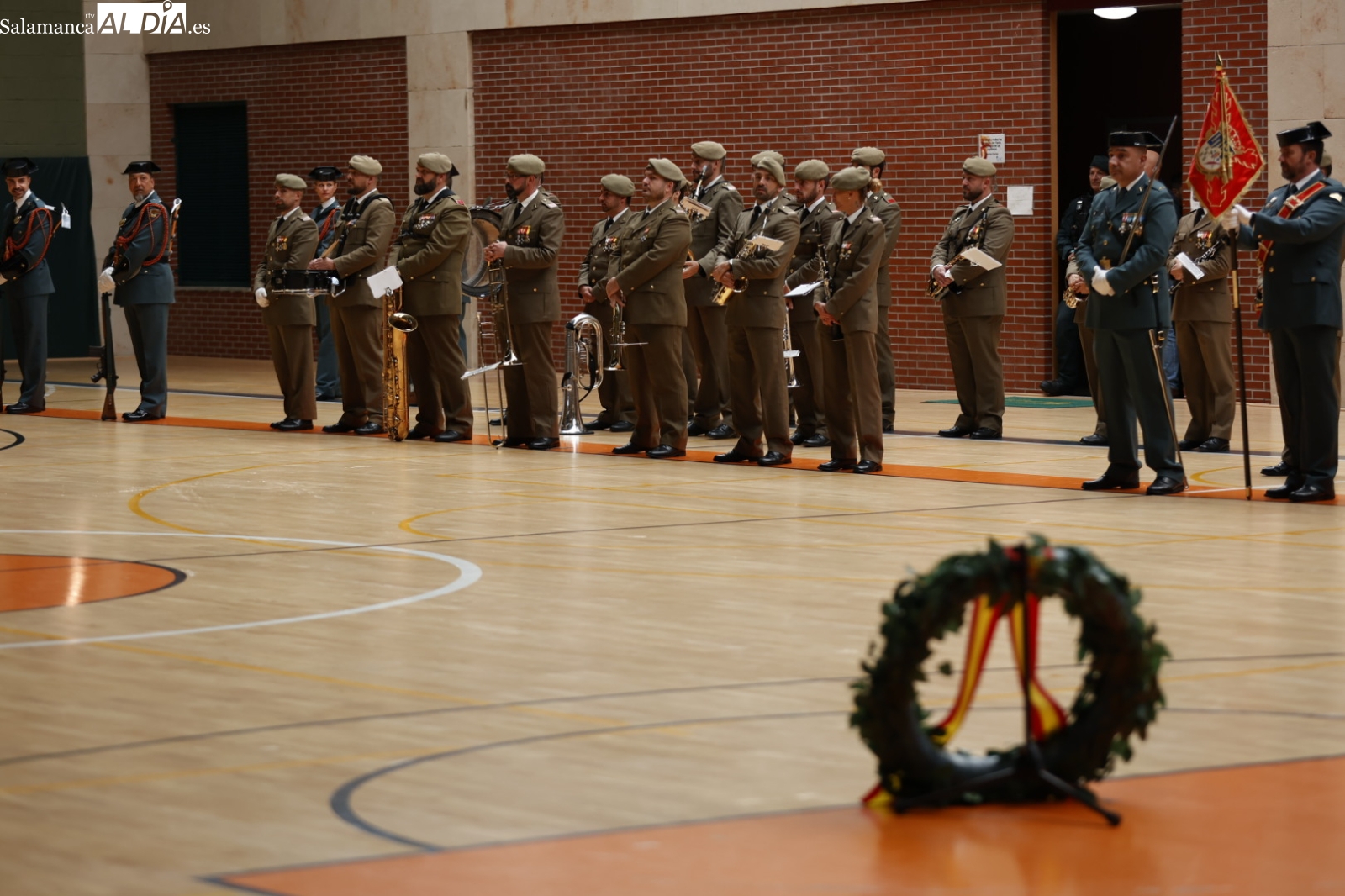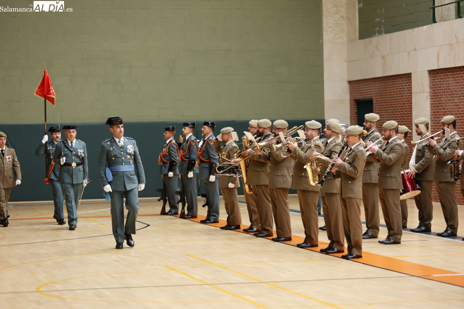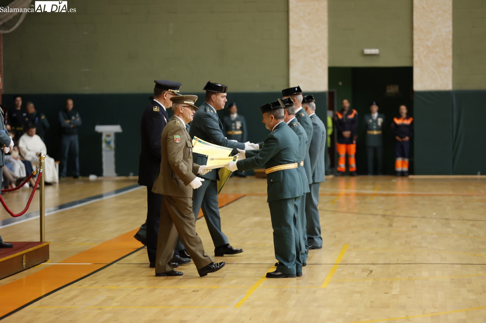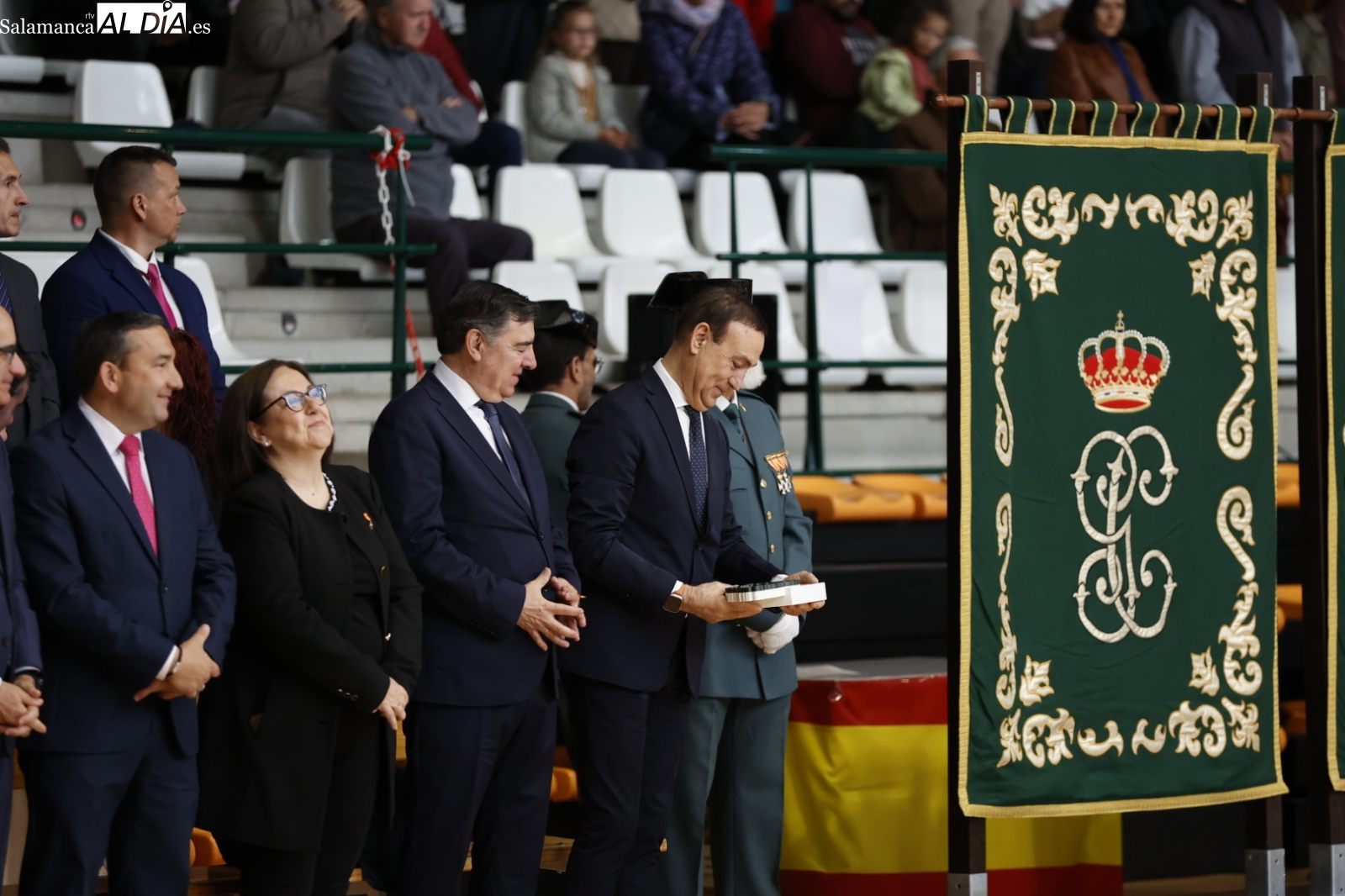El pabellón municipal de Carbajosa de la Sagrada ha sido el escenario esta mañana de sábado, 10 de mayo, de los solemnes actos conmemorativos del 181 Aniversario de la Fundación del Cuerpo de la Guardia Civil. La celebración, presidida por Arturo Marcos, Teniente Coronel Jefe de la Comandancia de Salamanca y Rosa López, Subdelegada del Gobierno en Salamanca, ha contado con la asistencia de diversas autoridades civiles y militares de la provincia y ha congregado a numeroso público, en un evento que tuvo que ser celebrado bajo techo debido a las inclemencias meteorológicas.