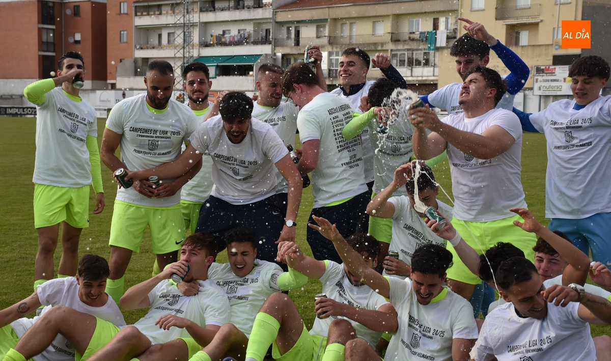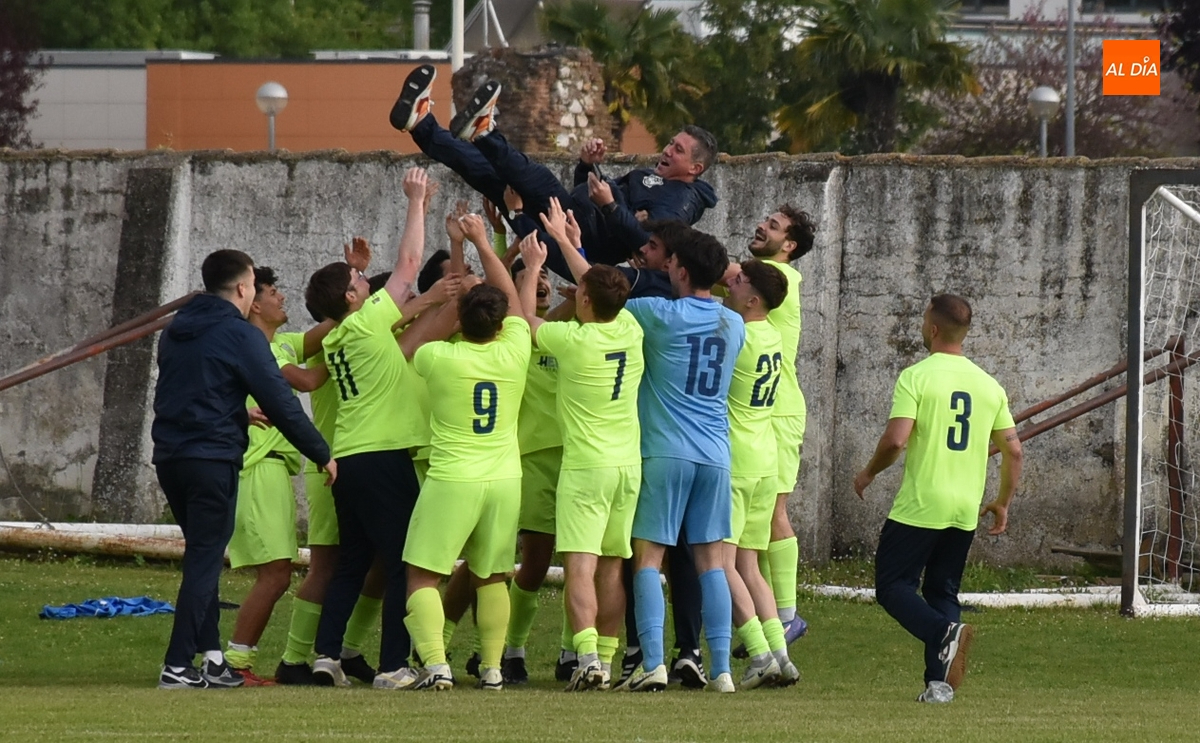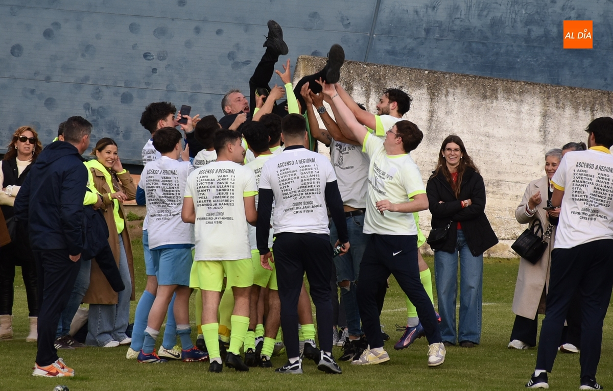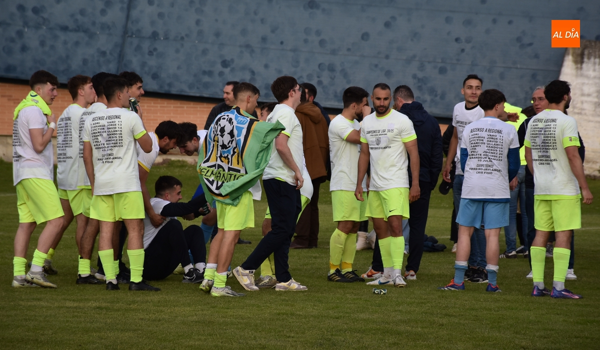 Tras ese primer momento de alivio, los jugadores y técnicos del Helmántico comenzaron a celebrar el doble éxito acompañados de unos cuantos familiares, amigos e integrantes de la cantera del Club capitalino. Dentro de esa celebración, se pusieron las clásicas camisetas conmemorativas con los nombres de todos ellos, se regaron con alcohol de latas y botellas, encendieron algún puro y hubo los clásicos manteos sobre el césped del Francisco Mateos antes de pasar al vestuario del vecino Pabellón Eladio Jiménez, donde continuó el ambiente festivo según ha mostrado el Club en sus redes sociales.