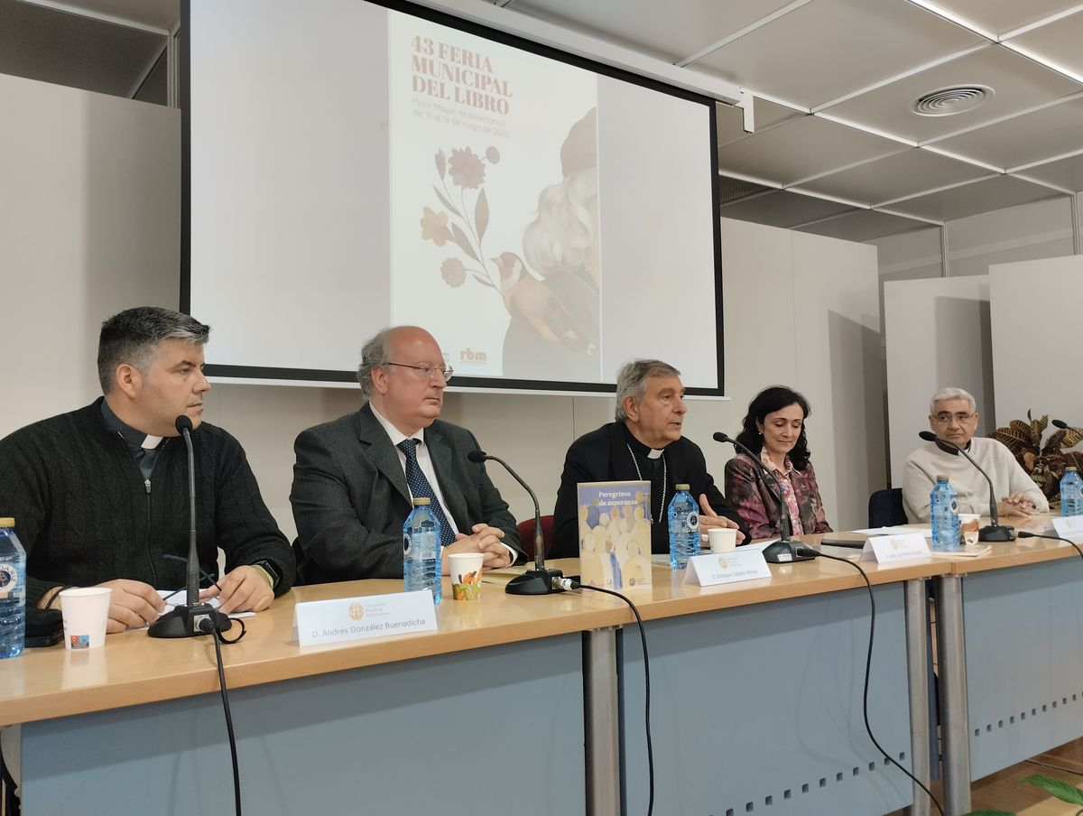Este viernes se ha presentado el libro 'Peregrinos de esperanza', en el que ha participado el Servicio de Publicaciones de la UPSA y la Diócesis de Salamanca, y ha contado con la asistencia del obispo de Ciudad Rodrigo y de Salamanca y Gran Canciller de la UPSA, Mons. José Luis Retana Gozalo; el Vicario de Pastoral, Andrés González Buenadicha, así como el presidente del Consejo Económico y Social de Castilla y León y profesor de la USAL, Enrique Cabero Morán; el artista y sacerdote Vicente Molina Pacheco, y la catedrática de la Facultad de Comunicación de la UPSA, Asunción Escribano Hernández.