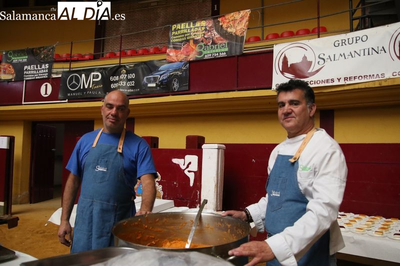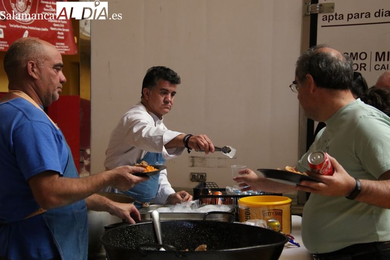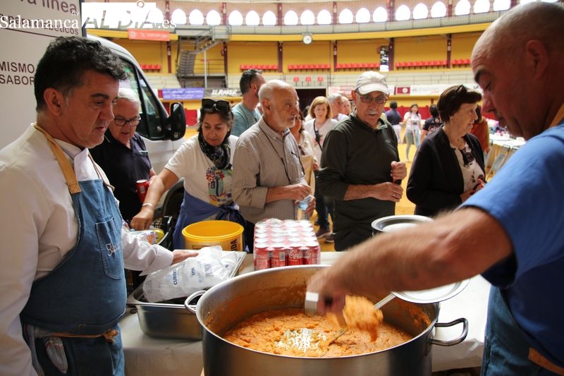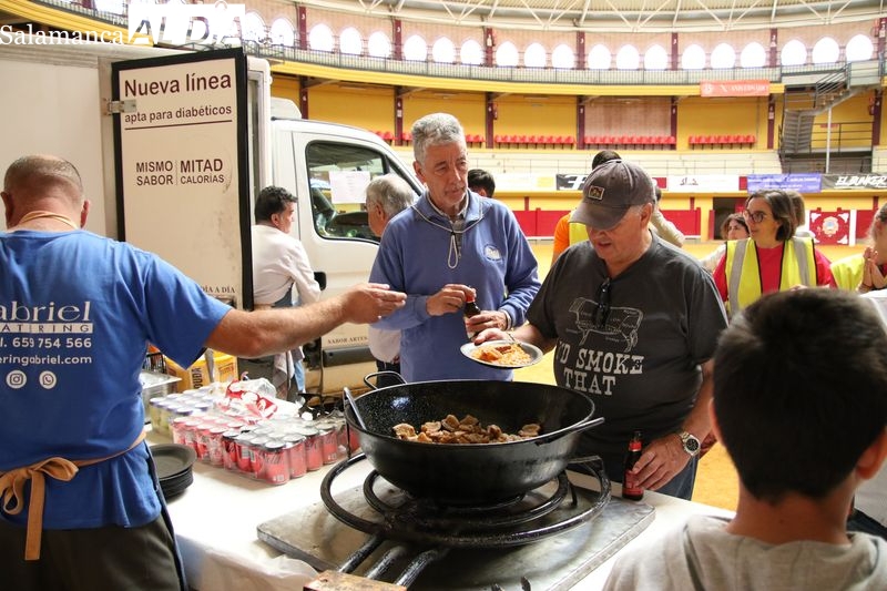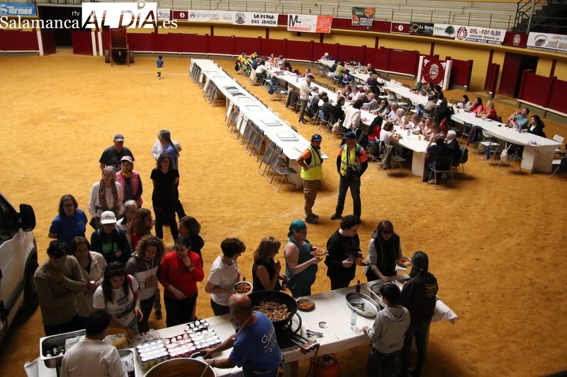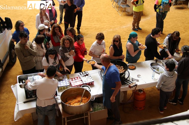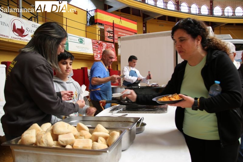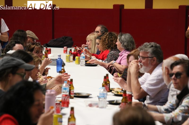 En el coso taurino, los ciento diez peregrinos han podido disfrutar de un menú tradicional, cuidadosamente preparado por Catering Gabriel. La comida ha consistido en unas reconstituyentes patatas meneas con tocino, un plato emblemático de la gastronomía salmantina, seguido de una deliciosa tarta de queso como postre.