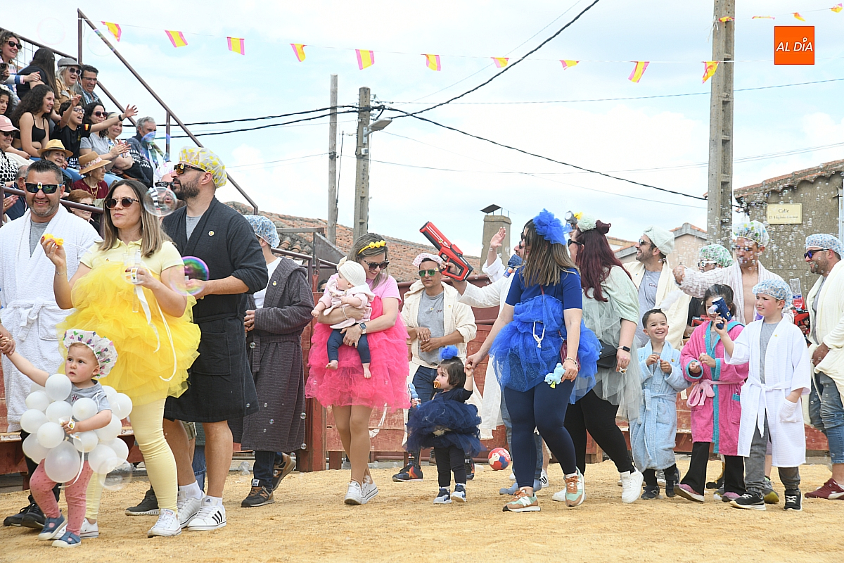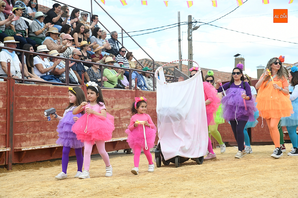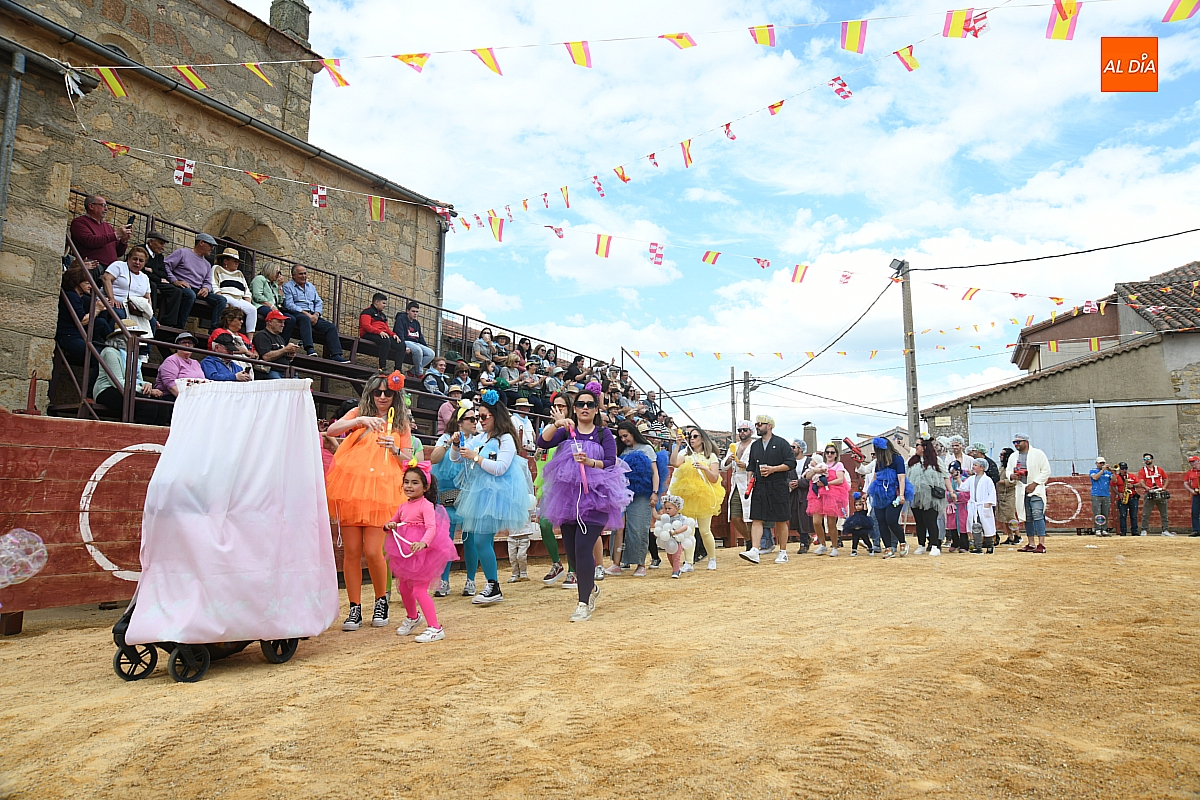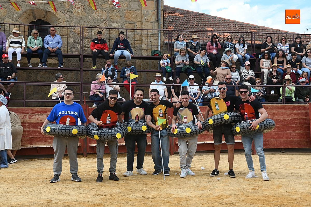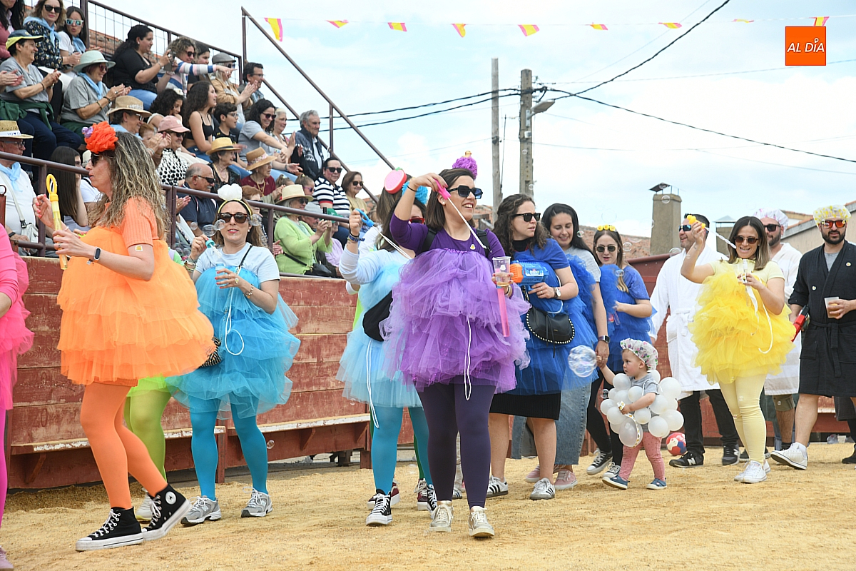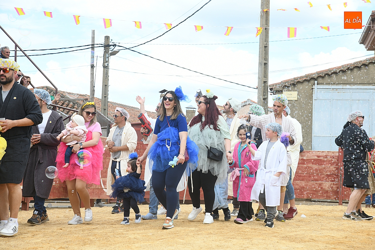 Por la tarde, el pueblo se tiñó de color y creatividad con el desfile de peñas disfrazadas. Grupos de amigos y familias recorrieron las calles con originales atuendos ante el aplauso del público, que llenaba las gradas del improvisado coso taurino. El jurado premió a la peña "Moteros Roqueros" con un lote de embutido ibérico y vino, que seguramente les ayudará a seguir celebrando con buen sabor de boca.