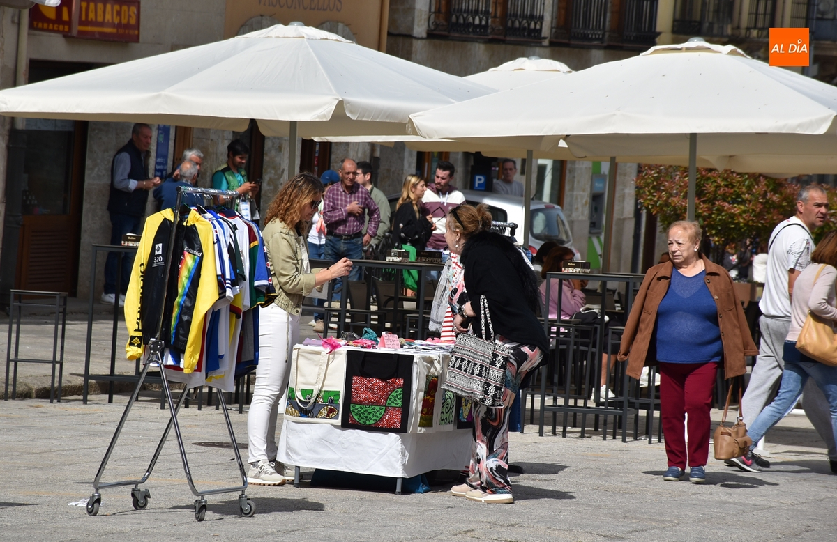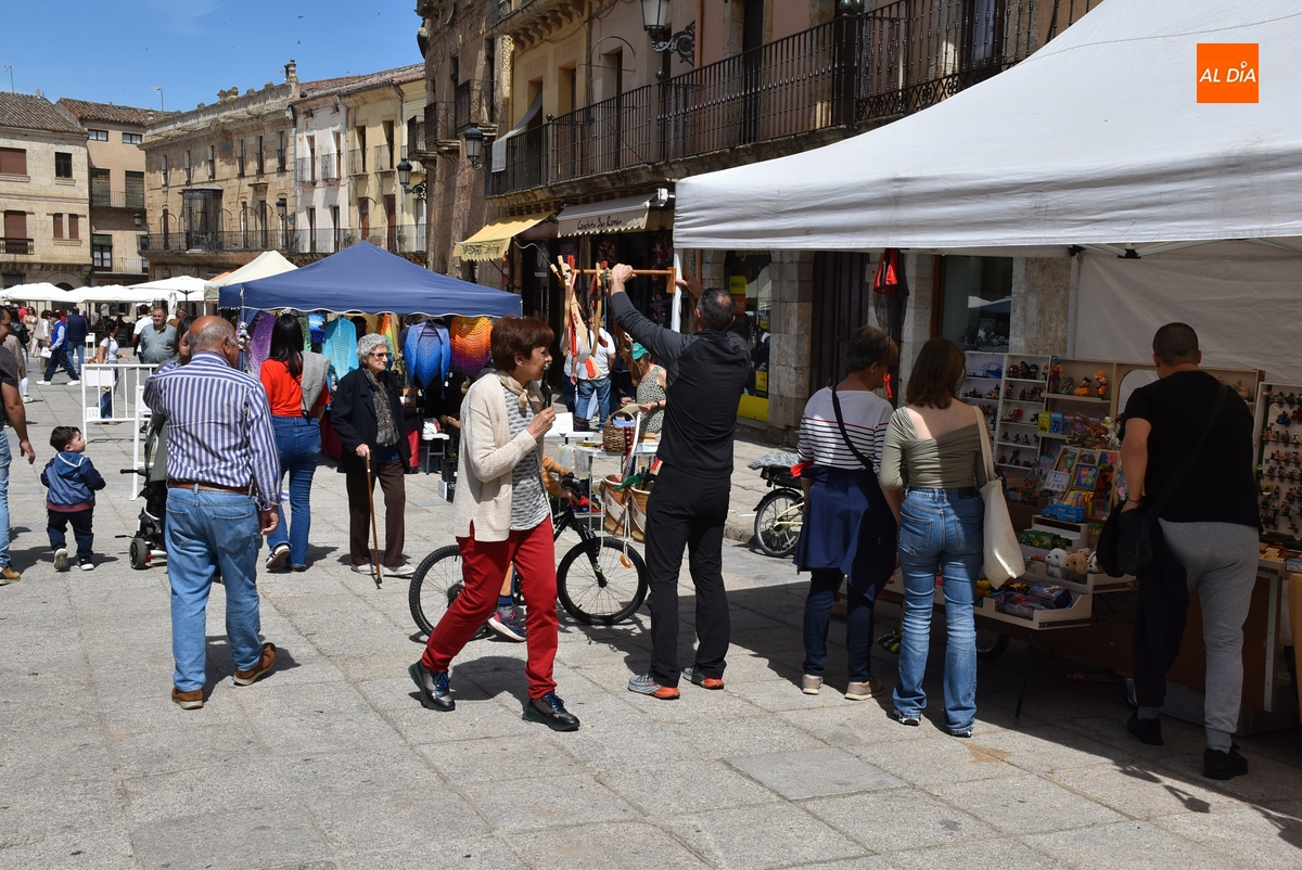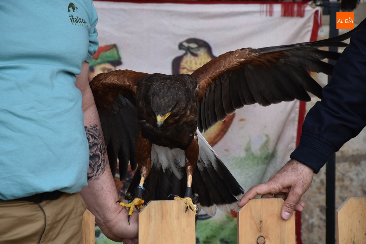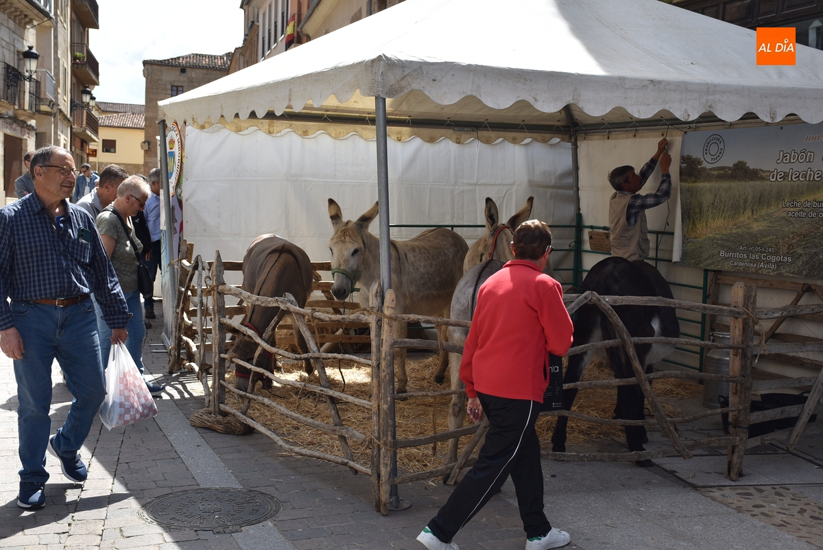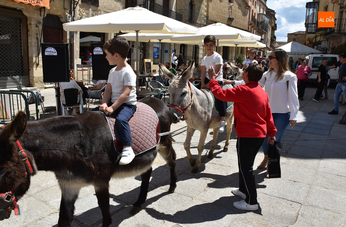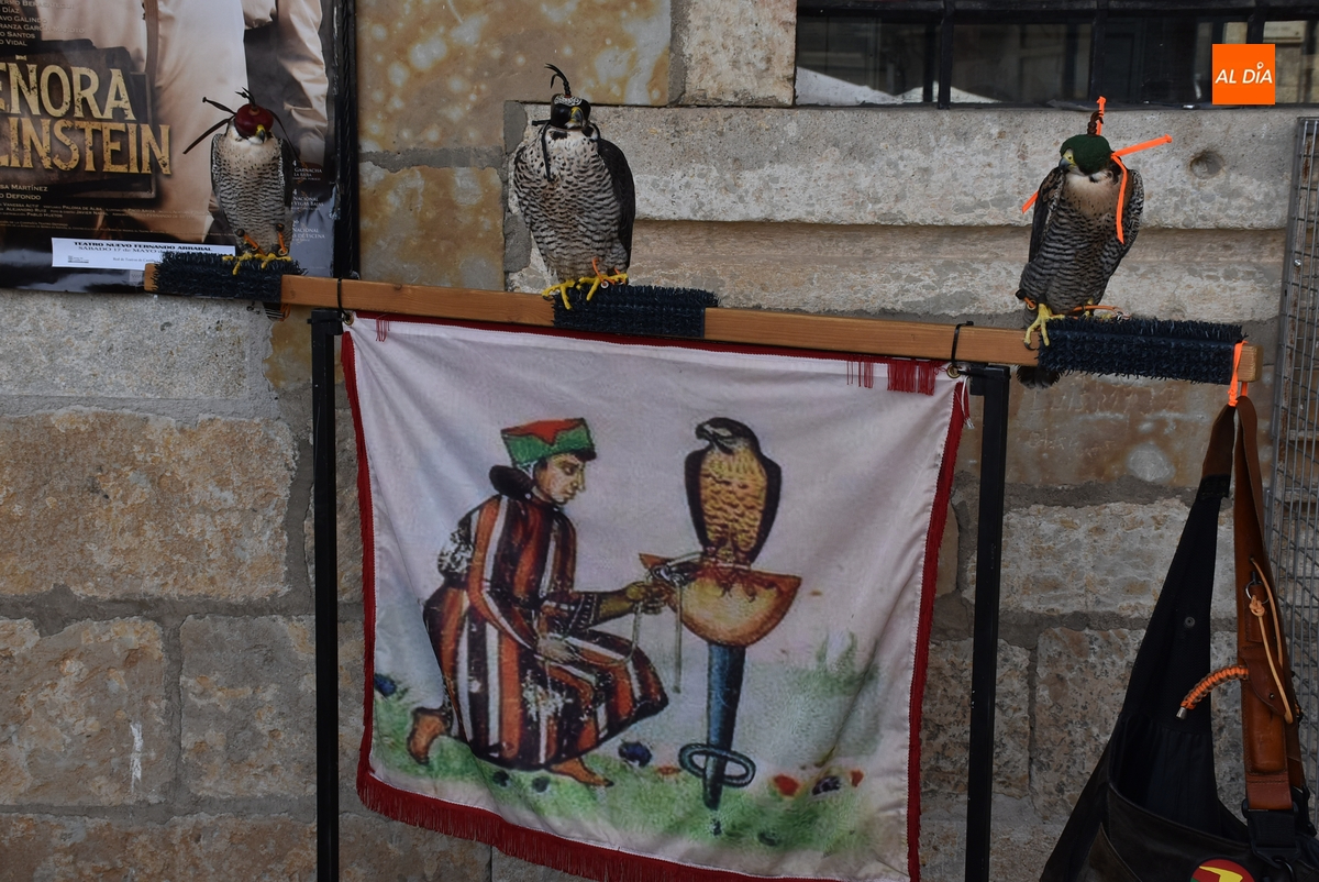 En lo que se refiere a la Plaza Mayor, hubo puestos variados: uno de Asenavis, otro de venta de libros antiguos, otro de camisetas, un par de stands de artesanía variada, etc. En las cercanías estuvieron los elementos propios de la antigua Feria de Mayo (“más enfocados a los niños”, según Joana Veloso), empezando en los soportales de la Casa Consistorial con una muestra de animales de la Granja Escuela La Noria (ocas, gallinas, cabras, etc.) e ifalcon (aves de cetrería).