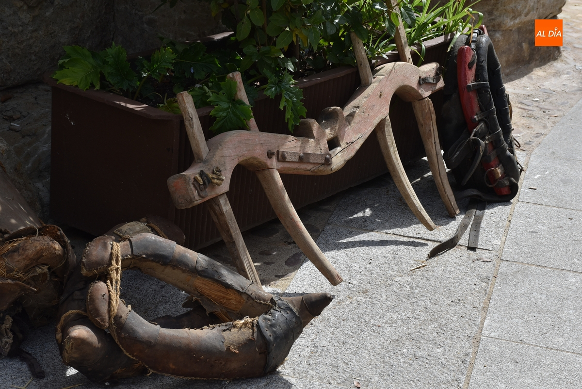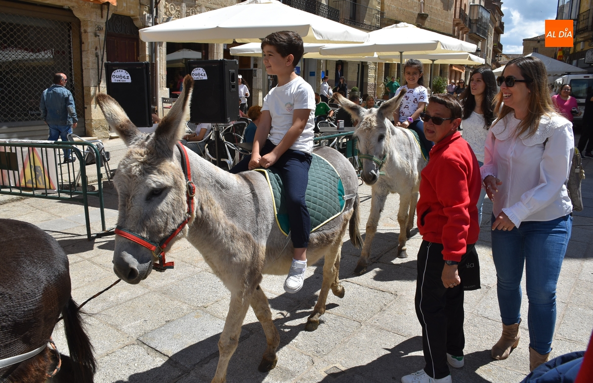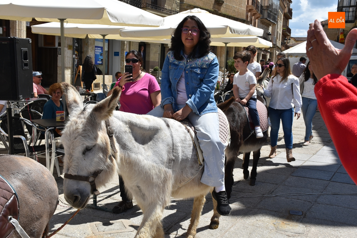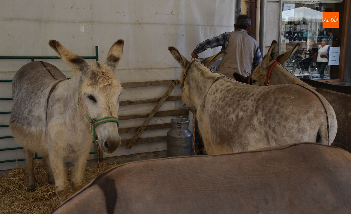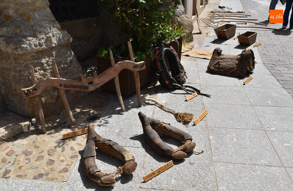 Ya en la Rúa del Sol se pudieron encontrar más animales, los de Burritos Las Cogotas (encima de los cuales se pudieron subir los niños que quisieron) y los de la Asociación Ornitológica Mirobrigense, bajo una carpa. Como complemento, había varios aperos de campo y de labranza antiguos (cada uno de ellos con su correspondiente identificación), y un par de remolques agrícolas.