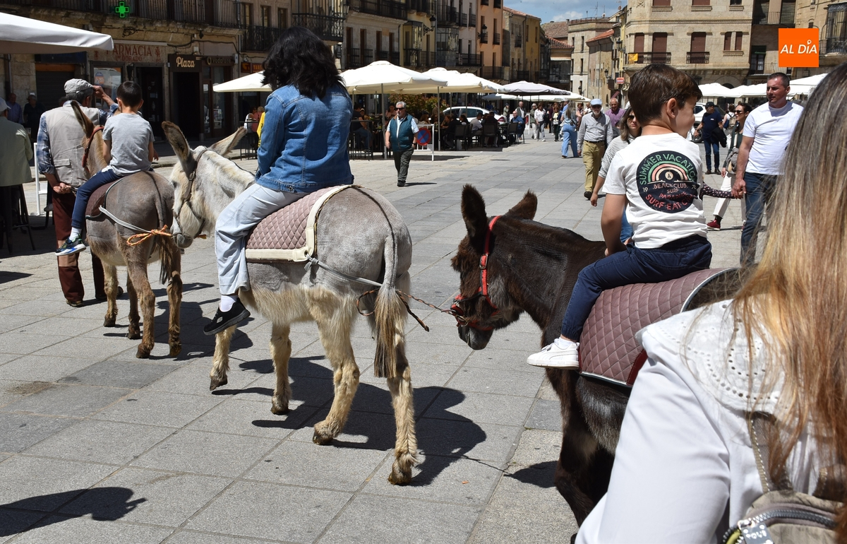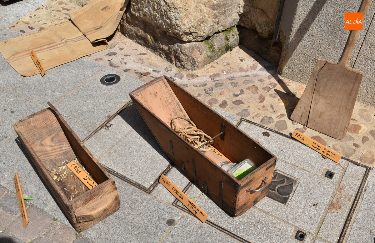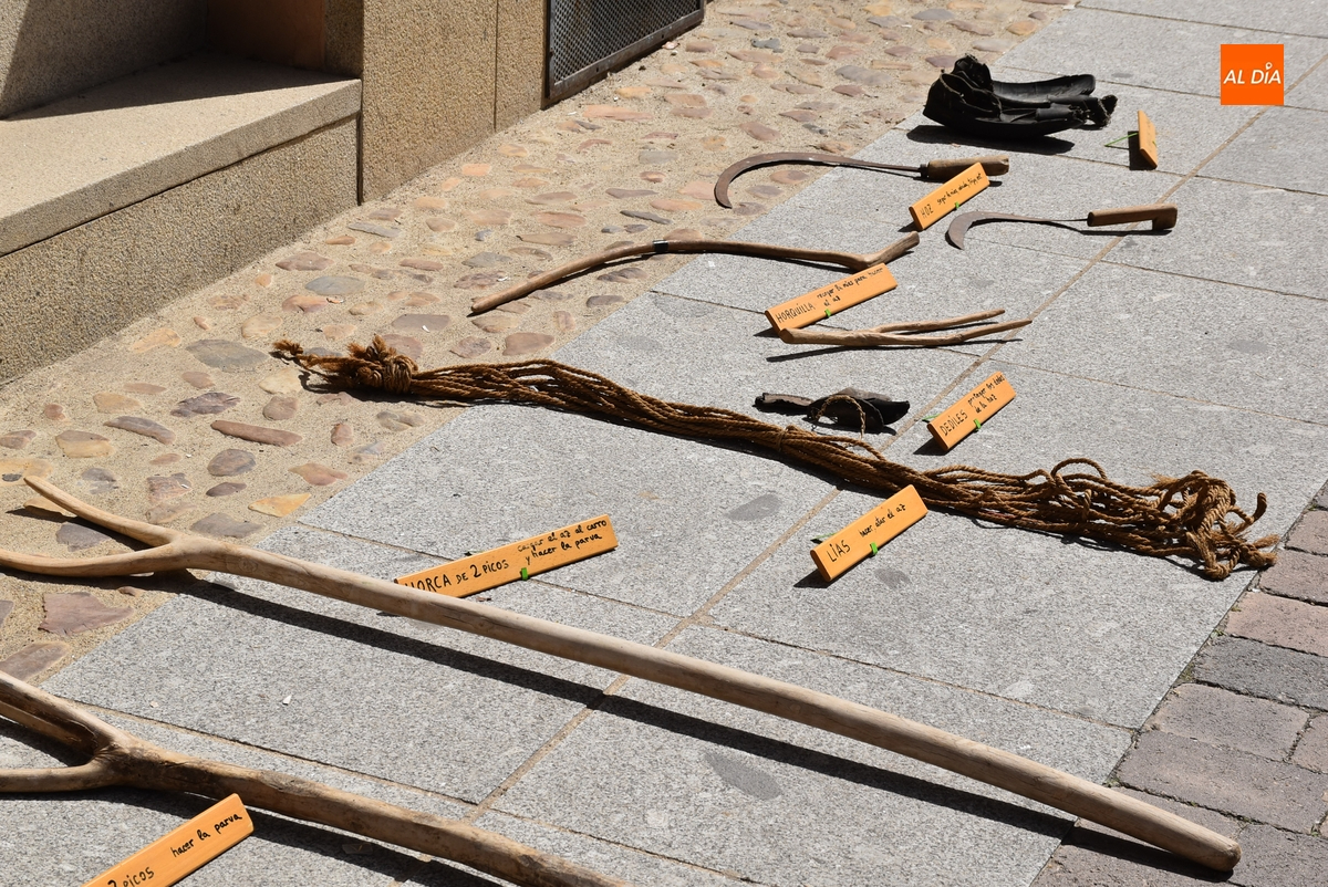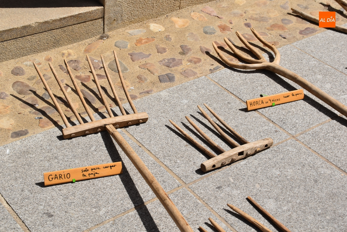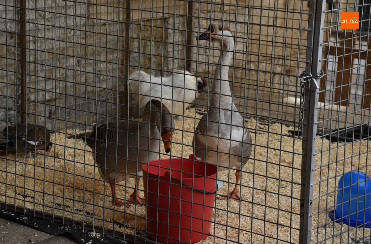 Ya en la Rúa del Sol se pudieron encontrar más animales, los de Burritos Las Cogotas (encima de los cuales se pudieron subir los niños que quisieron) y los de la Asociación Ornitológica Mirobrigense, bajo una carpa. Como complemento, había varios aperos de campo y de labranza antiguos (cada uno de ellos con su correspondiente identificación), y un par de remolques agrícolas.