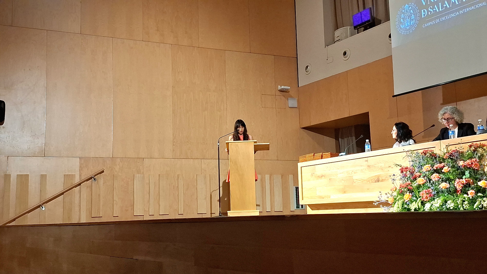 La Facultad de Ciencias Agrarias y Ambientales organizó el solemne acto de imposición de becas para los alumnos que concluyen sus estudios en el presente curso académico 2024-2025. La ceremonia, que se desarrolló en dos turnos para acoger a todos los protagonistas, comenzó con las palabras de bienvenida de la Decana, la Dra. María Ángeles Gómez Sánchez.