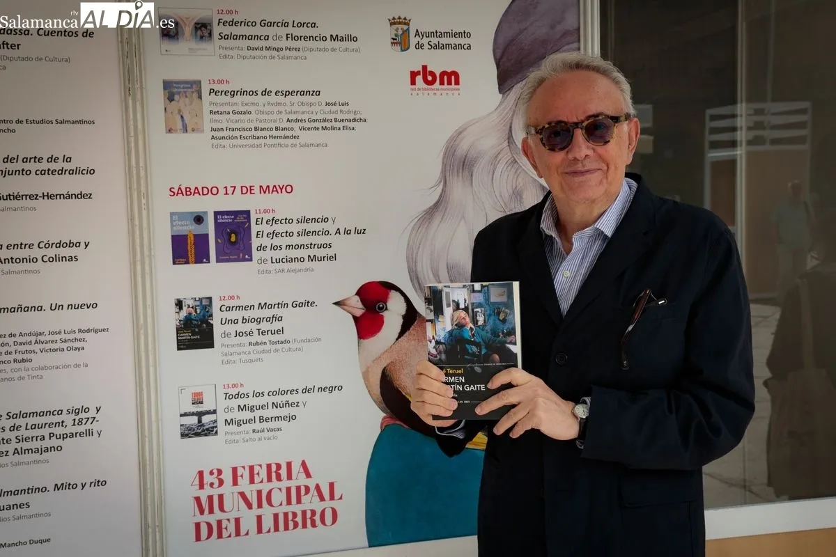 Hay aplausos que no se olvidan en esta Feria en la que ya sale el sol después de tan hermosa lluvia: el que le dedicó el pueblo de Cerralbo a su escritor, el que no podía pararse al pintor Florencio Maíllo, y el sábado, al biógrafo de Carmen Martín Gaite, a quien dedicamos esta Feria. Llega José Teruel acompañado de Ignacio Gallego y de Rubén Tostado, de la Fundación Ciudad de Cultura y Saberes. Y es Tostado quien presenta al profesor universitario, al investigador y al poeta, que fue Premio Ciudad de Salamanca de Poesía en el 2021 y del que lee un fragmento especialmente sentido. Para Tostado, la obra de Teruel llega para llenar un vacío y se ha convertido en una obra de referencia, ganadora del Premio Comillas.