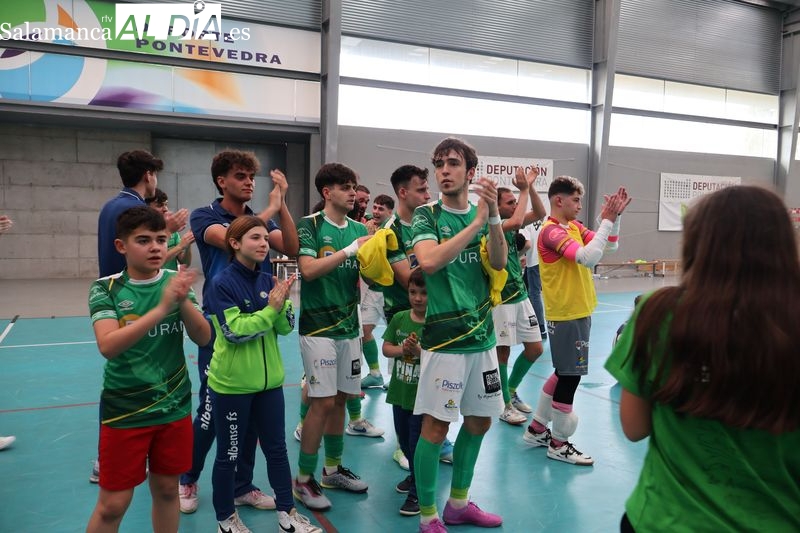 En Pontevedra se vivió mucho más que un partido de fútbol sala. El Piensos Durán Albense selló su pase a la segunda ronda del play-off de ascenso a Segunda División con un empate a tres en la pista del Stellae Leis Pontevedra, suficiente tras el 3-2 conseguido en la ida. Pero lo que ocurrió después del pitido final quedará grabado para siempre en la memoria colectiva del club y de los cerca de 50 aficionados que viajaron hasta el Pabellón de Marcón. Lágrimas, abrazos, rostros empapados de emoción. Afición y equipo fundidos en un solo corazón verde, celebrando algo más que una victoria: celebrando una historia compartida que sigue escribiéndose.