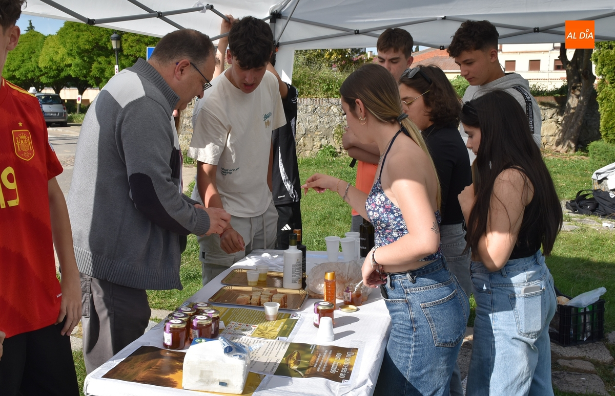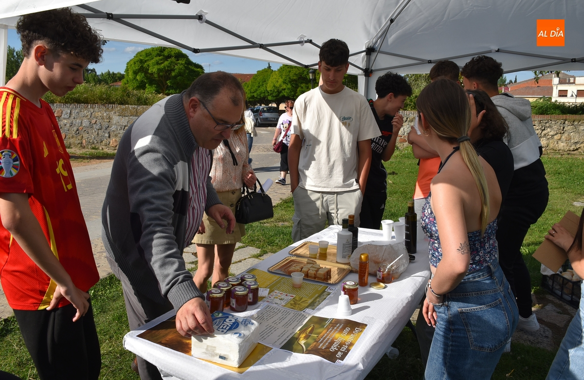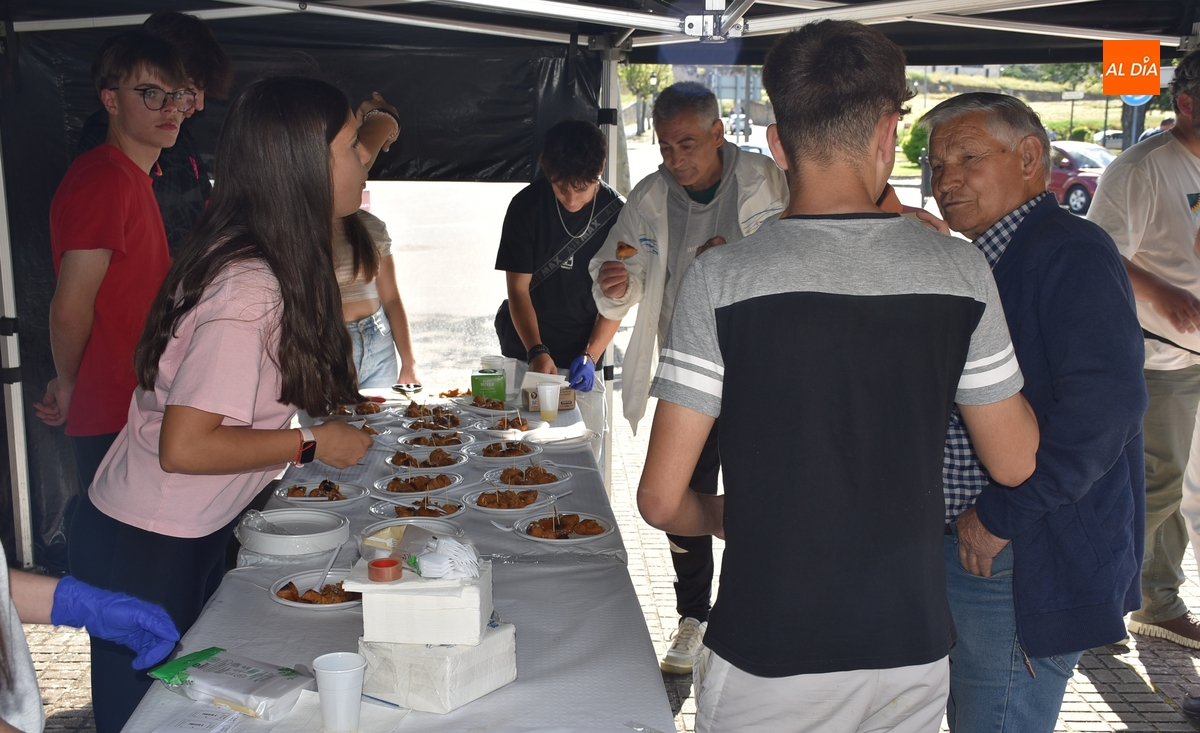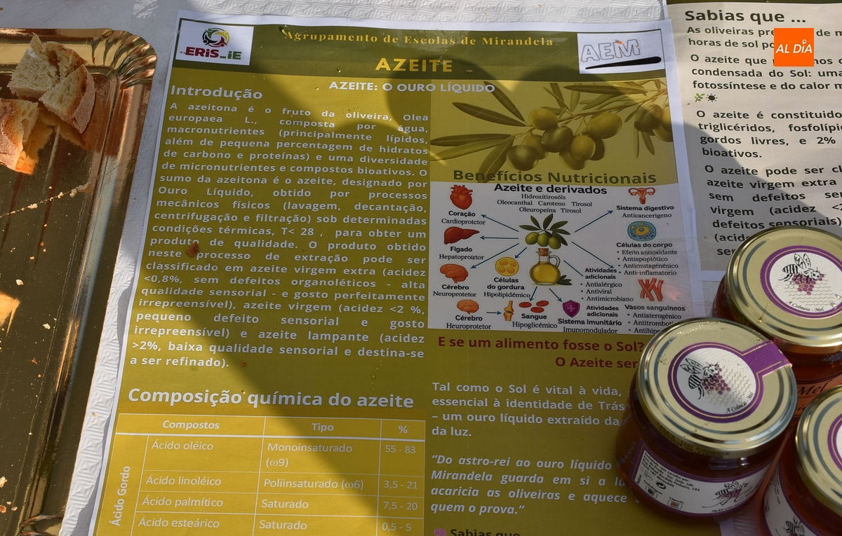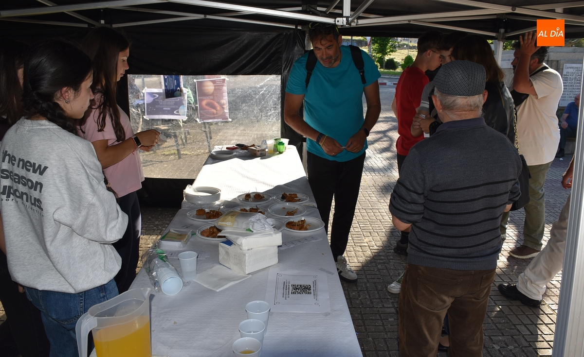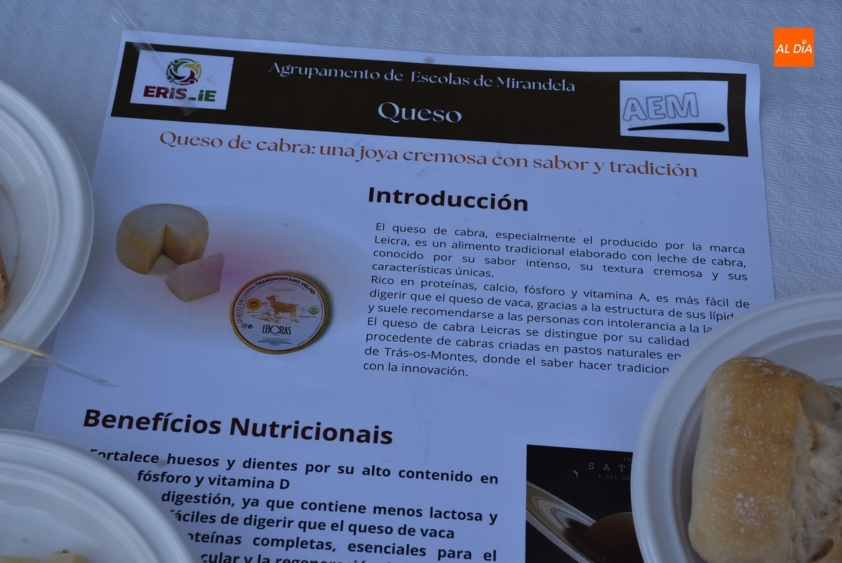 La alheira también fue probada por el director del CFIE de Ciudad Rodrigo, Luis María Álvarez, y las ediles del Ayuntamiento Paola Martín Muñoz, Joana Veloso y Carmen Lorenzo, que recorrieron varios de los stands. De ese punto inicial se podía pasar al situado junto al planeta Mercurio, donde se ofrecía untar una especie de bizcocho en miel y aceite (en cada stand había alumnos tanto portugueses como españoles).