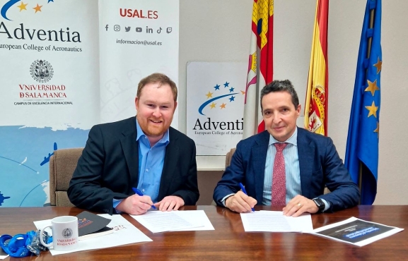 Adventia, la Escuela de Pilotos de la Universidad de Salamanca, ha sellado una alianza estratégica con AFA (Airline Flight Academy), el centro de formación aprobado por Ryanair, que facilitará el acceso directo de sus alumnos a la plantilla de la aerolínea irlandesa.