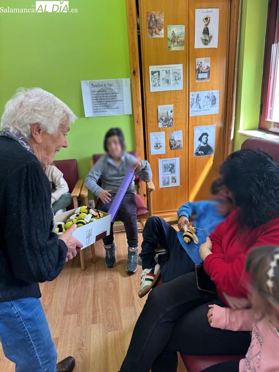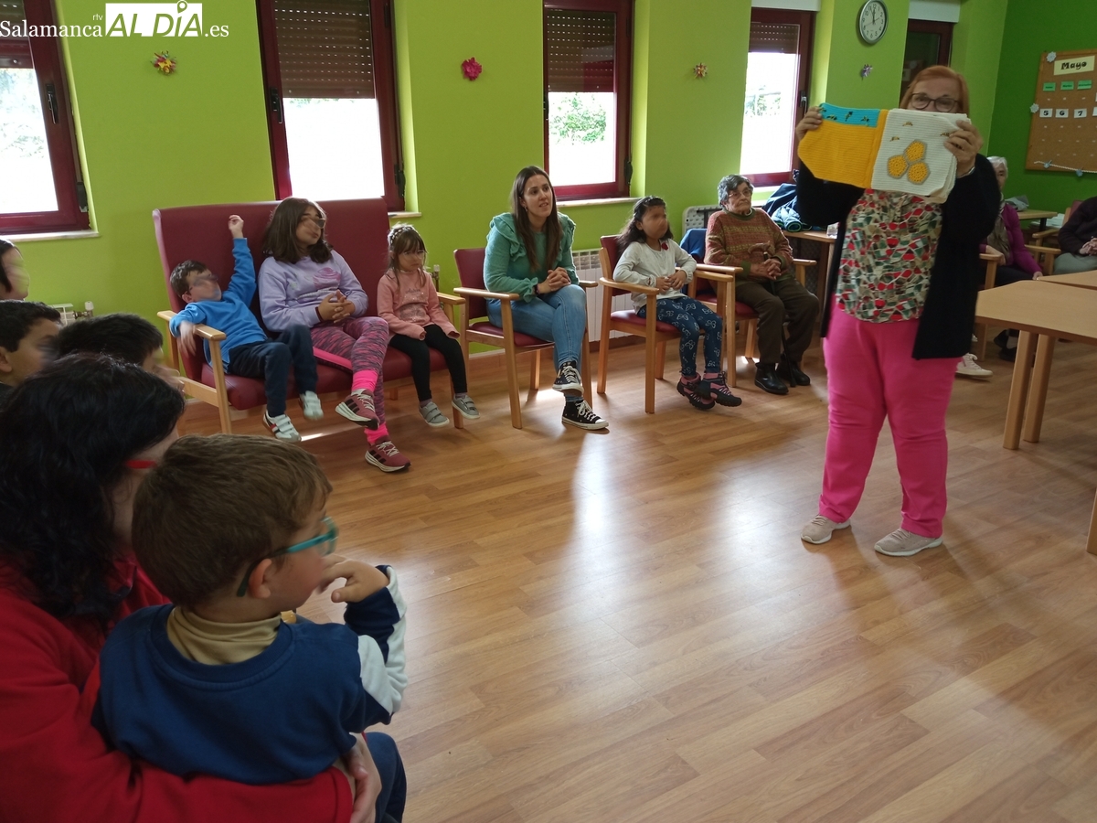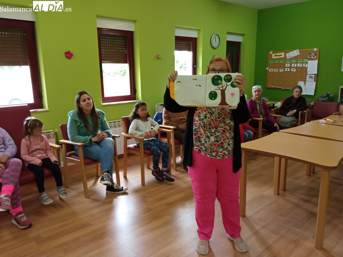 En este sentido, el pasado 13 de mayo tuvo lugar un encuentro que unió en una actividad común a las personas mayores que participan en los talleres del Centro de día de Monleras con los niños y niñas del CRA Bajo Tormes. El cuento tradicional, que desde tiempo inmemorial ha sido vehículo de transmisión de mayor a menor de conocimientos, experiencias y valores compartidos en la comunidad, sirvió en esta ocasión como hilo conductor del encuentro. En esta ocasión, los niños y niñas contaron a los mayores cuentos recogidos de la tradición popular, escenificándolos con gracia como una forma de devolverles el afecto recibido. Las personas mayores, por su parte, regalaron al CRA un hermoso cuento “tejido” con lana, donde se cuenta la historia de la abeja Rayita y su labor para conservar la vida de la naturaleza, y obsequiaron a cada uno de los niños y niñas asistentes con una abejita tejida con amor. Tejer para aprender es un proyecto de la Asociación de Labores Solidarias de La IAIA con la que colabora el centro de día de Monleras: consiste en elaborar un cuento-lanero con fines educativos para después compartir una sesión de cuentacuentos con los centros escolares, educativos y culturales.