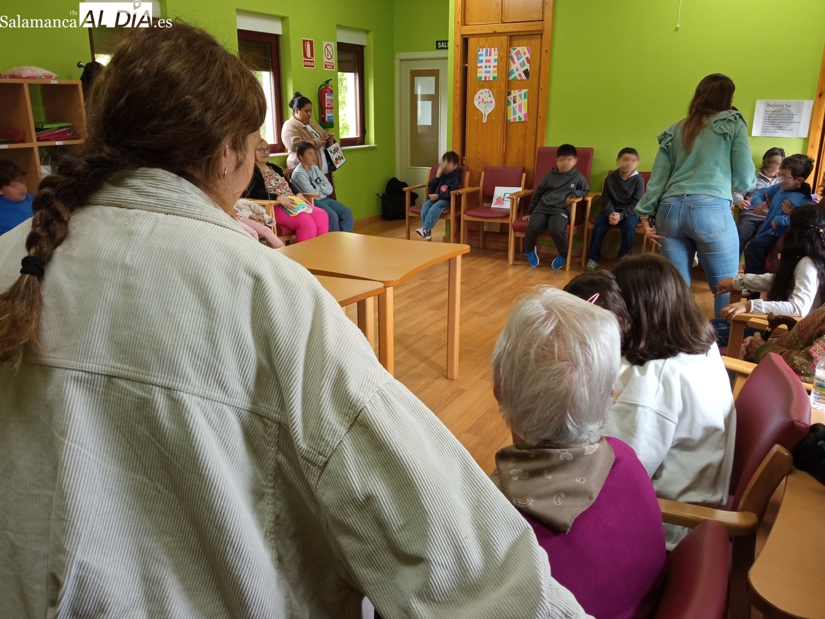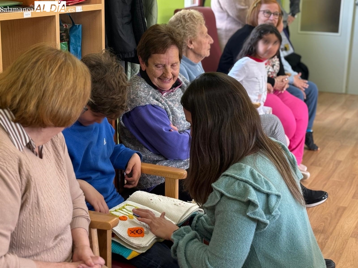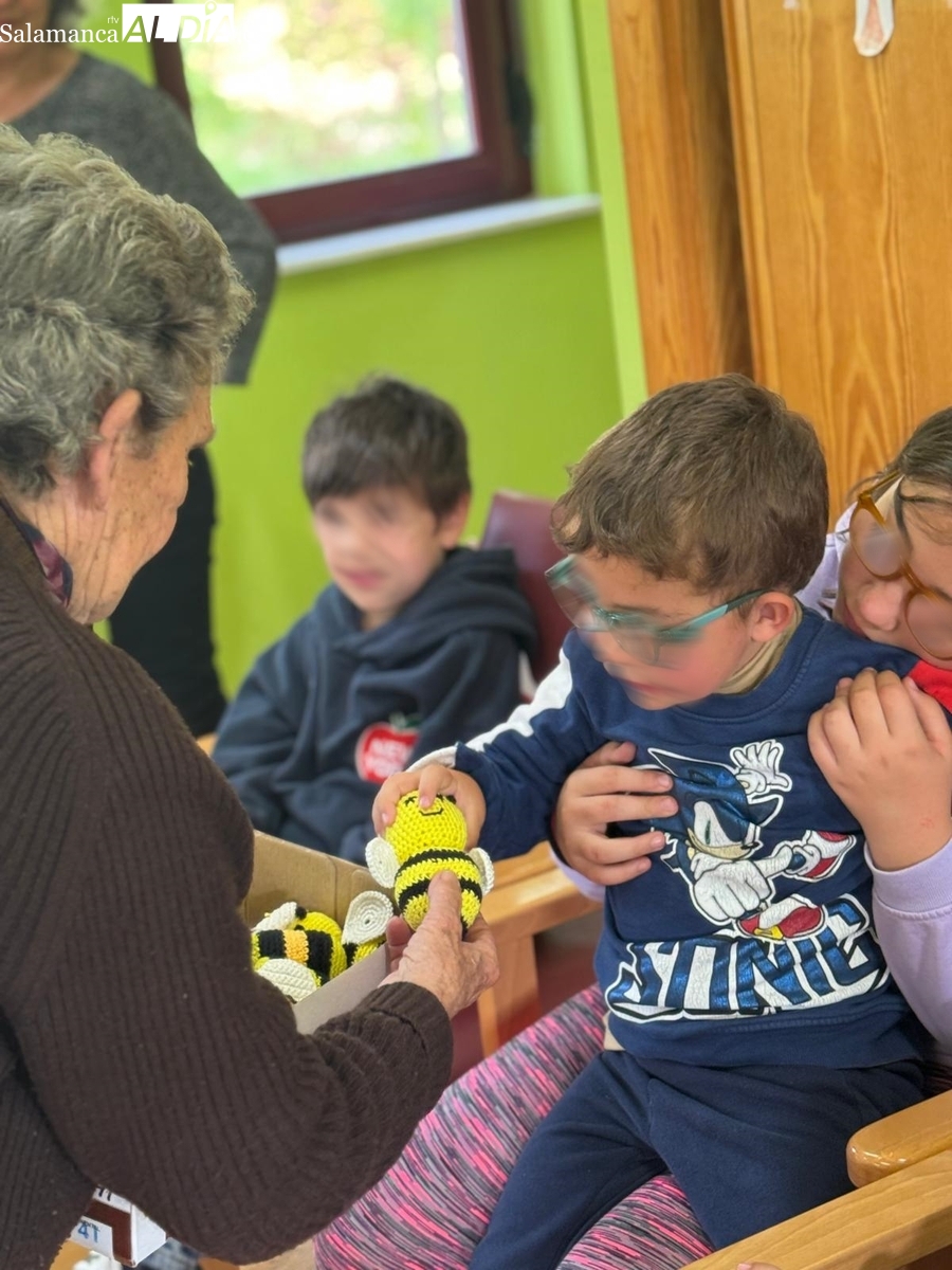 En este sentido, el pasado 13 de mayo tuvo lugar un encuentro que unió en una actividad común a las personas mayores que participan en los talleres del Centro de día de Monleras con los niños y niñas del CRA Bajo Tormes. El cuento tradicional, que desde tiempo inmemorial ha sido vehículo de transmisión de mayor a menor de conocimientos, experiencias y valores compartidos en la comunidad, sirvió en esta ocasión como hilo conductor del encuentro. En esta ocasión, los niños y niñas contaron a los mayores cuentos recogidos de la tradición popular, escenificándolos con gracia como una forma de devolverles el afecto recibido. Las personas mayores, por su parte, regalaron al CRA un hermoso cuento “tejido” con lana, donde se cuenta la historia de la abeja Rayita y su labor para conservar la vida de la naturaleza, y obsequiaron a cada uno de los niños y niñas asistentes con una abejita tejida con amor. Tejer para aprender es un proyecto de la Asociación de Labores Solidarias de La IAIA con la que colabora el centro de día de Monleras: consiste en elaborar un cuento-lanero con fines educativos para después compartir una sesión de cuentacuentos con los centros escolares, educativos y culturales.