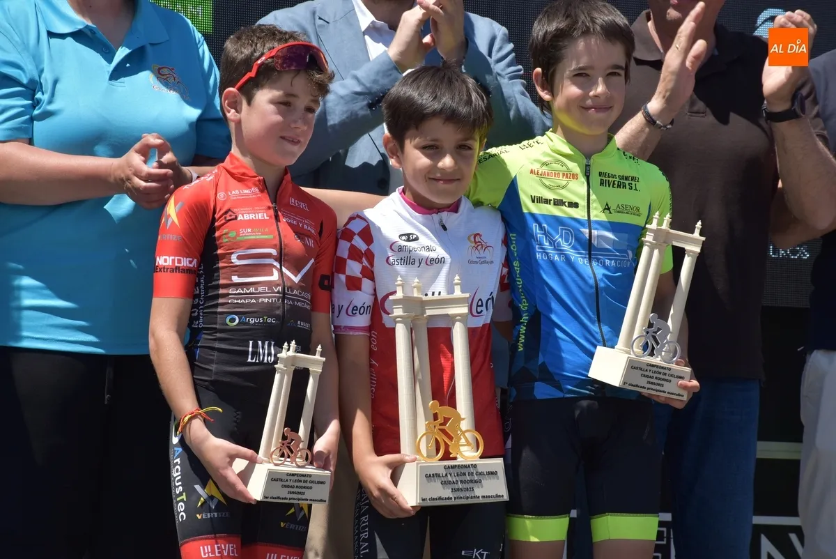 La mañana de competición sobre dos ruedas en Ciudad Rodrigo dejó un total de 8 nuevos campeones de Castilla y León, que como cierre del evento recibieron los maillots que les van a acreditar como tales a lo largo de todo el año. Entre esos 8 nuevos campeones se encuentra un mirobrigense, Diego Marcos (perteneciente al Caja Rural de Salamanca-EKT), que se hizo con la victoria en la categoría Principiante.