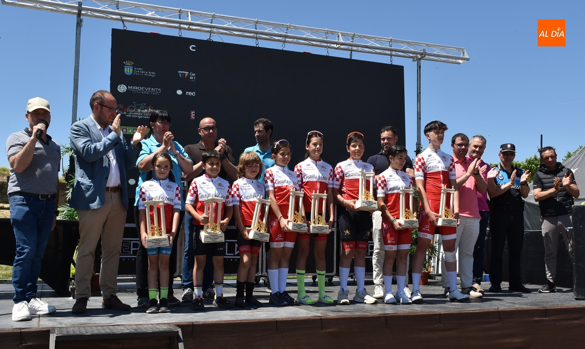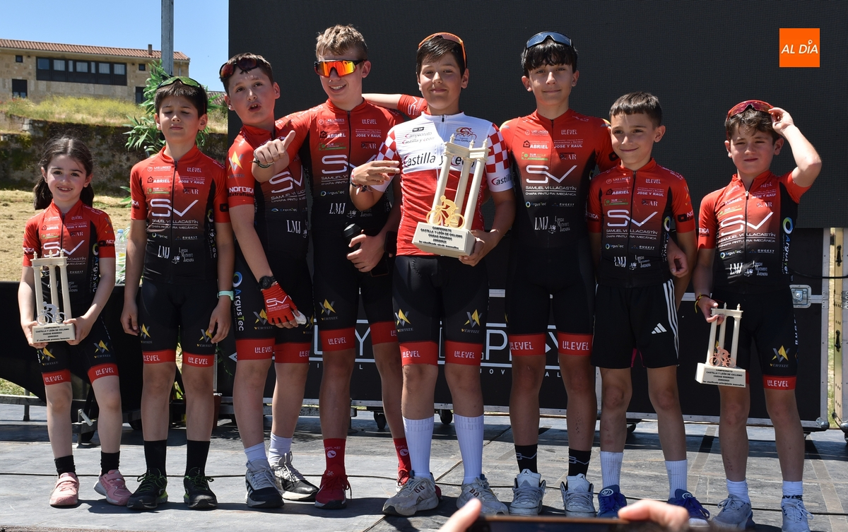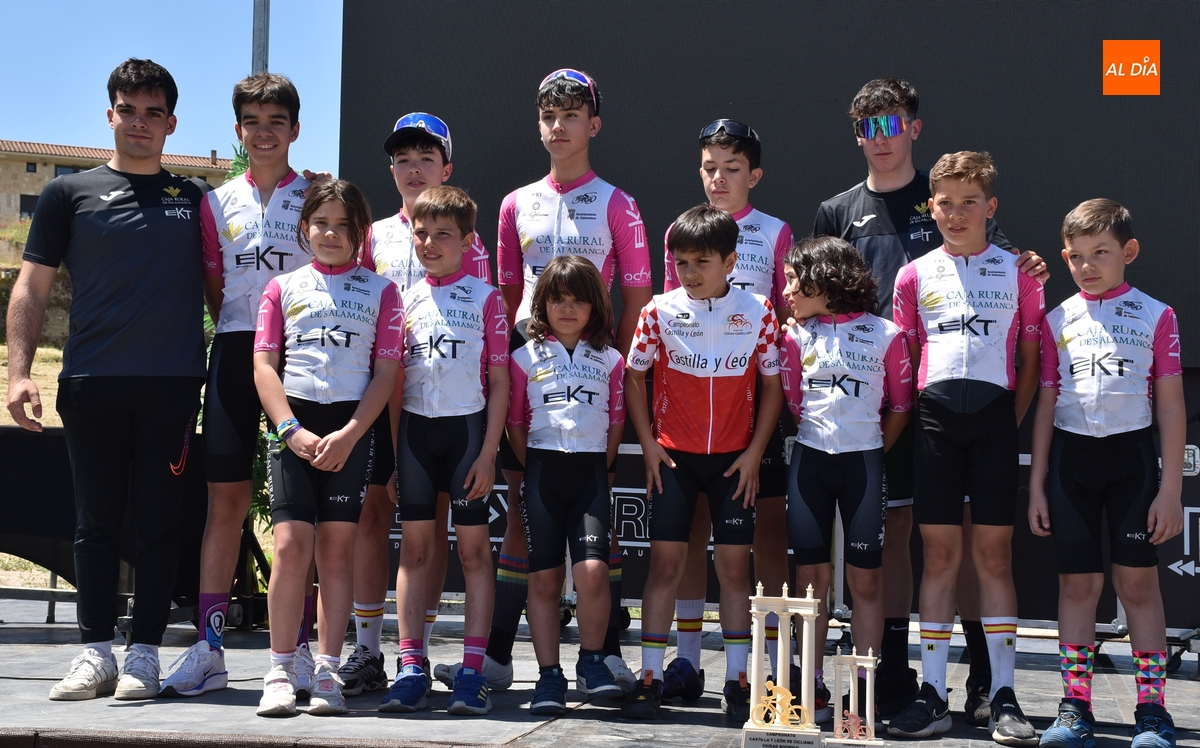 Finalizada la entrega de los maillots de campeones de Castilla y León y de los correspondientes trofeos (este año eran reproducciones de las III Columnas con ciclistas a sus pies), hubo tiempo para varias fotos de familia en el escenario, por ejemplo de las escuelas participantes más numerosas.