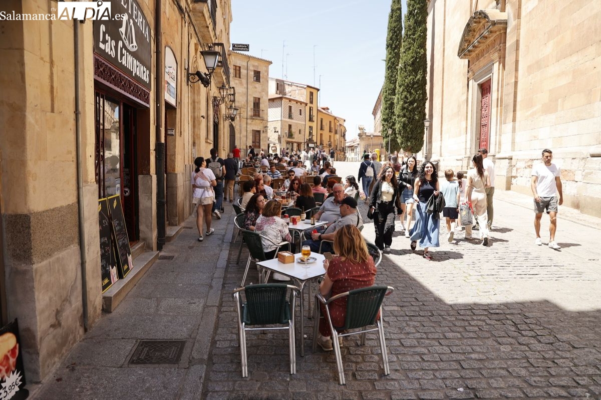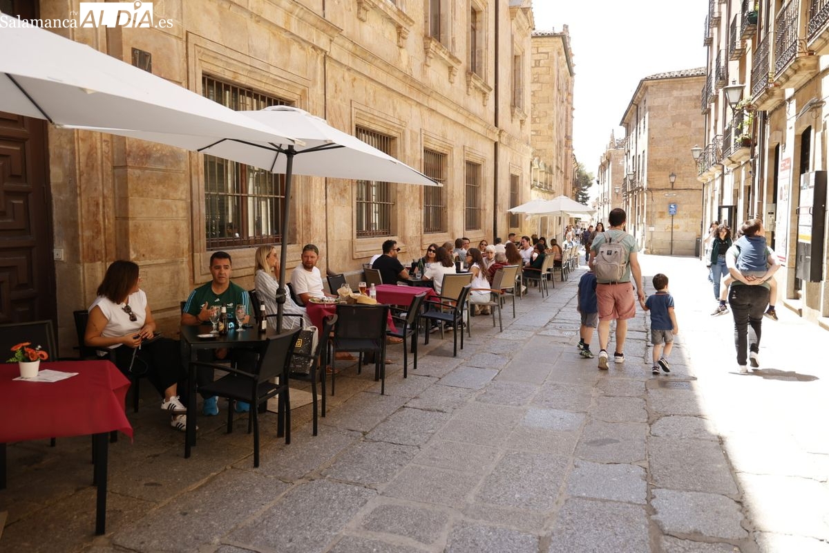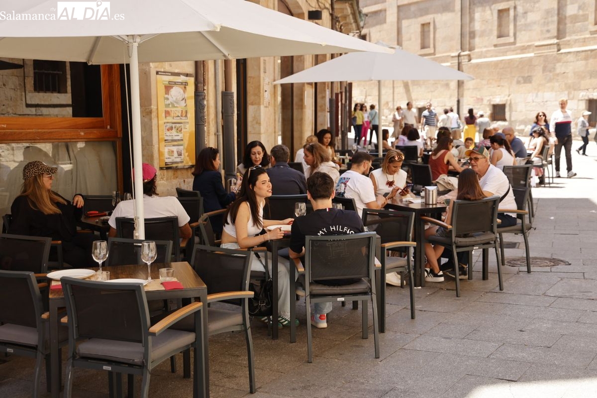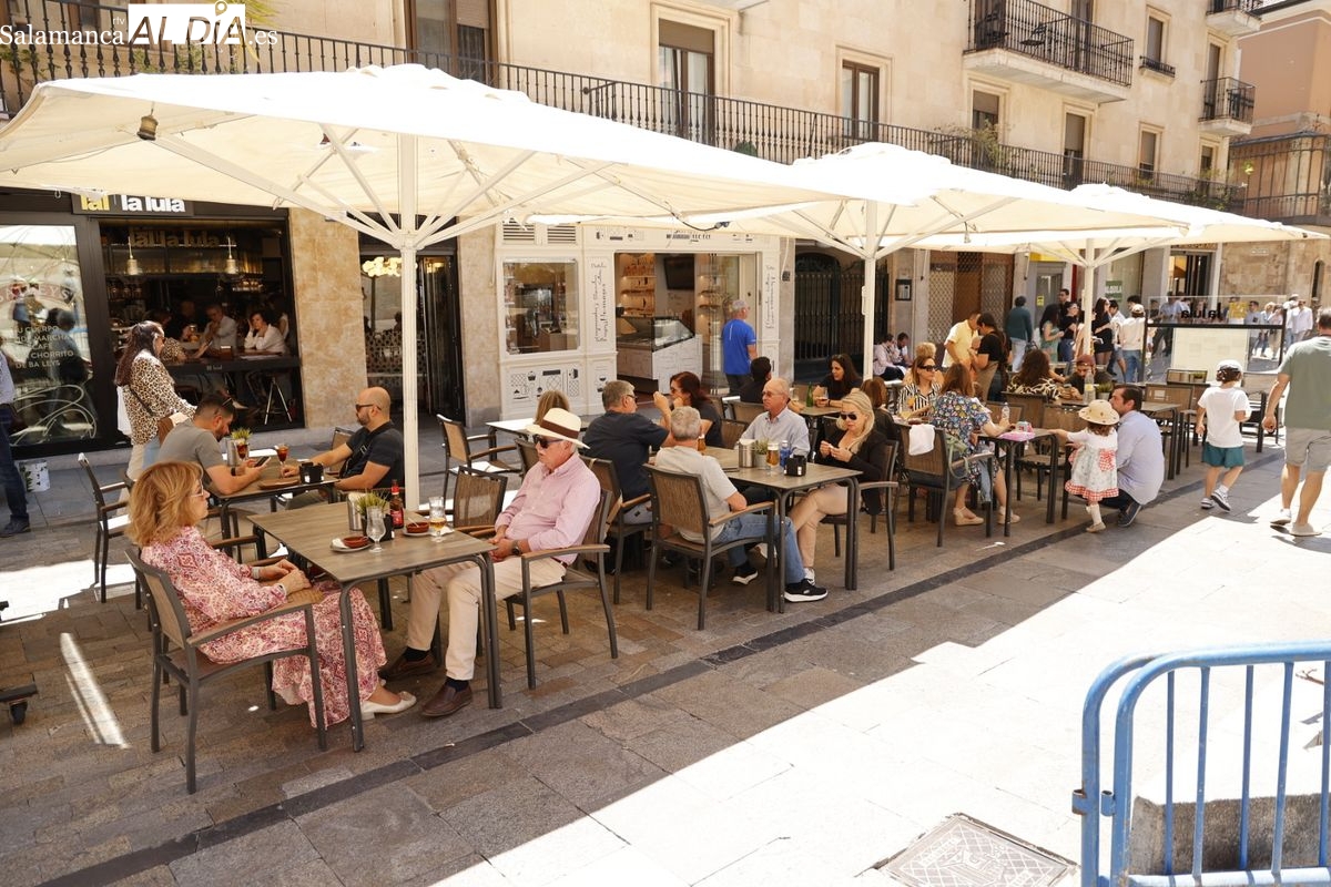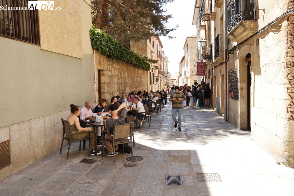 El sol radiante que ha acompañado a Salamanca durante toda la jornada de este domingo ha sido el mejor aliado para que el centro de la ciudad presentara un aspecto lleno de actividad. Desde primeras horas de la mañana, tanto salmantinos como numerosos turistas han tomado las calles, especialmente las del casco histórico, para disfrutar de un día espléndido. Uno de los puntos neurálgicos de esta jornada dominical han sido, sin duda, las terrazas de bares y restaurantes, prácticamente llenas desde la hora del aperitivo, así como la zona monumental.
