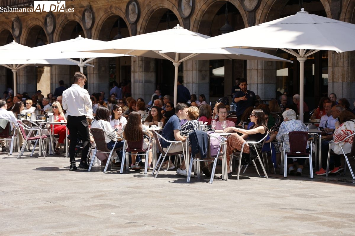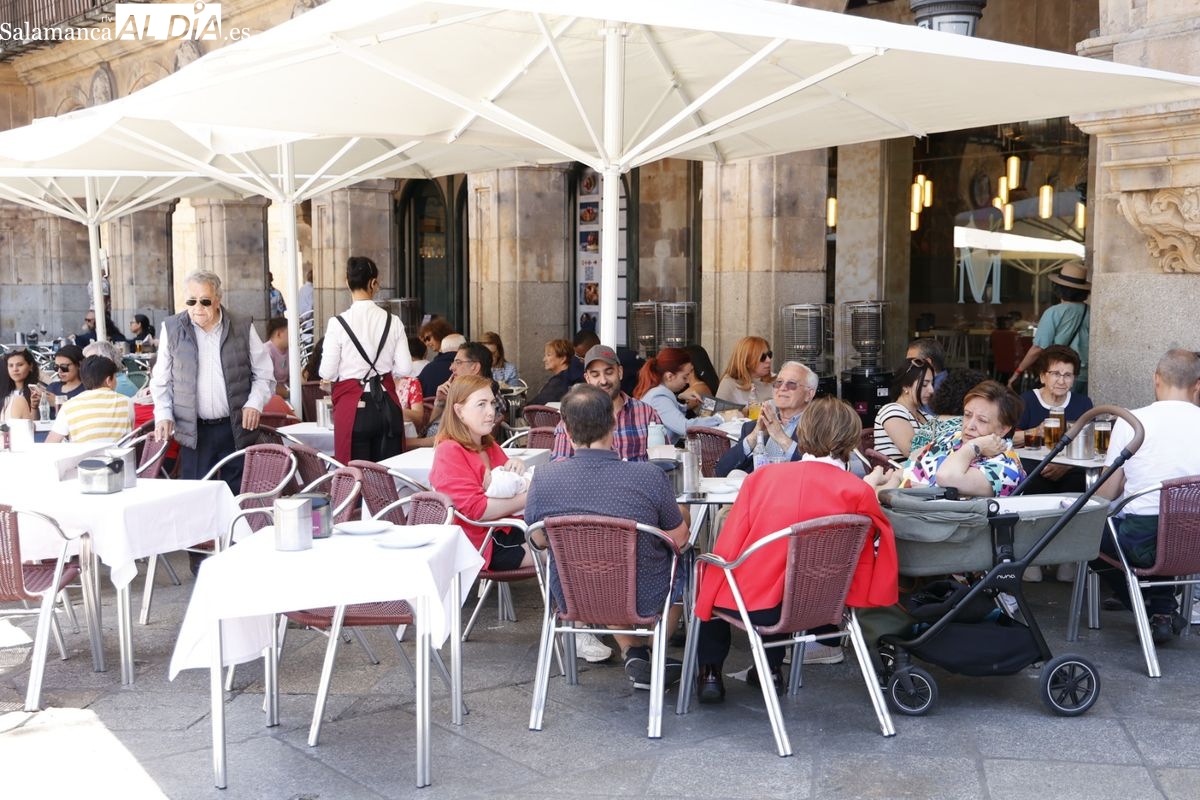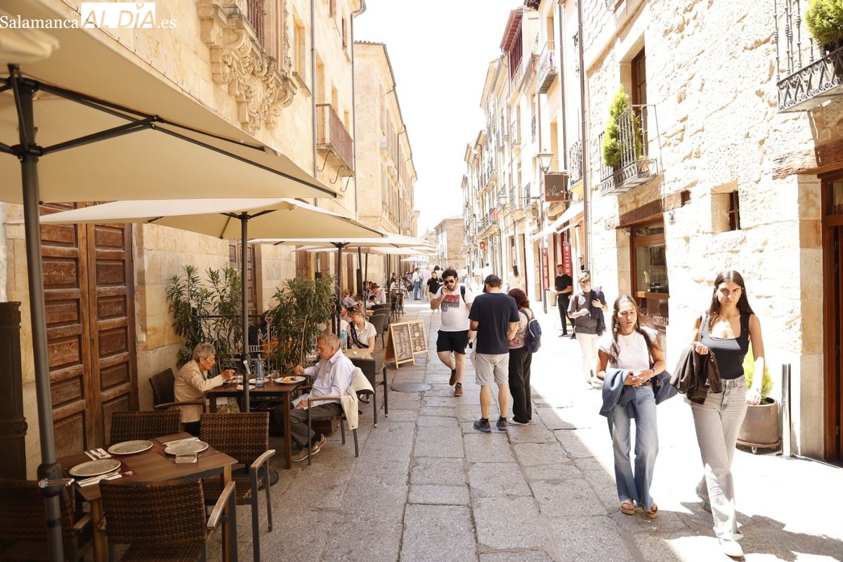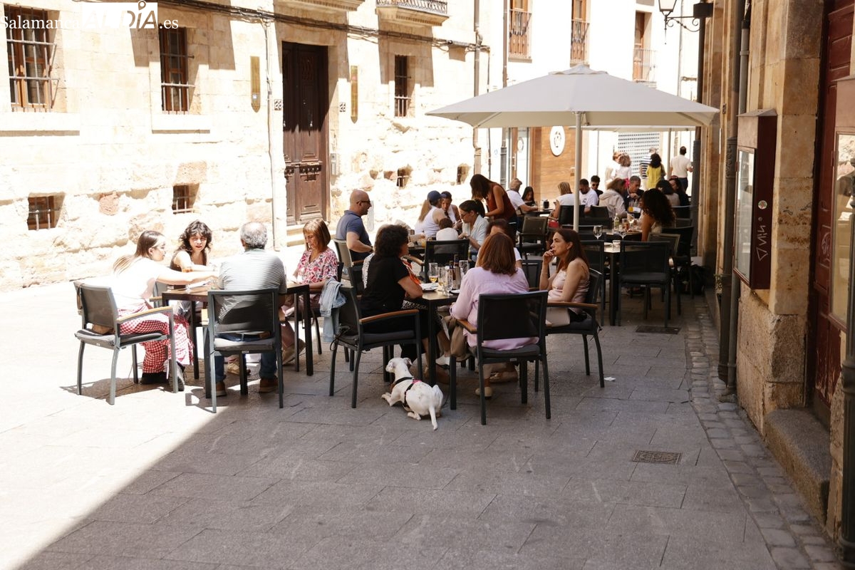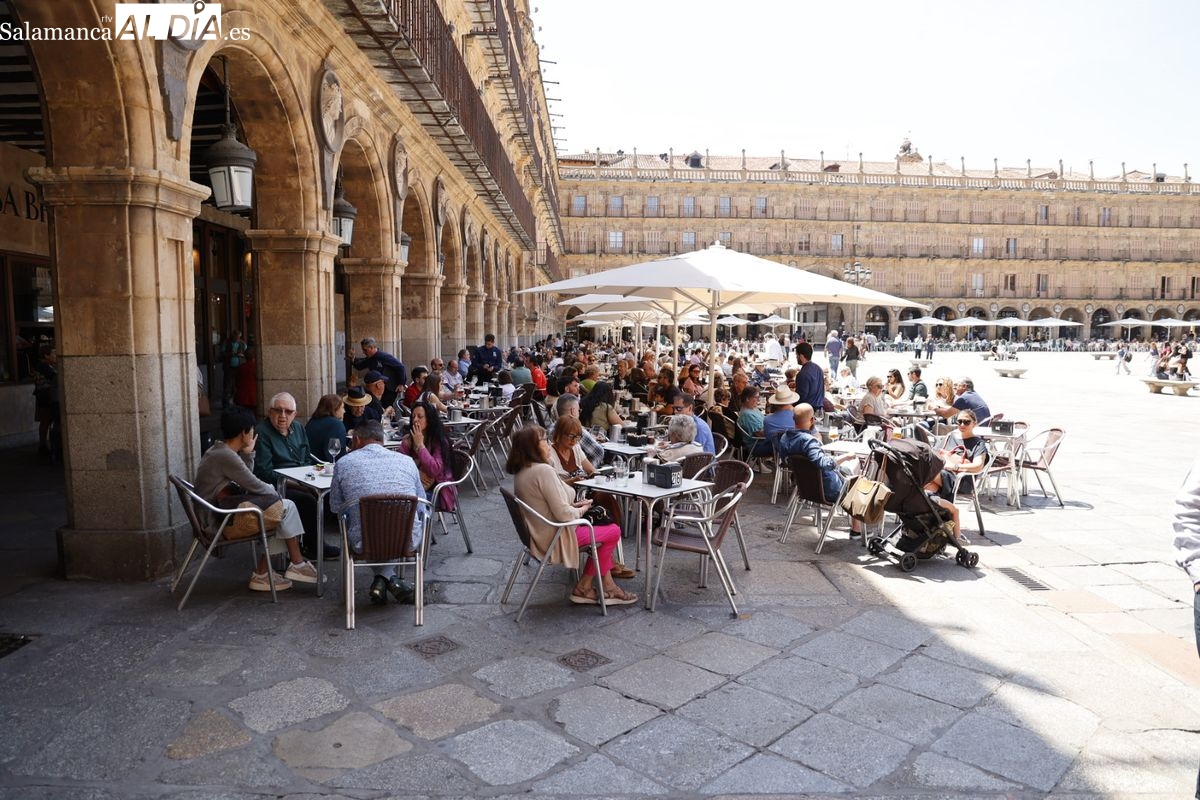 El sol radiante que ha acompañado a Salamanca durante toda la jornada de este domingo ha sido el mejor aliado para que el centro de la ciudad presentara un aspecto lleno de actividad. Desde primeras horas de la mañana, tanto salmantinos como numerosos turistas han tomado las calles, especialmente las del casco histórico, para disfrutar de un día espléndido. Uno de los puntos neurálgicos de esta jornada dominical han sido, sin duda, las terrazas de bares y restaurantes, prácticamente llenas desde la hora del aperitivo, así como la zona monumental.
