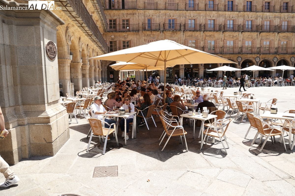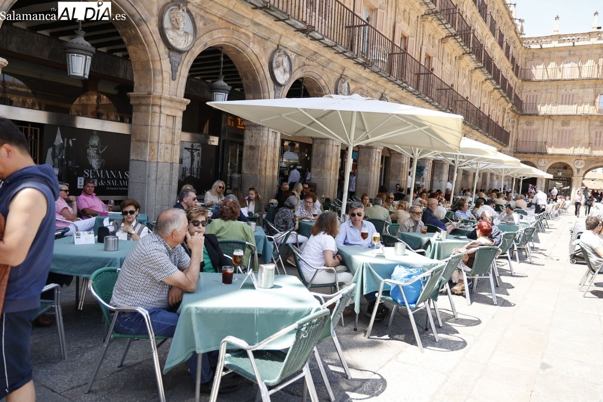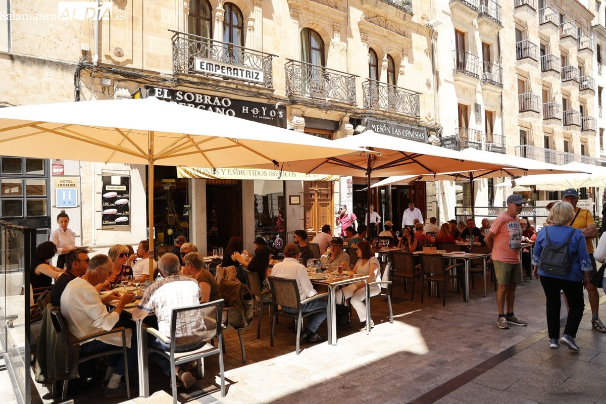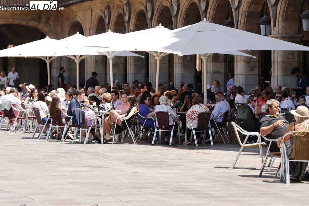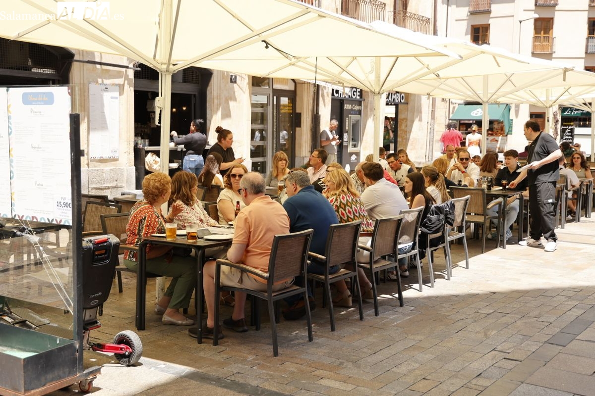 El sol radiante que ha acompañado a Salamanca durante toda la jornada de este domingo ha sido el mejor aliado para que el centro de la ciudad presentara un aspecto lleno de actividad. Desde primeras horas de la mañana, tanto salmantinos como numerosos turistas han tomado las calles, especialmente las del casco histórico, para disfrutar de un día espléndido. Uno de los puntos neurálgicos de esta jornada dominical han sido, sin duda, las terrazas de bares y restaurantes, prácticamente llenas desde la hora del aperitivo, así como la zona monumental.
