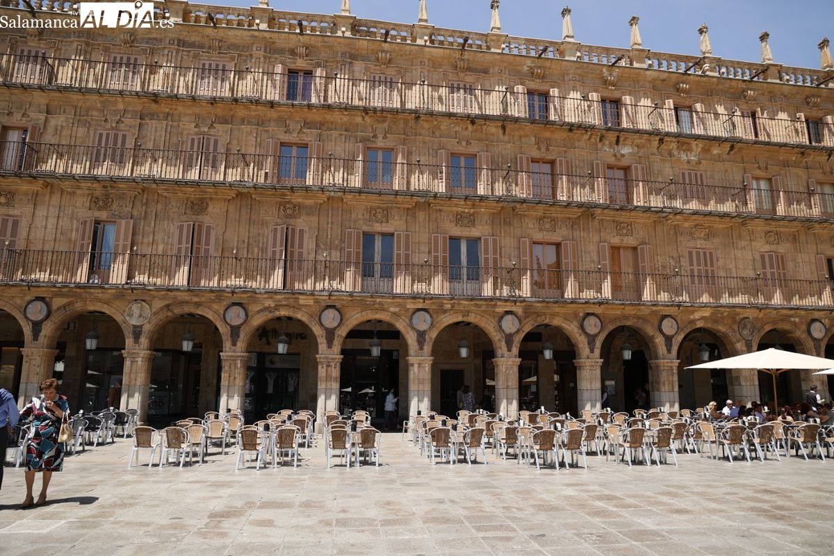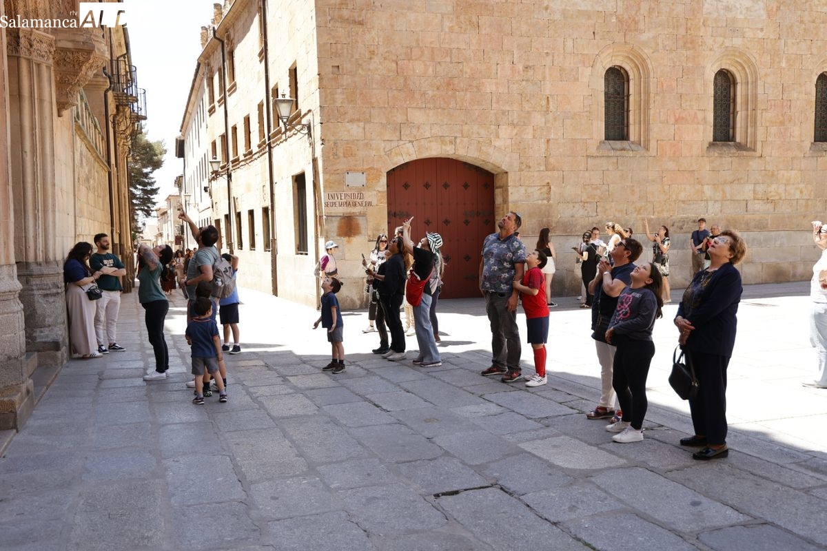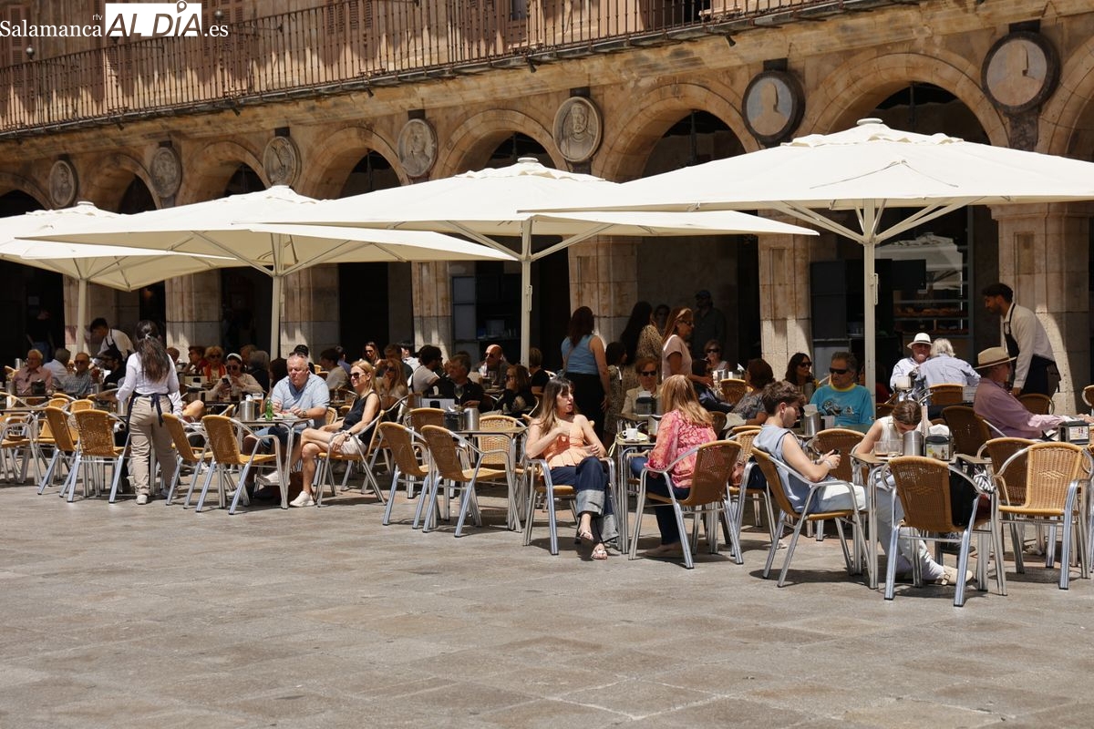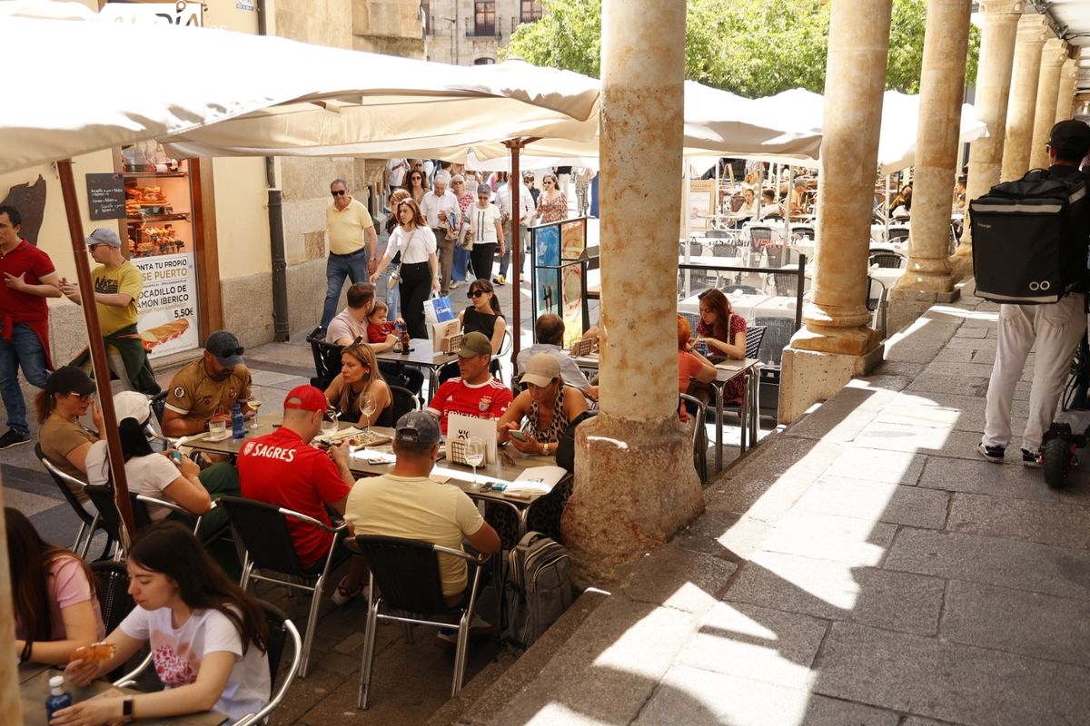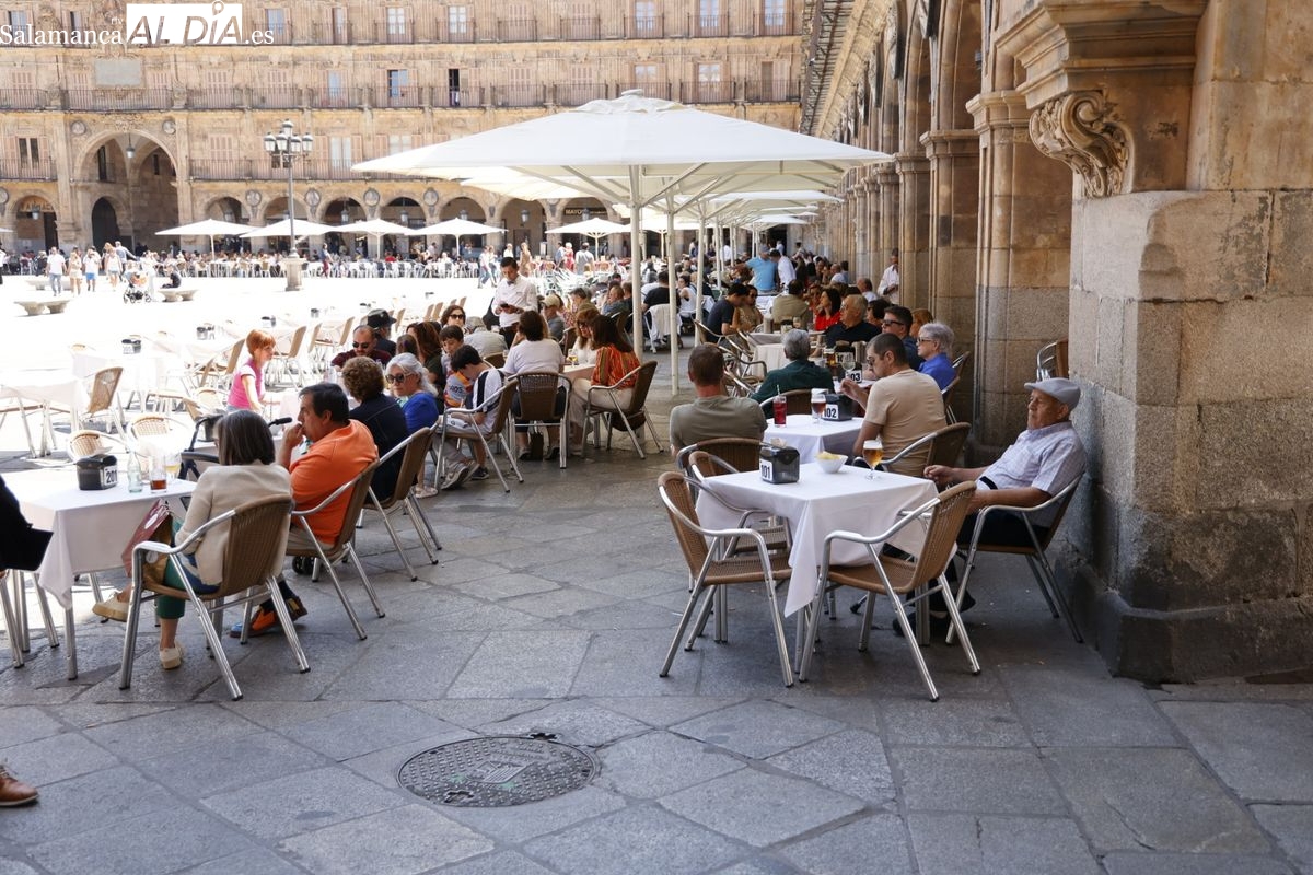 El sol radiante que ha acompañado a Salamanca durante toda la jornada de este domingo ha sido el mejor aliado para que el centro de la ciudad presentara un aspecto lleno de actividad. Desde primeras horas de la mañana, tanto salmantinos como numerosos turistas han tomado las calles, especialmente las del casco histórico, para disfrutar de un día espléndido. Uno de los puntos neurálgicos de esta jornada dominical han sido, sin duda, las terrazas de bares y restaurantes, prácticamente llenas desde la hora del aperitivo, así como la zona monumental.