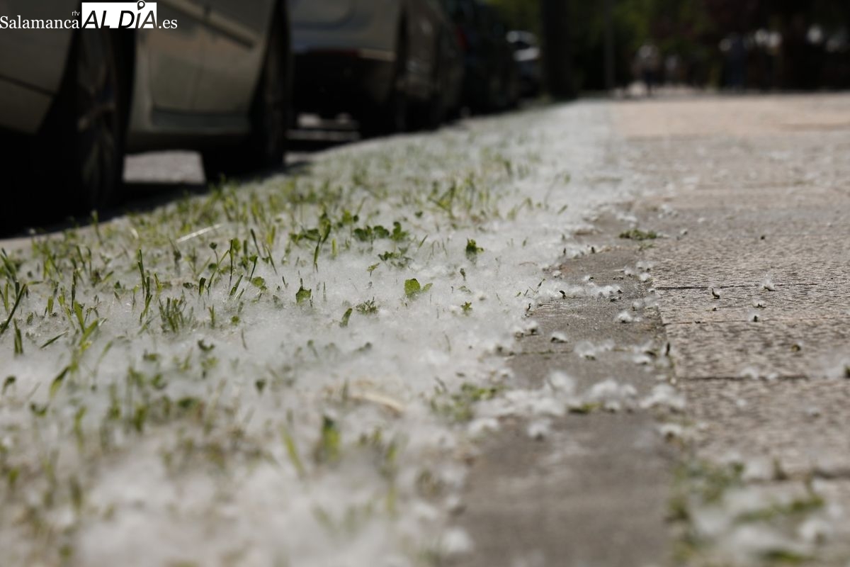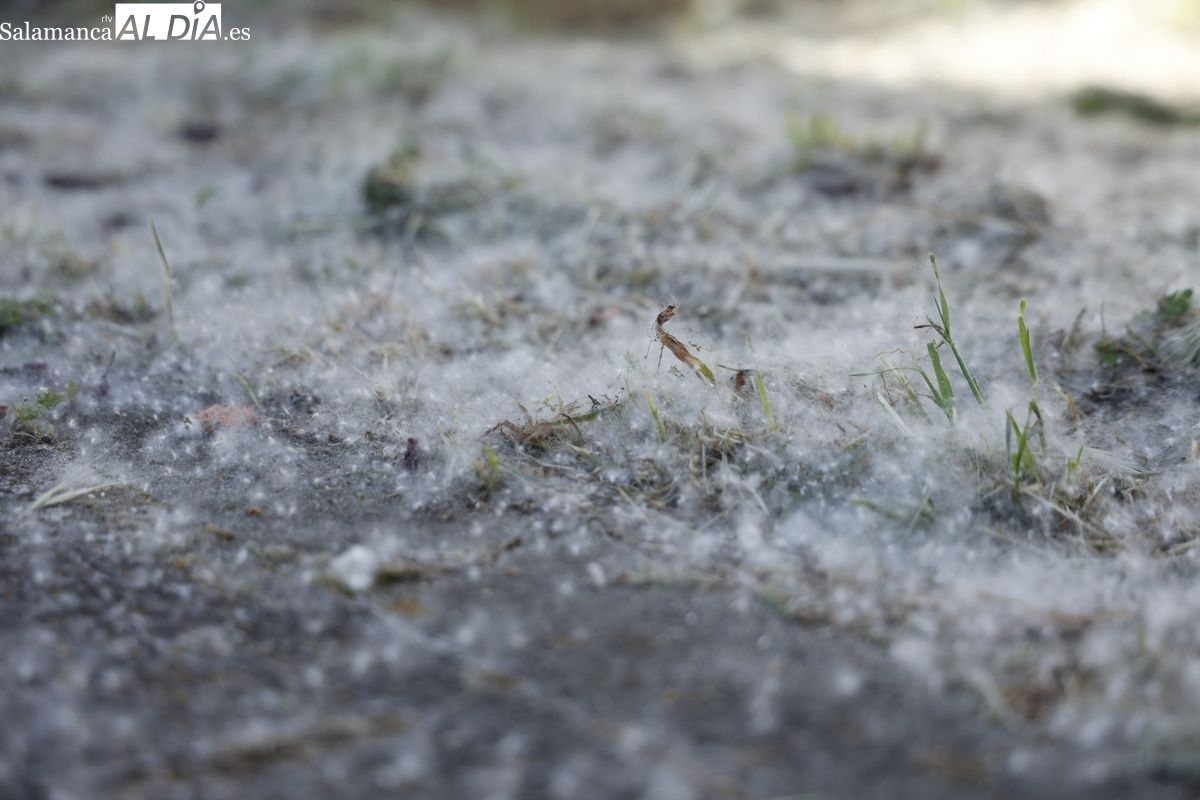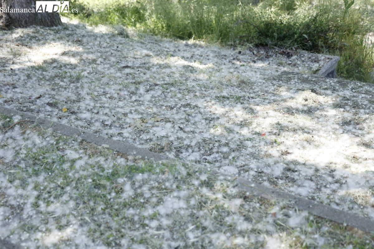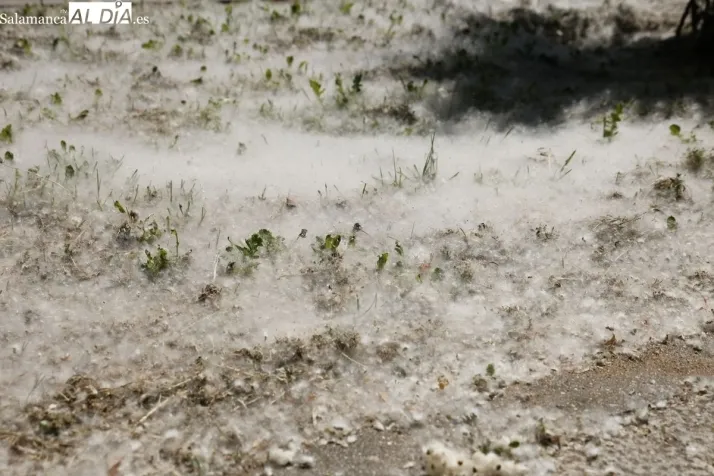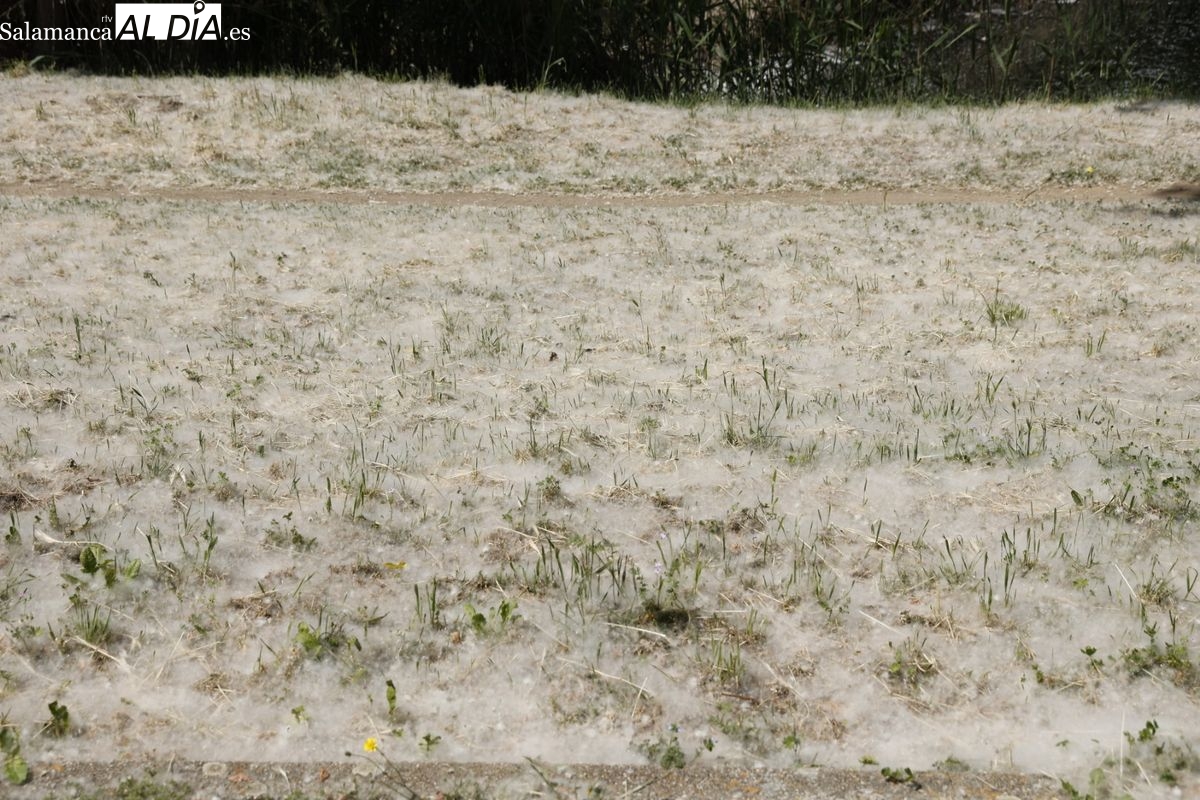 Las imágenes de esta zona salmantina de esparcimiento son elocuentes: partículas blanquecinas flotando densamente en el aire y cubriendo superficies, un fenómeno que ha sido descrito por varios testigos como si "estuviera nevando polen".