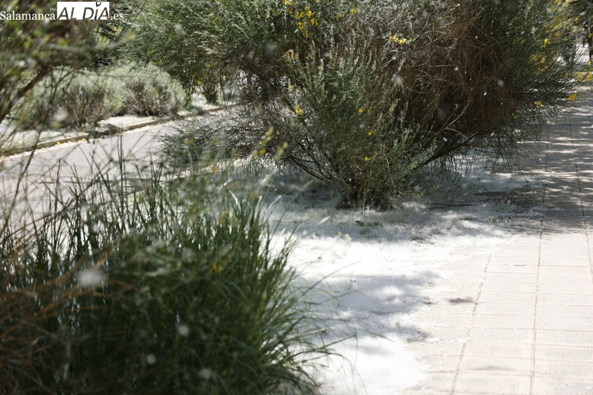 Este domingo, La Aldehuela tiene una estampa inusual que ha captado la atención y generado el malestar de los numerosos salmantinos que han acudido a disfrutar del buen tiempo. Una intensa concentración de polen se ha apoderado del ambiente, creando una estampa similar a una 'nevada' que ha generado sorpresa y numerosas molestias entre los ciudadanos, especialmente aquellos con alergias respiratorias.