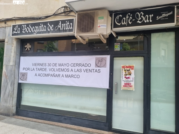 Una de estas llamativas iniciativas es la del bar 'La Bodeguita de Anita', en la calle Los Ovalle, donde han colocado un cartel de grandes dimensiones en el que se puede leer: "Viernes 30 de mayo cerrado por la tarde. Volvemos a Las Ventas a acompañar a Marco". Sin duda, Marco Pérez estará arropado por un buen número de salmantinos que como demuestra esta imagen 'paralizarán' la tarde de este viernes por acudir a Madrid a presenciar un festejo que desde que se anunció ha tenido la vitola de histórico.