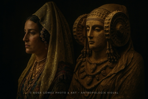 La obra clave de esta conexión es "Lo que permanece", una creación de la artista y antropóloga visual Rosa Gómez. Esta pieza ha sido recientemente incorporada al prestigioso Inventario de imágenes de la Dama de Elche, un archivo patrimonial gestionado por la Universidad Miguel Hernández de Elche. La imagen no busca una simple comparación, sino que propone un profundo diálogo visual entre la emblemática escultura ibérica, datada en el siglo V a.C., y una figura femenina ataviada con una creación inspirada en la indumentaria charra.