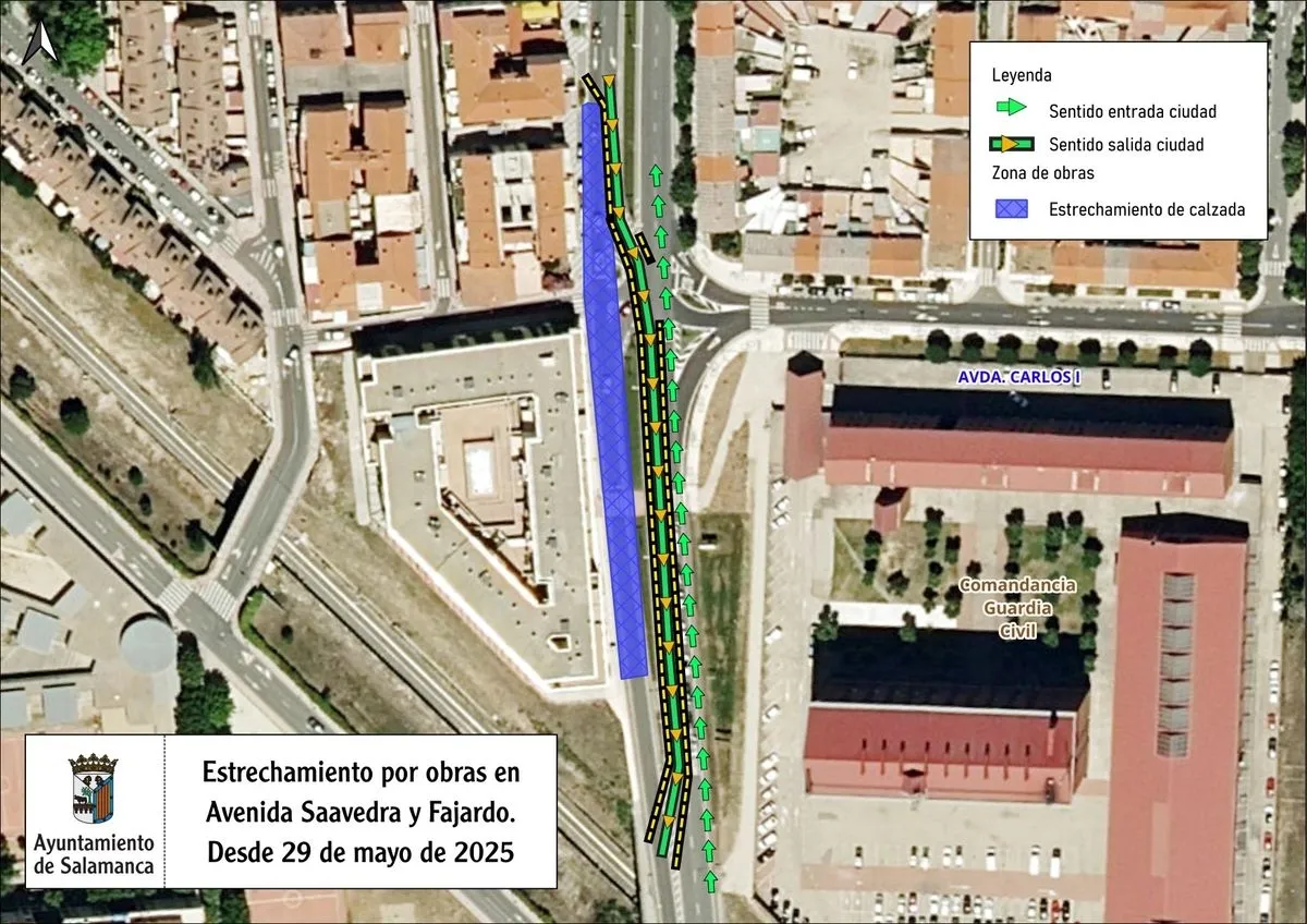 Un total de 22 calles de Salamanca se verán afectadas este jueves por cortes de tráfico, entre ellos destaca el estrechamiento en la avenida de Saavedra y Fajardo como preludio a las futuras obras.