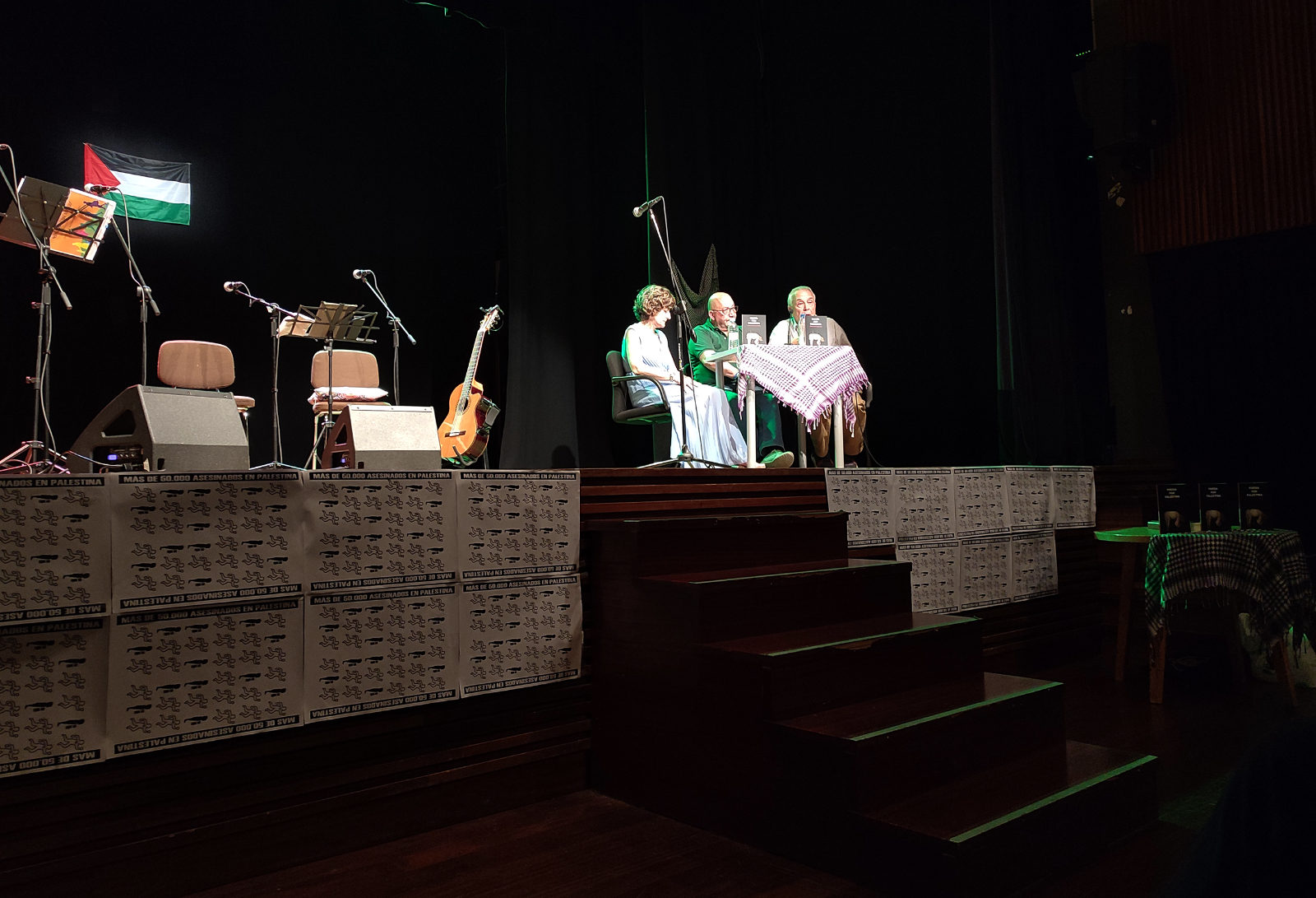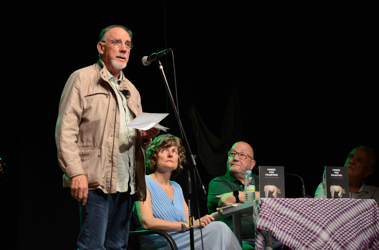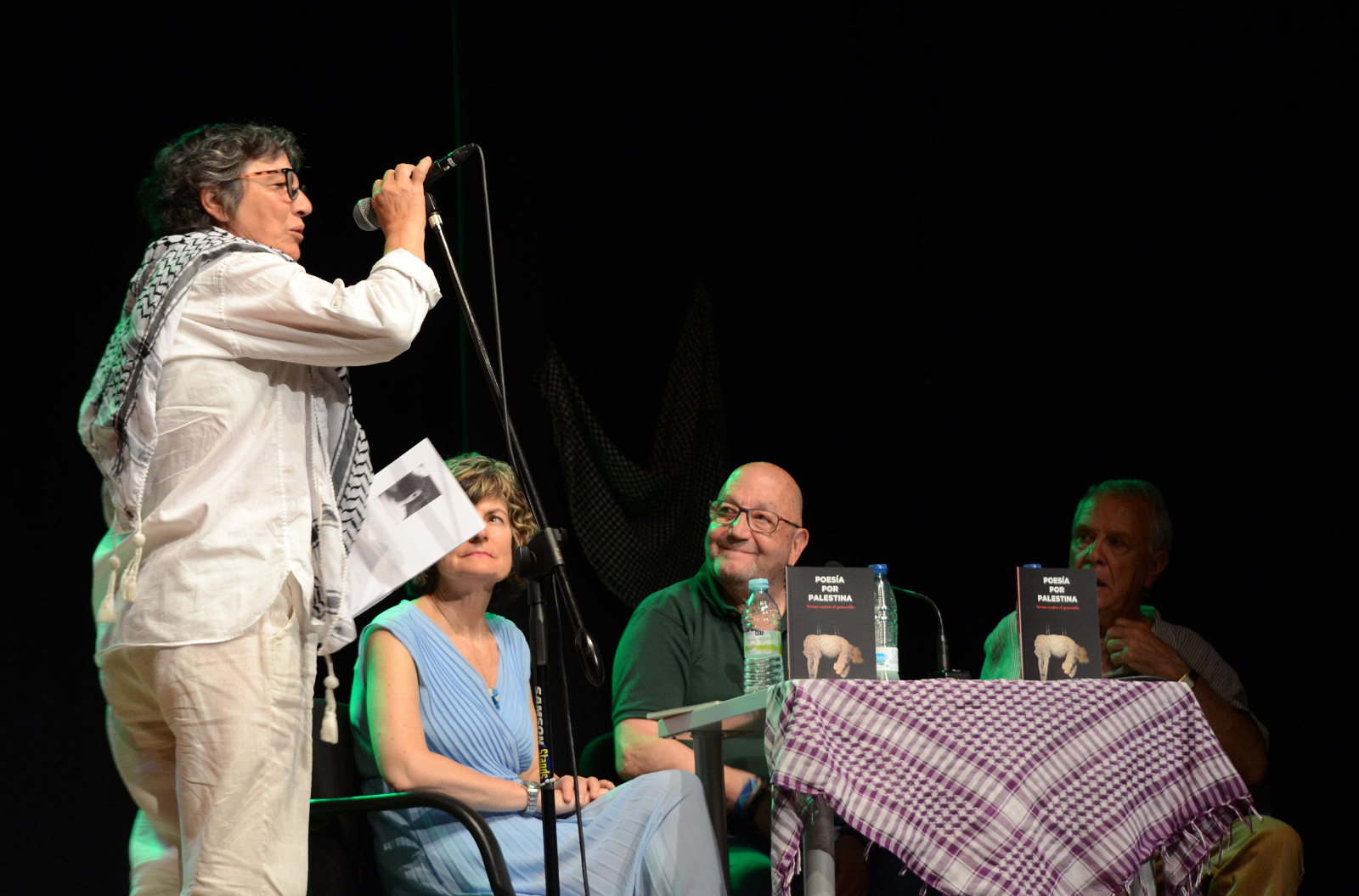 alentada por la posición judicial de Netanyahu, cabeza de un estado étnico y nacionalista al que le llueven las críticas mientras la lluvia es de fuego y sangre sobre la población palestina. Víctimas y verdugos ante quienes se enarbola la poesía como una bandera: la del poeta Agustín B. Sequeros, recordando las cifras del Armagedón, la de Esmeralda Martín, evocando la “no ciudad, no casa”, la de Amalia Iglesias y Julia Piera, que en un acto de generosidad no leen sus poemas, sino los de las grandes poetas palestinas que pronto se verán publicadas en español; la de Mónica Velasco, que nos hace vivir en un territorio mítico en la noche de la biblia. Poesía que se intercala con música para seguir escuchando las palabras de Elena Díez Santana, y su profundo “cuando se profana lo sagrado”, de Celia Corral y su desgarro en el centro de la razón, tan doloroso como el ocaso de las piedras, de Ferchu de Castro, esa piedra que María Ángeles Pérez López dice que ya no duele mientras voces como la de María Ángeles Gutiérrez Tavera lee el poema de Javier Cartago, o la profesora de árabe Laura Gago recitando en árabe al mayor poeta palestino.