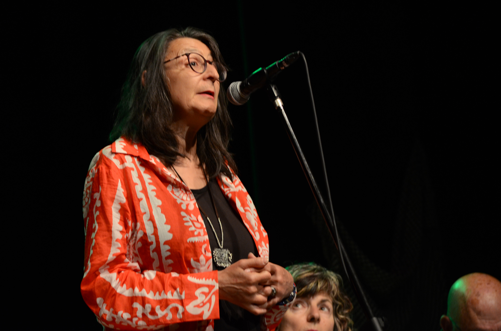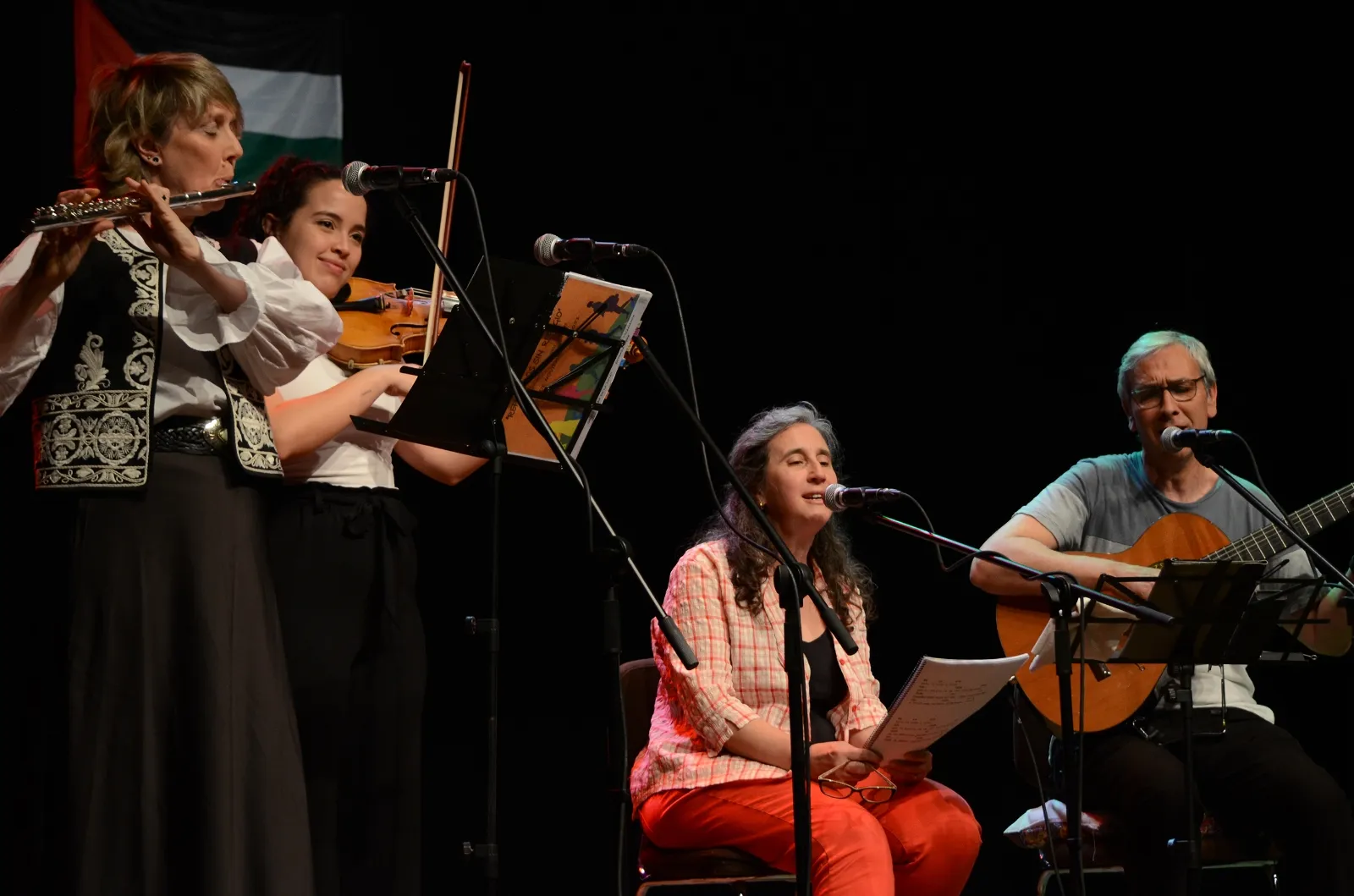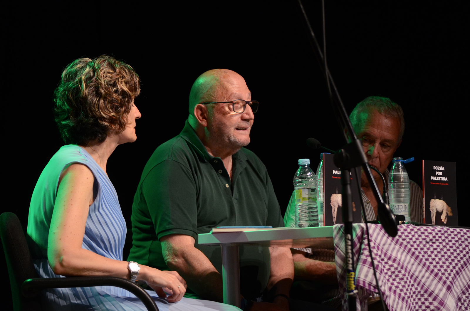 alentada por la posición judicial de Netanyahu, cabeza de un estado étnico y nacionalista al que le llueven las críticas mientras la lluvia es de fuego y sangre sobre la población palestina. Víctimas y verdugos ante quienes se enarbola la poesía como una bandera: la del poeta Agustín B. Sequeros, recordando las cifras del Armagedón, la de Esmeralda Martín, evocando la “no ciudad, no casa”, la de Amalia Iglesias y Julia Piera, que en un acto de generosidad no leen sus poemas, sino los de las grandes poetas palestinas que pronto se verán publicadas en español; la de Mónica Velasco, que nos hace vivir en un territorio mítico en la noche de la biblia. Poesía que se intercala con música para seguir escuchando las palabras de Elena Díez Santana, y su profundo “cuando se profana lo sagrado”, de Celia Corral y su desgarro en el centro de la razón, tan doloroso como el ocaso de las piedras, de Ferchu de Castro, esa piedra que María Ángeles Pérez López dice que ya no duele mientras voces como la de María Ángeles Gutiérrez Tavera lee el poema de Javier Cartago, o la profesora de árabe Laura Gago recitando en árabe al mayor poeta palestino.