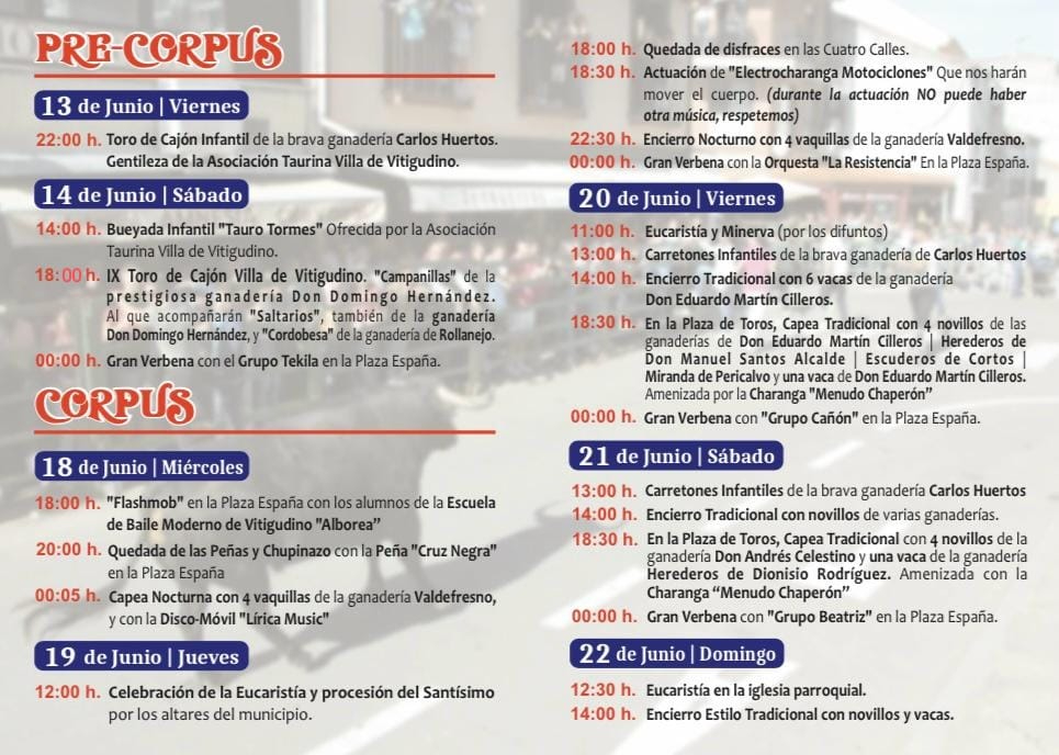 Vitigudino ya cuenta las horas para dar inicio a una de sus celebraciones más esperadas: las fiestas del Corpus. Un año más, el municipio ha preparado un extenso y variado programa que arrancará el viernes 13 de junio con el pre-Corpus y se extenderá hasta el domingo 22, ofreciendo una atractiva mezcla de fervor religioso, arraigadas tradiciones taurinas y vibrantes espectáculos musicales.