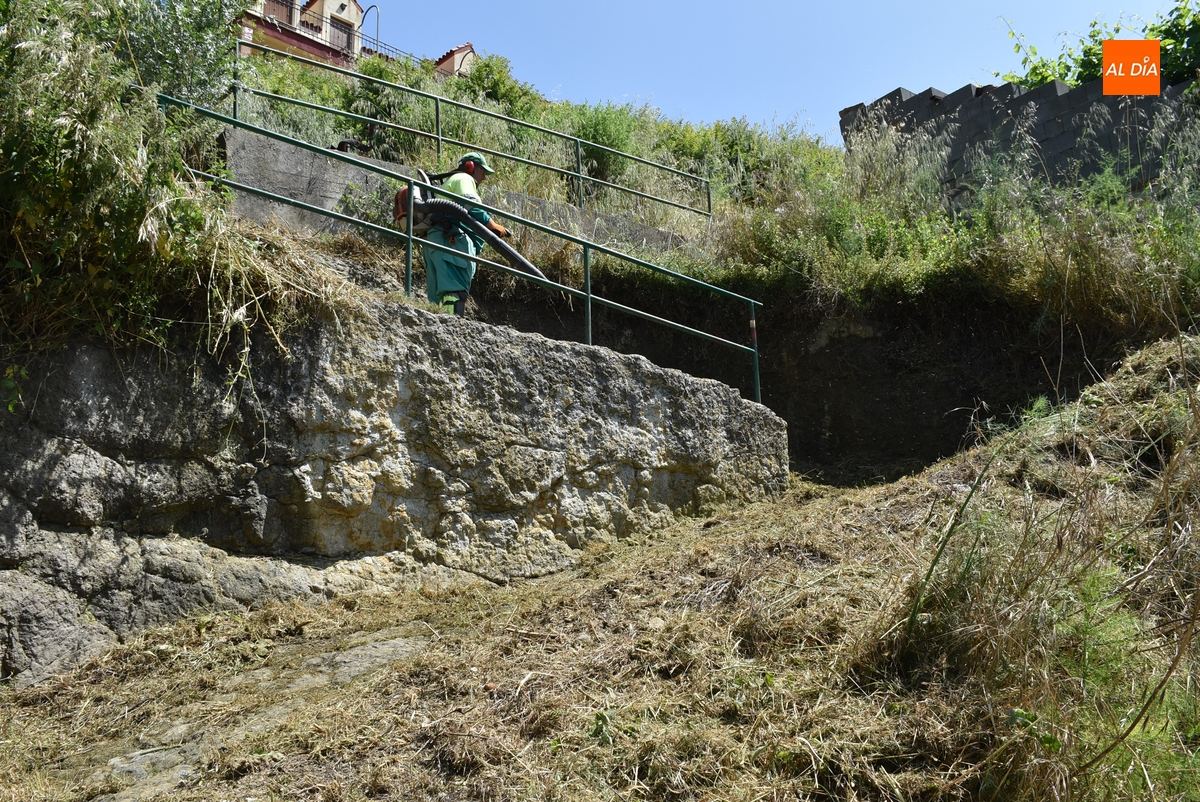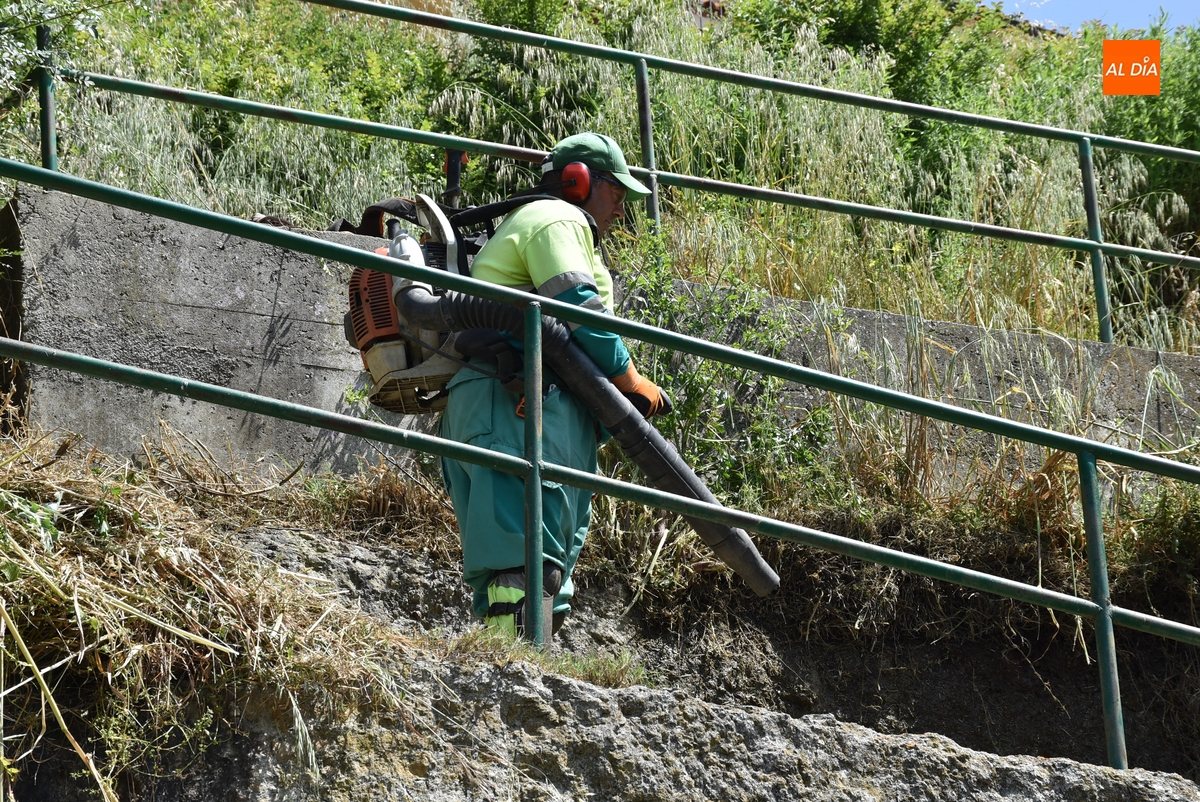Además de una nueva ronda de trabajos en la Alameda Vieja a cargo de jardineros municipales, durante la mañana del viernes se estuvieron poniendo a punto dos entornos de Ciudad Rodrigo de cara al verano, que ya se deja sentir aunque oficialmente la estación todavía no haya comenzado.
