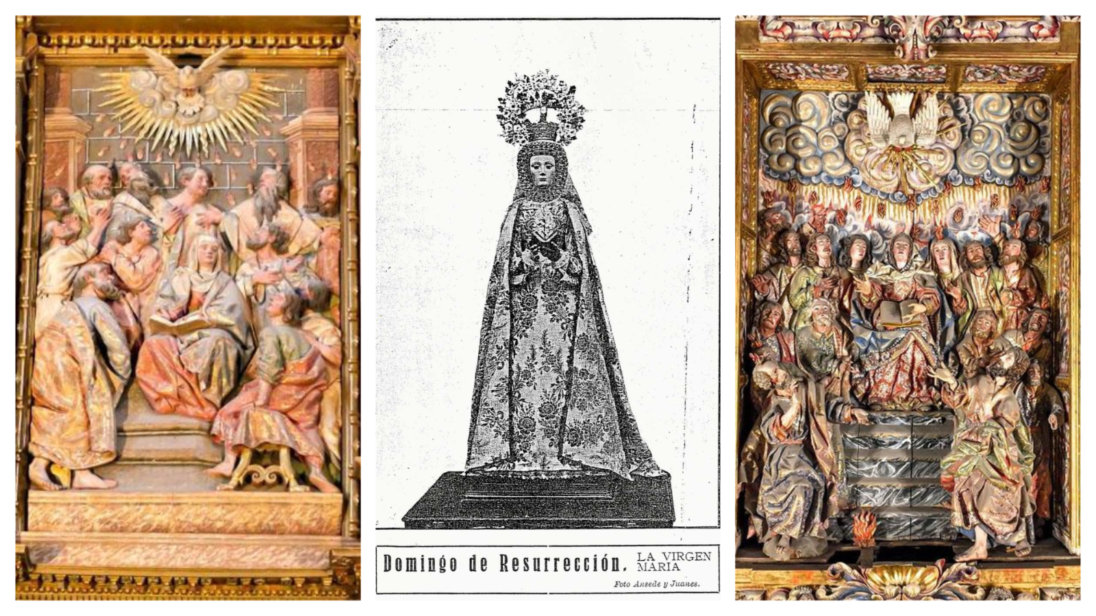 La venida del Espíritu Santo, narrada en el capítulo segundo de los Hechos de los Apóstoles, está representada como escena principal en los dos templos salmantinos que comparten esta titulación. En primer lugar, en la iglesia del antiguo convento de las Comendadoras de Santiago, la parroquia de Sancti Spíritus, si bien ocupa en este caso el ático, dejando el lugar central al patrono de España, conforme a la temática jacobea del conjunto. El otro gran Pentecostés de nuestros retablos barrocos es el de la iglesia del Espíritu Santo, la joya jesuítica que, precisamente por ser arrebatada a la Compañía, conocemos como la Clerecía.