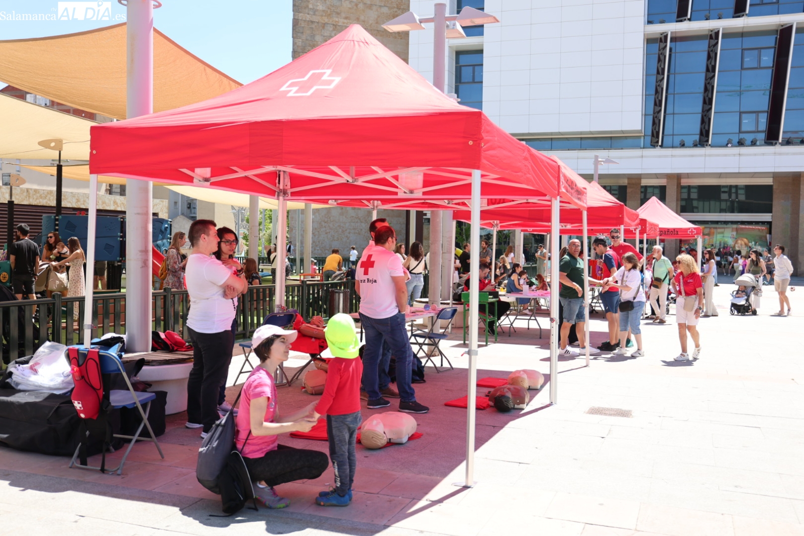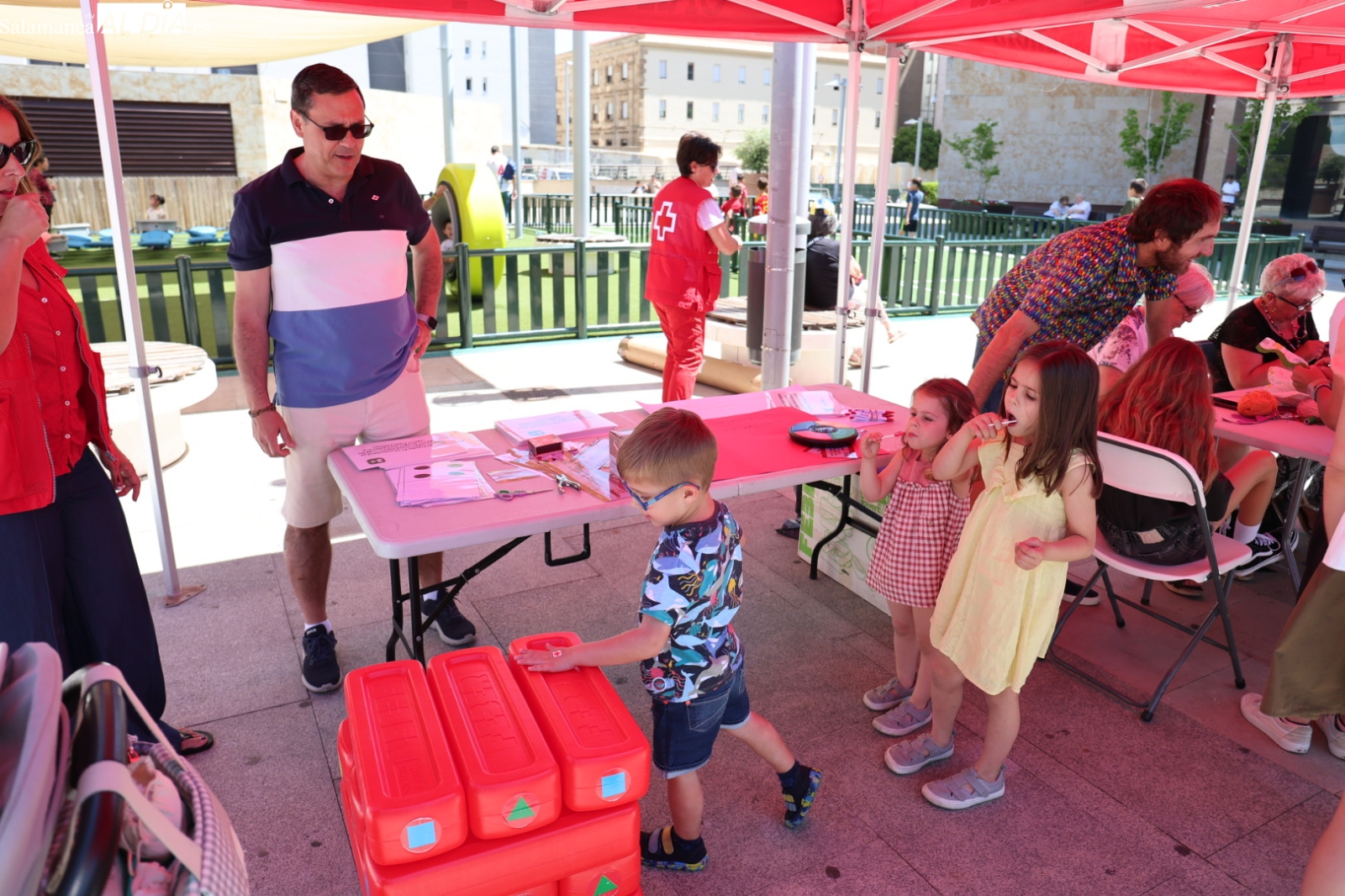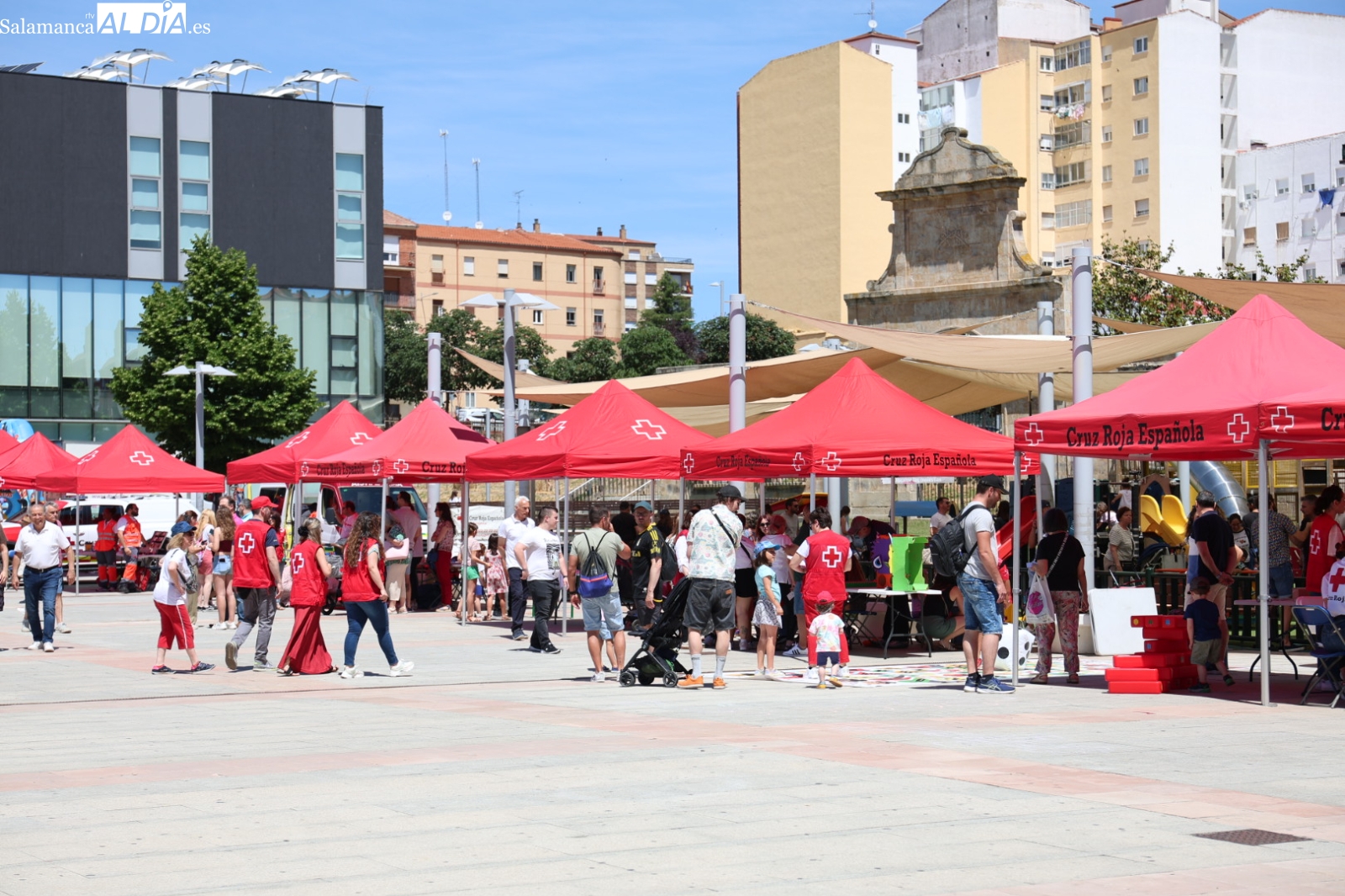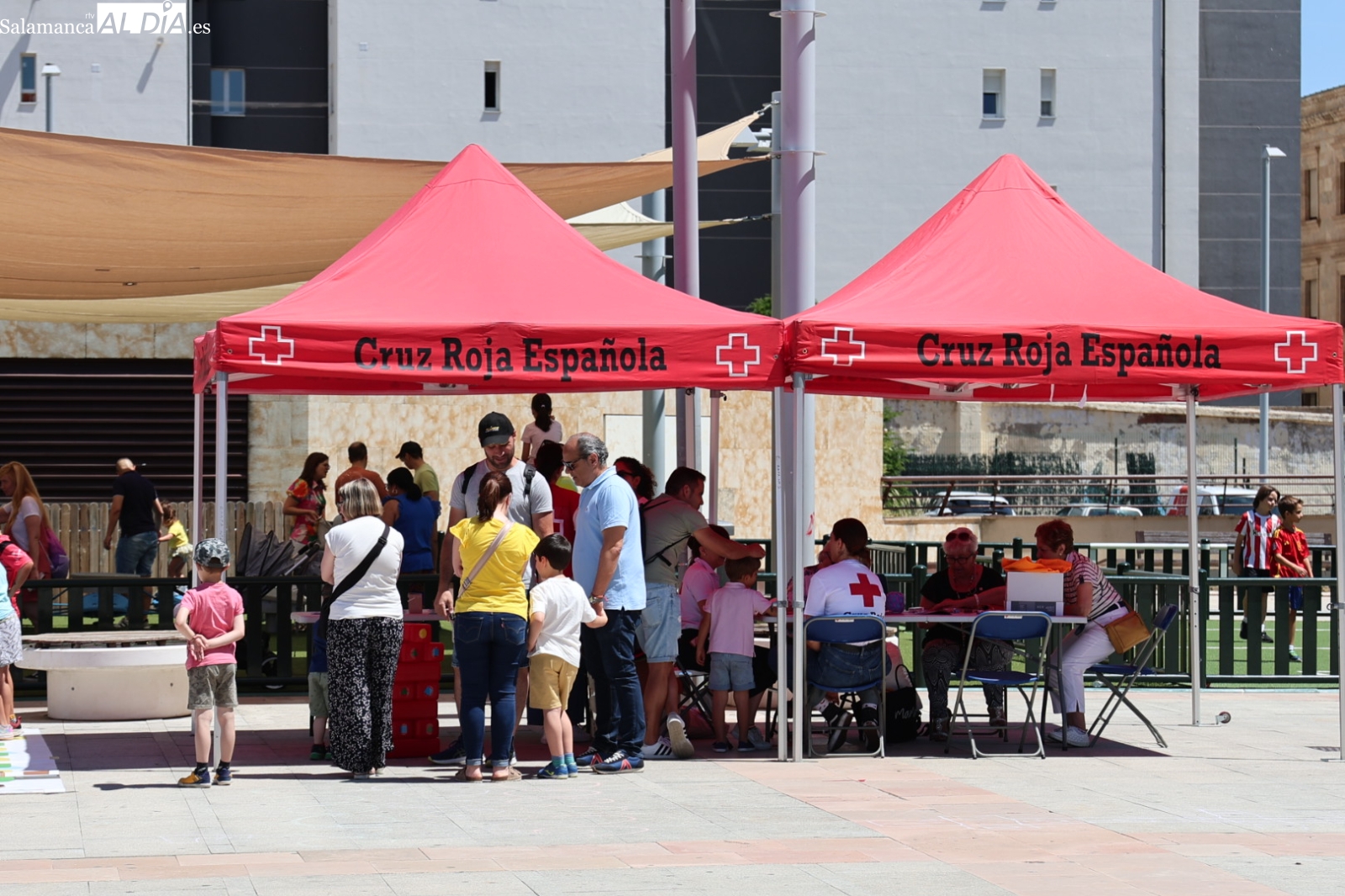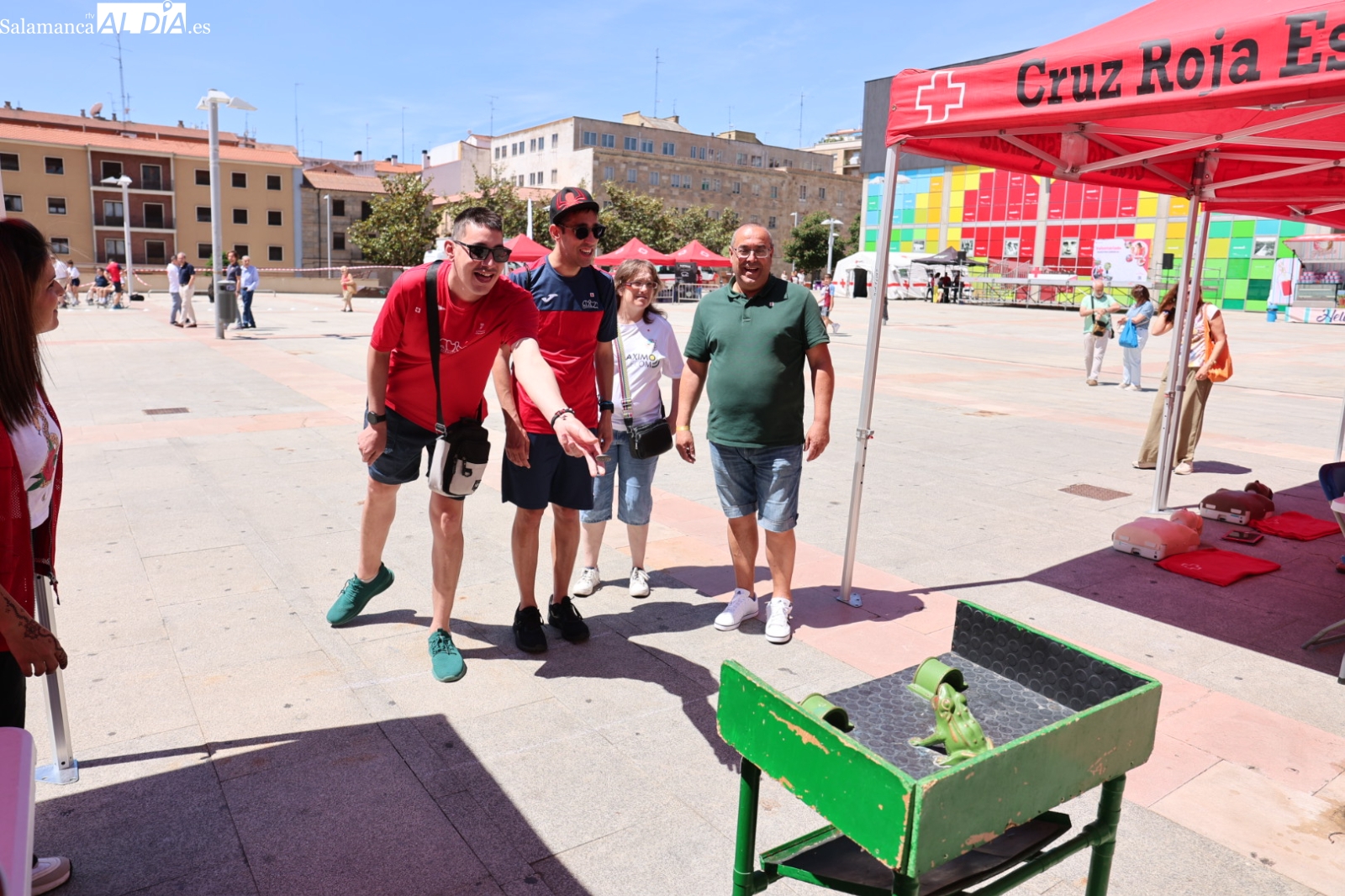 La Plaza de la Concordia de Salamanca se ha convertido este sábado, 7 de junio, en el epicentro de la solidaridad con la celebración de la emblemática Fiesta de la Banderita de Cruz Roja. Bajo el lema “Un día para compartir, un futuro para cambiar”, la organización humanitaria ha desplegado un amplio abanico de actividades lúdicas y participativas desde las 11:00 hasta las 20:00 horas, con el objetivo primordial de recaudar fondos para sus proyectos de apoyo a la infancia y las familias en la provincia. Al evento acudieron para mostrar su respaldo el alcalde de Salamanca, Carlos García Carbayo, y los vicepresidentes primero y tercero de la Diputación, David Mingo y Eva Picado, respectivamente.