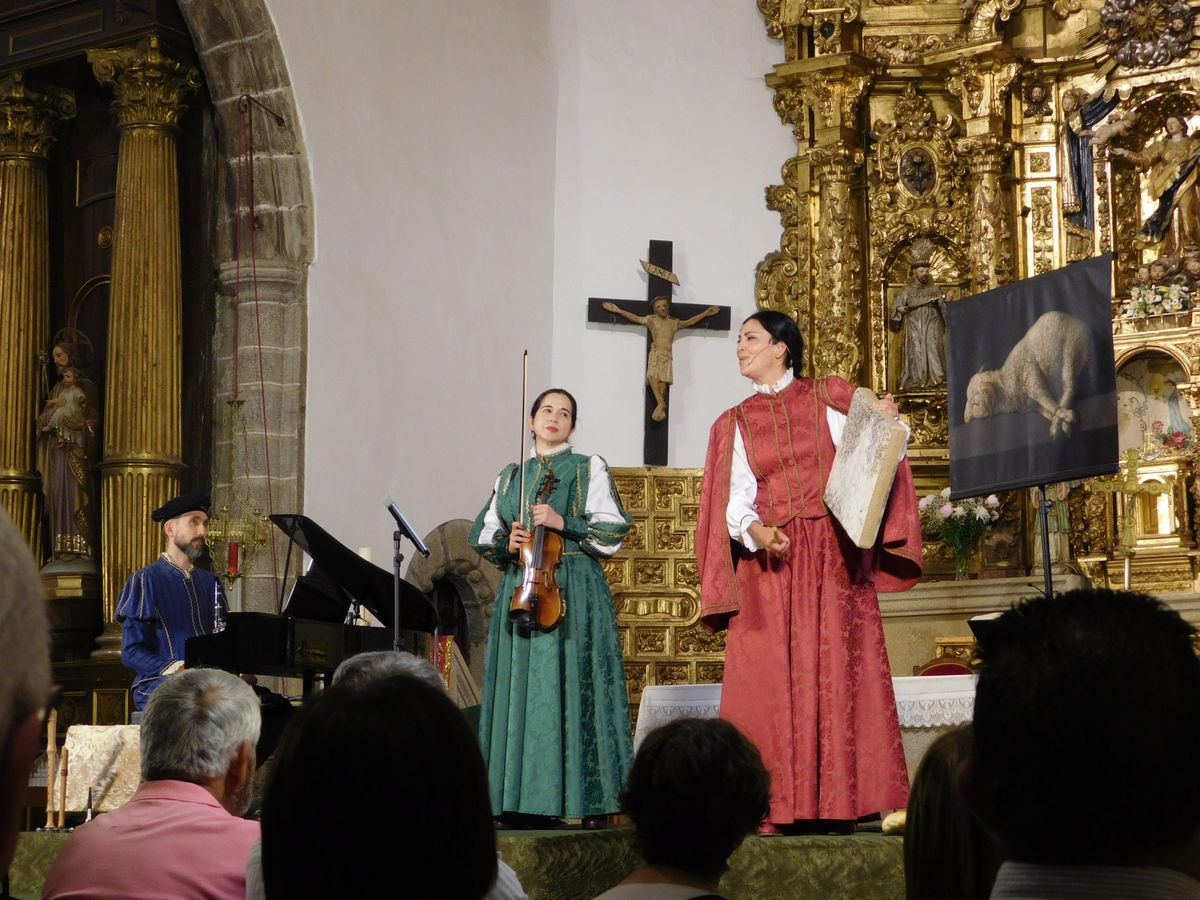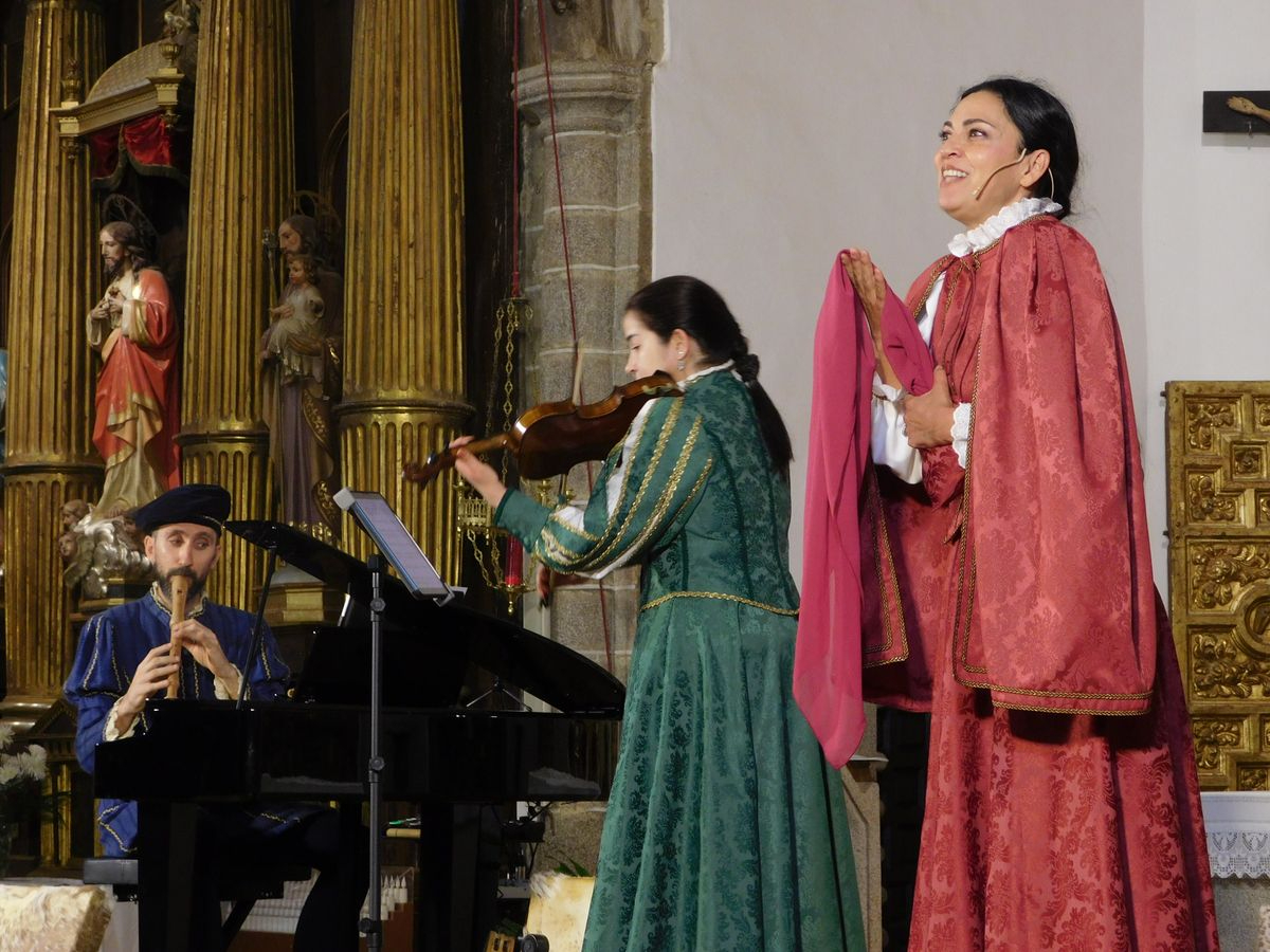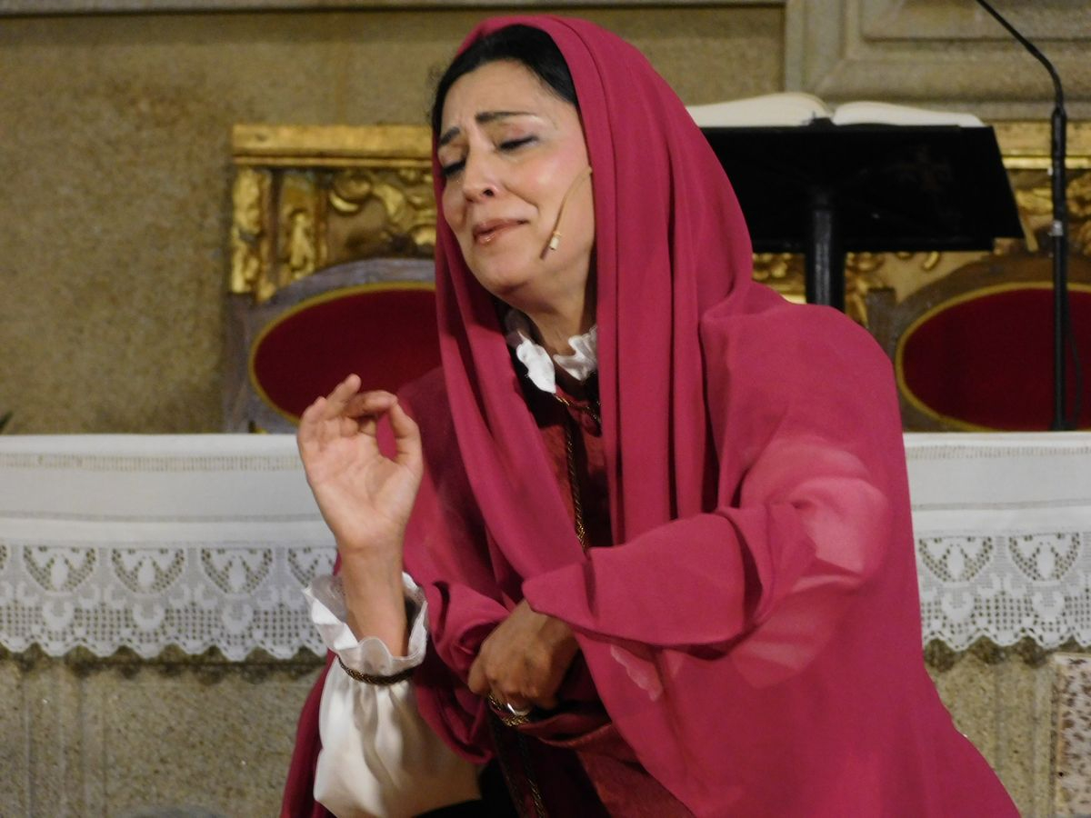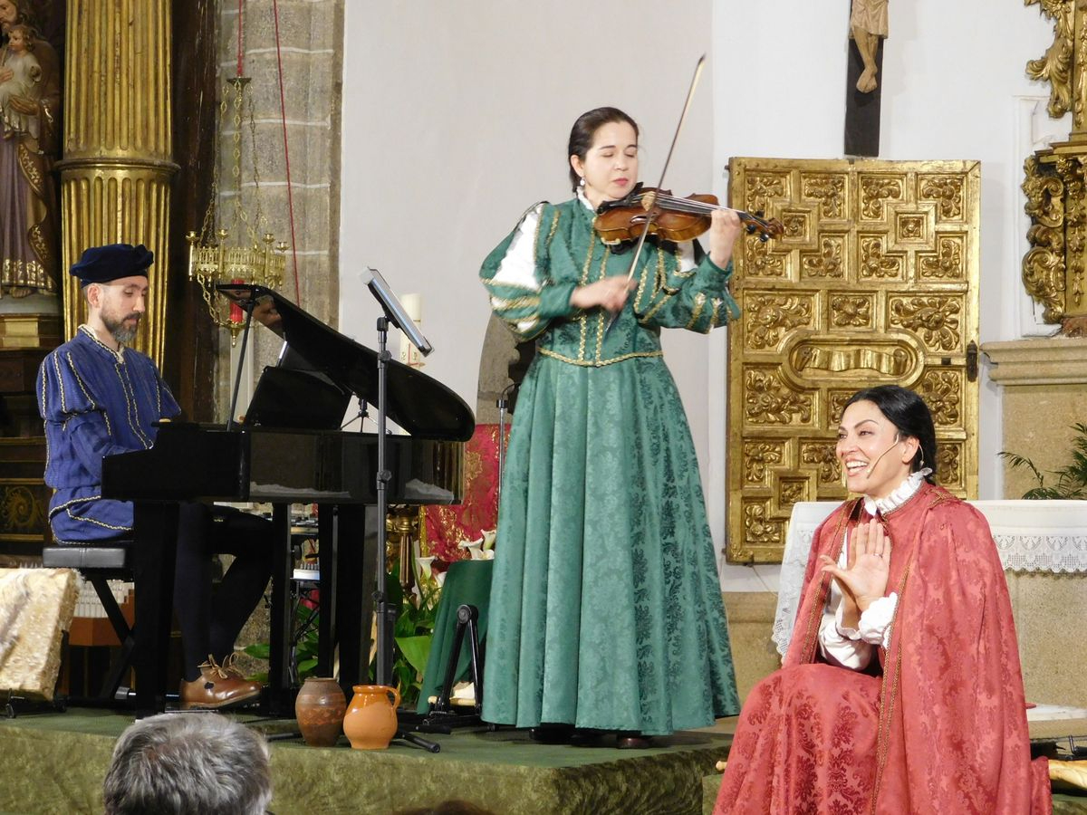 La maestría y profesionalidad de los tres intérpretes que forman el elenco, hicieron fluir de principio a fin este espectáculo místico. La actriz y cantante salmantina de talla internacional, Guadalupe Lancho, captó en todo momento la atención del público que además se sorprendió con su potente y melodiosa voz. El director musical, también salmantino, Juan Francisco Vicente se convirtió en un auténtico “hombre orquesta” haciendo sonar primorosamente todos los instrumentos que pasaron por sus manos. Y completó este “trío de ases” la cubana afincada en Salamanca, Jenny Leyva que, con una interpretación sentida y delicada, hizo hablar a su violín.