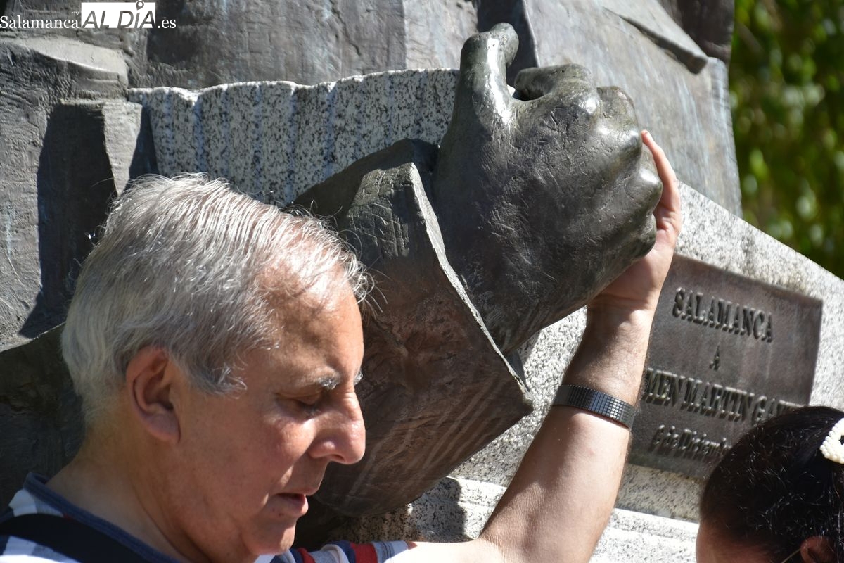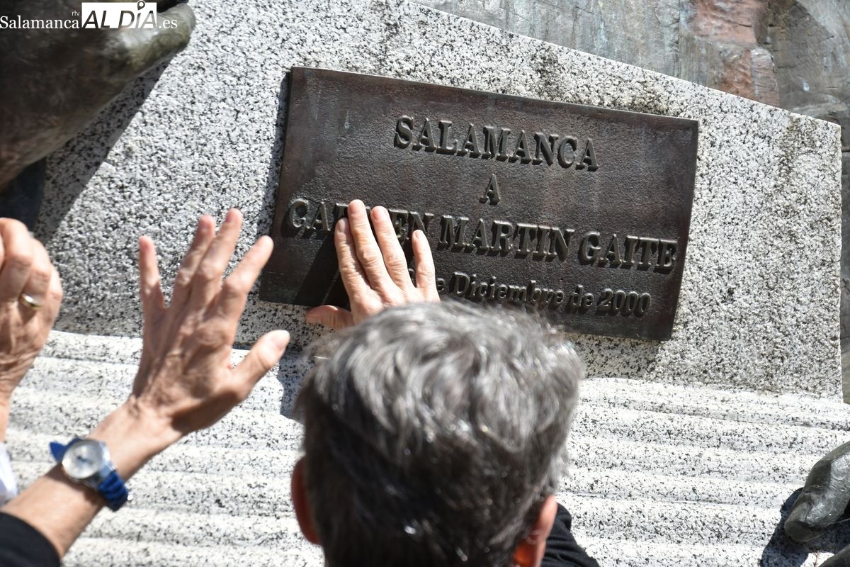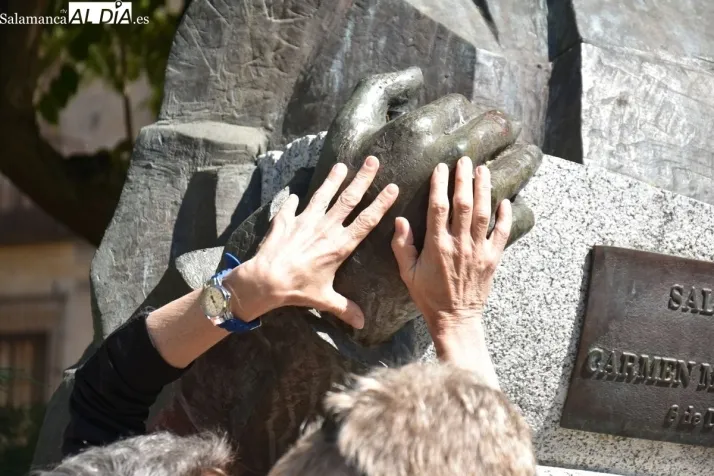 Frente a lo que fue la casa natal de Carmen Martín Gaite, en la Plaza de los Bandos, mirando a la iglesia donde fue bautizada y a la callecita que se convirtiera en refugio contra la guerra, mis nuevos amigos escuchan la voz de la escritora hablando de "su" plaza, y leyendo, con las yemas de los dedos sensitivas y raudas, las páginas de su casi autobiografía 'Entre visillos'. El Ayuntamiento de Salamanca nos ha facilitado el acceso a la estatua de la autora, obra de Narcisa Vicente, y ahí van las manos que leen, las manos que ven, a unirse a las de Carmen Martín Gaite, quien abraza sus libros y cuadernos. Emoción absoluta.