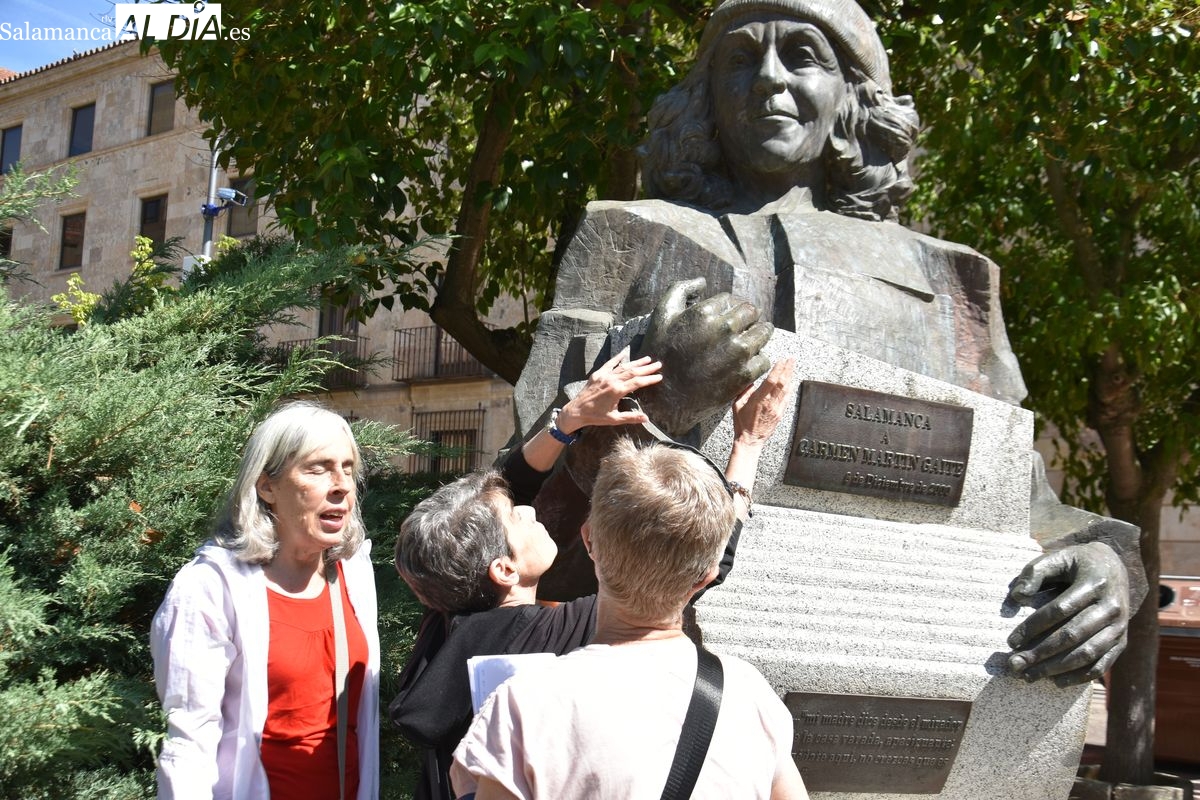 Cae el agua en la fuente de la Plaza de los Bandos con su música a despecho de los años que han pasado y las futuras reformas municipales que han de mantener su esencia decimonónica. Suspiran los perros guías buscando la sombra de un sábado que ya apunta calores, mientras este grupo tan especial de turistas literarios escucha atentamente las páginas que tan bien han leído previamente. Amigos desde la infancia en las escuelas de la ONCE, este grupo de amantes de la lectura no solo intercambian libros, sino que organizan viajes literarios, perfectamente documentados, para visitar los espacios de las novelas que les han gustado. Ya recorrieron Valencia buscando los rastros de Arroz y tartana, o el Oviedo húmedo y hospitalario de La regenta. Han pateado el Valladolid de El Hereje, el Madrid de Fortunata y Jacinta, y ahora, es Carmen Martín Gaite, aquella a la que la ciudad hace esperar para un merecido medallón en "su" plaza grande, quien les recibe.
