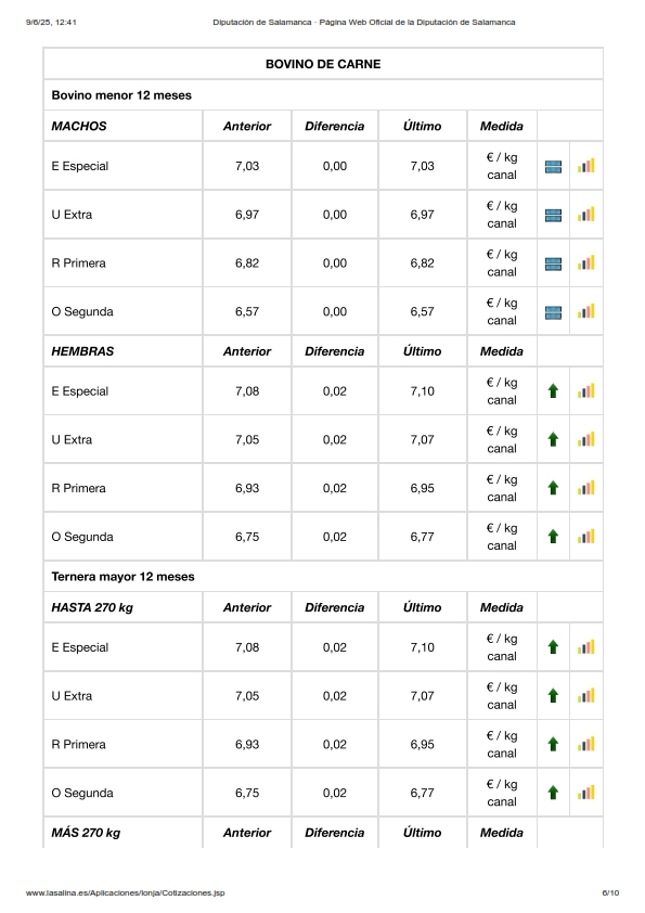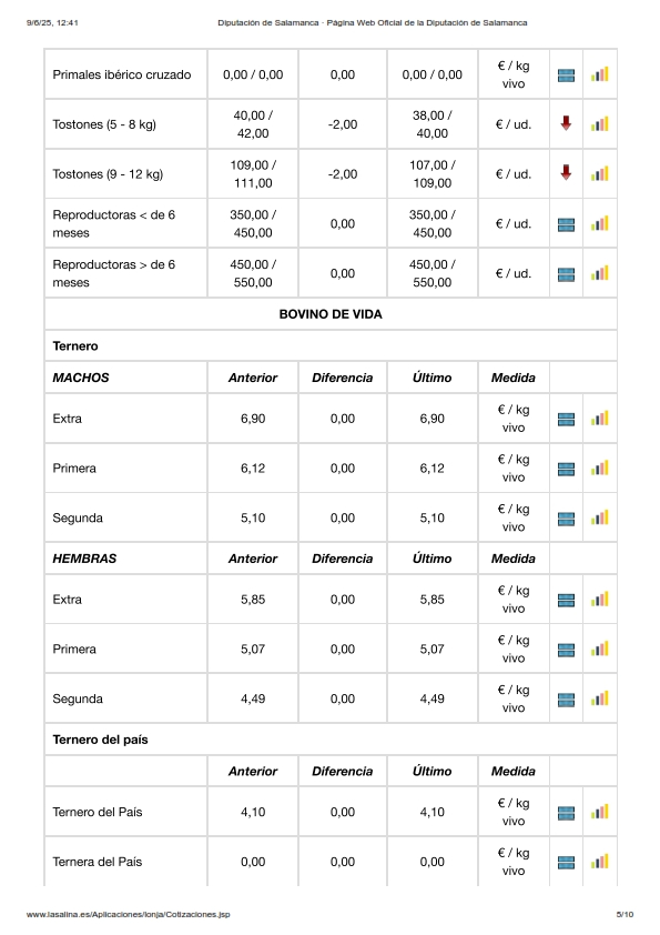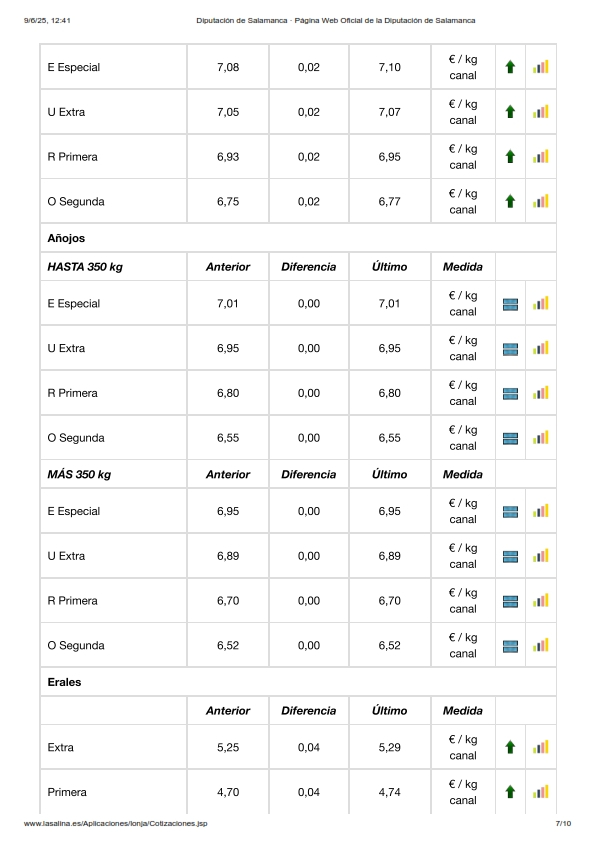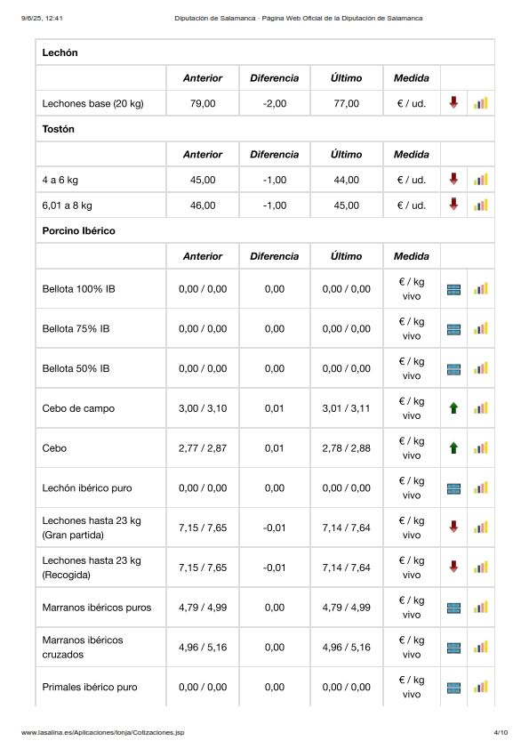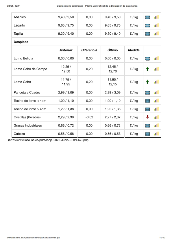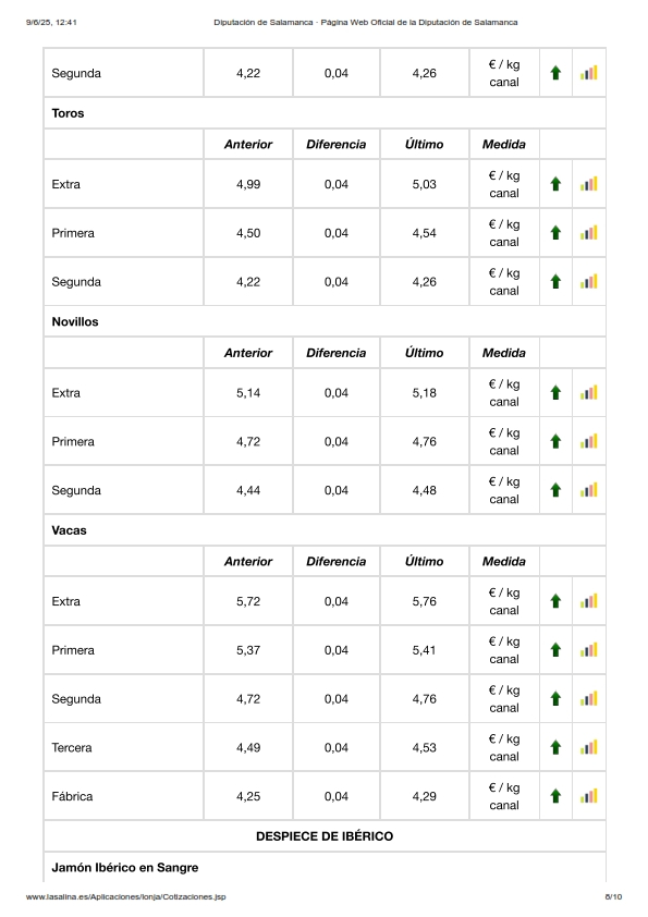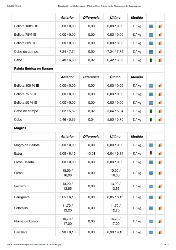 Por último, en la Mesa de Despiece de Ibérico los jamones en sangre de cebo suben 0,02 €/kg, también las paletas de cebo de campo, mientras que las de cebo suben 0,04 €/kg. El magro extra baja -0,01 €/kg, las costillas peladas -0,01 €/kg. Por el contrario, el lomo de cebo de campo y el de cebo suben 0,20 €/kg.