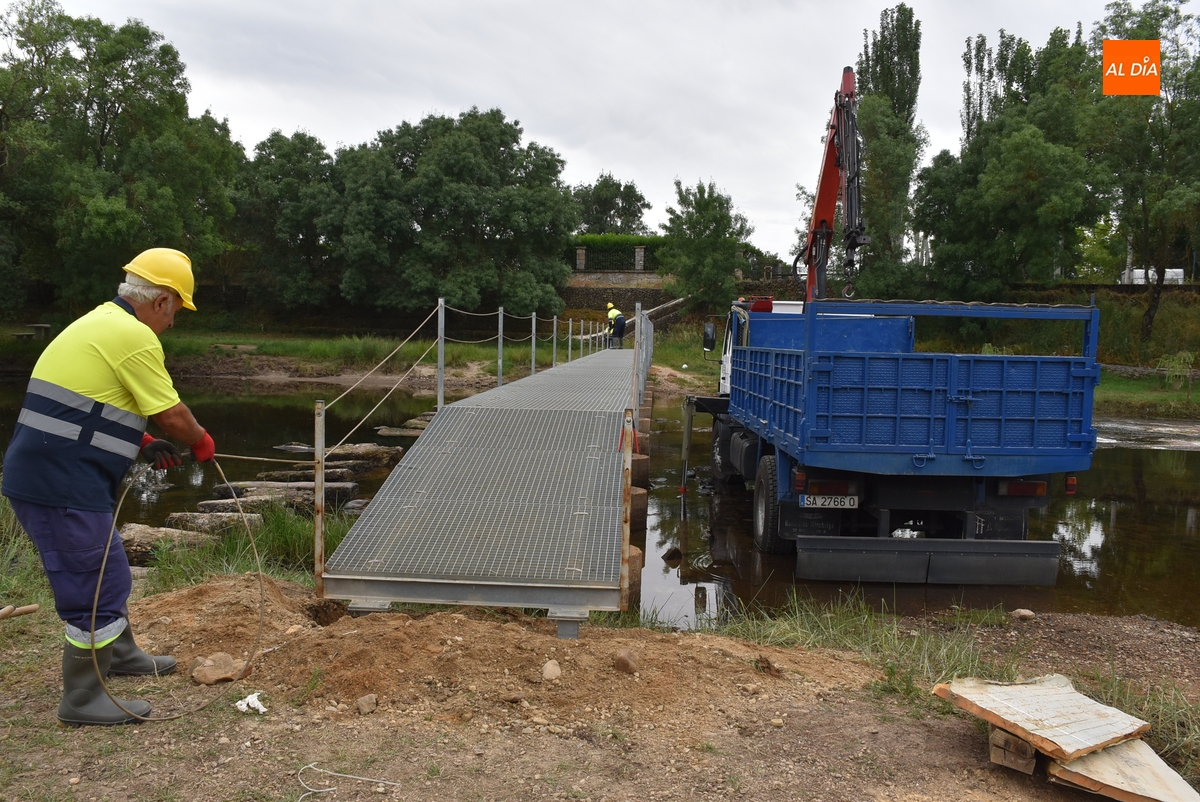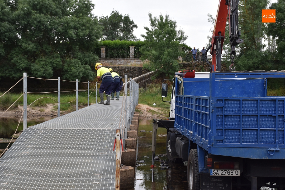 Con unos días de retraso respecto a la fecha en la cual el Ayuntamiento de Ciudad Rodrigo puede colocarla, que se suele respetar escrupulosamente (el 1 de junio), a lo largo de la mañana del martes de procedió a desplegar la pasarela que permite salvar con comodidad el río Águeda en la zona de los clásicos pontones que conectan la isla de El Picón con el lateral donde se encuentra situado el Camping Municipal.