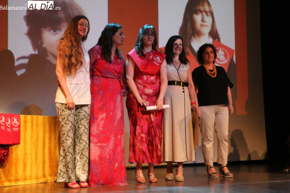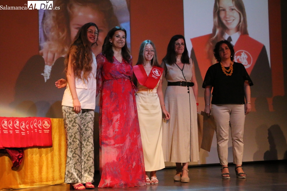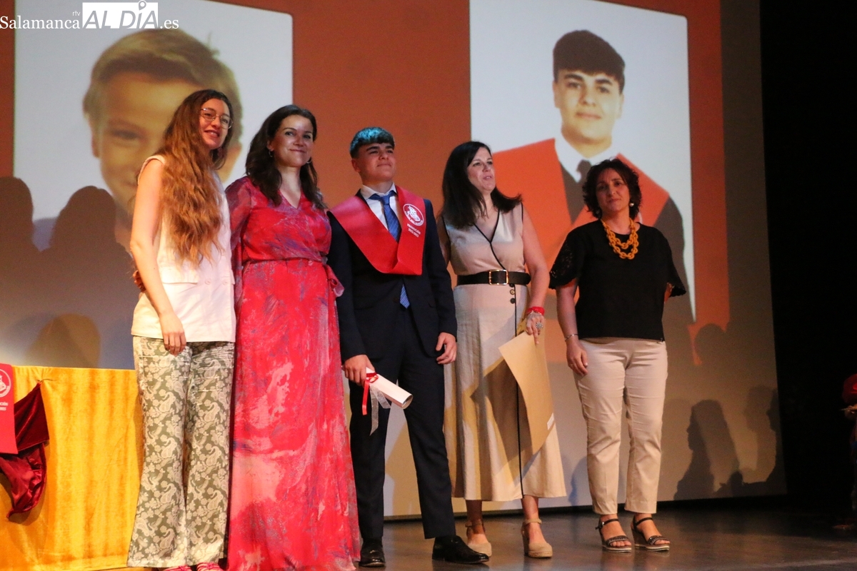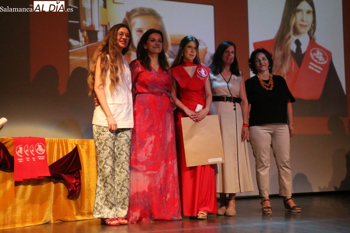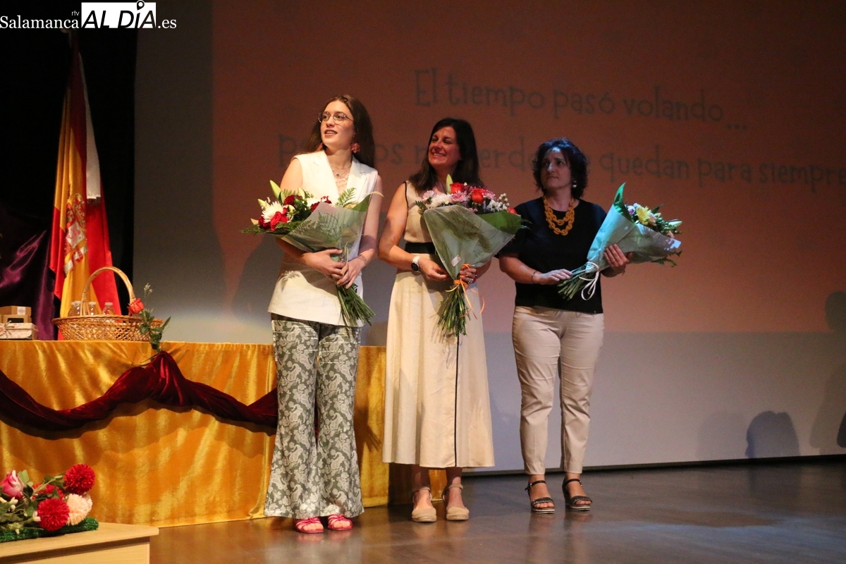 La ceremonia contó con discursos de la directora, alumnos y familias, la proyección de vídeos conmemorativos y la entrega de becas y orlas, culminando con un obsequio de la AMPA