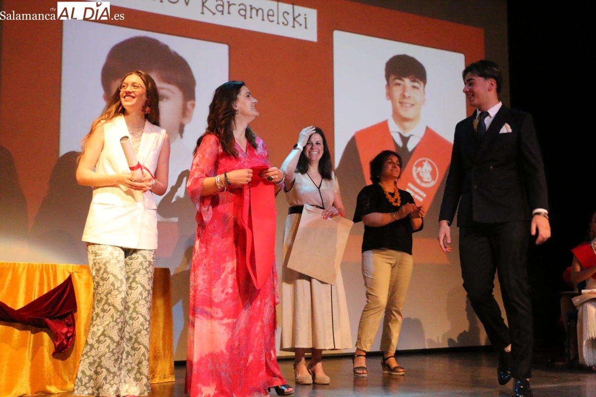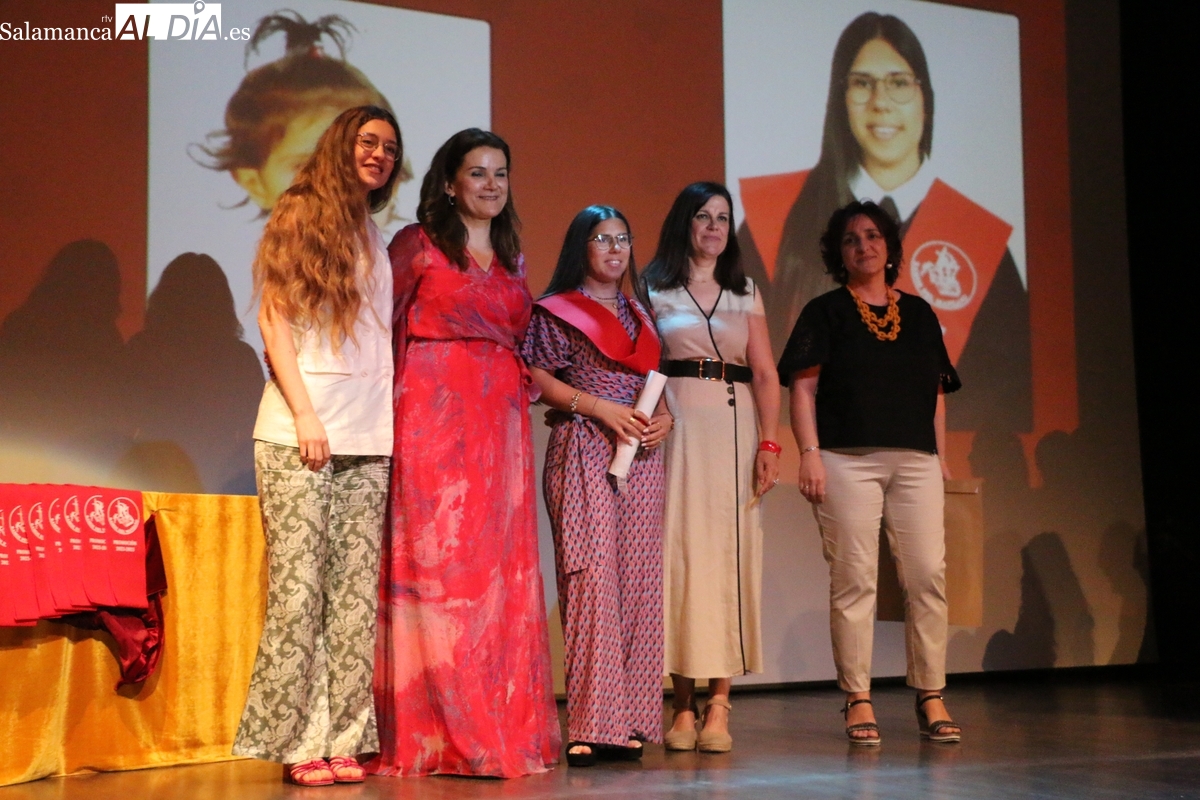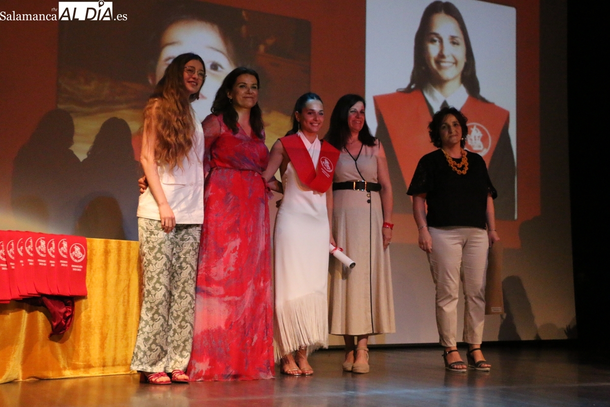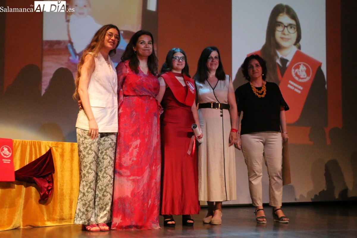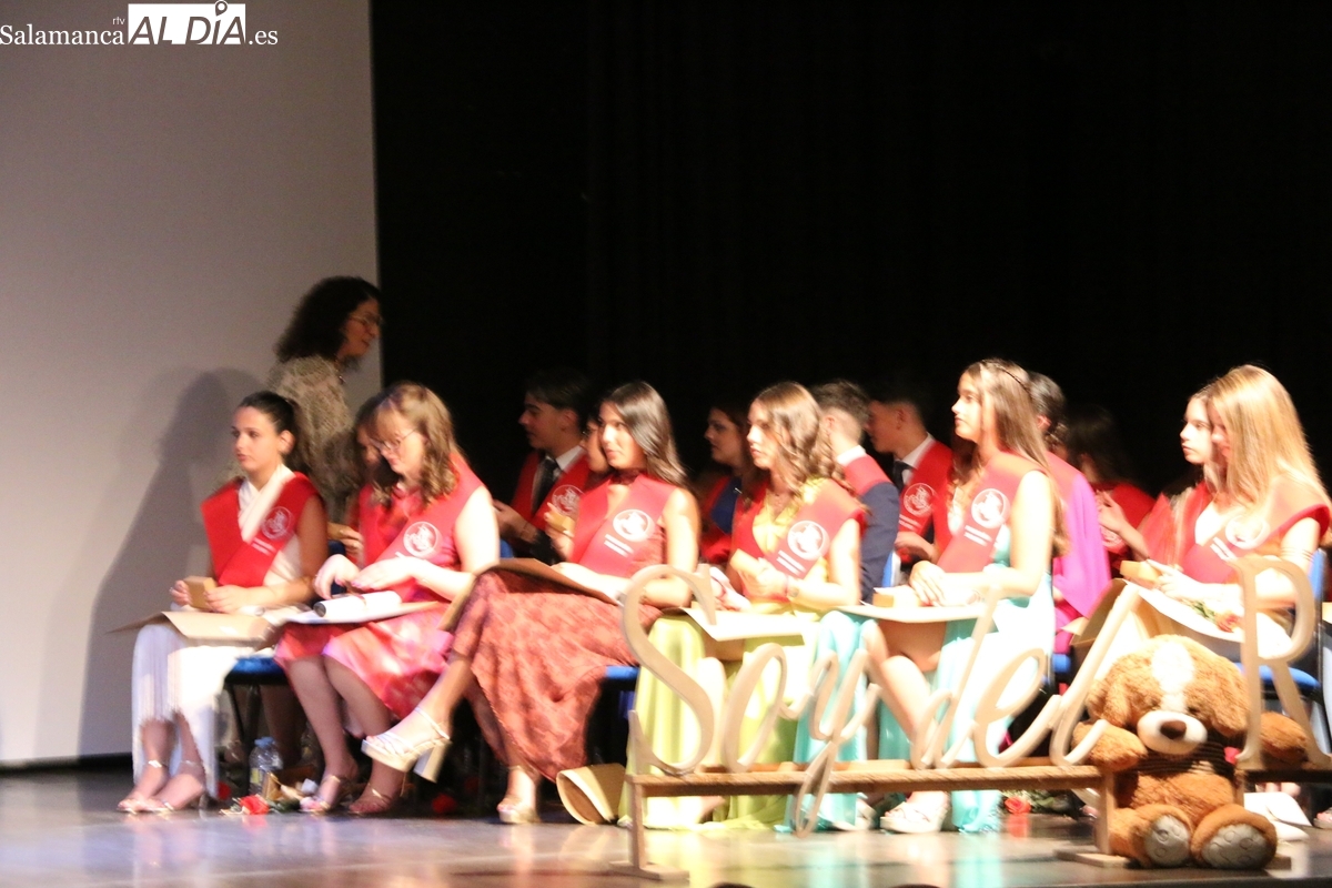 La ceremonia contó con discursos de la directora, alumnos y familias, la proyección de vídeos conmemorativos y la entrega de becas y orlas, culminando con un obsequio de la AMPA