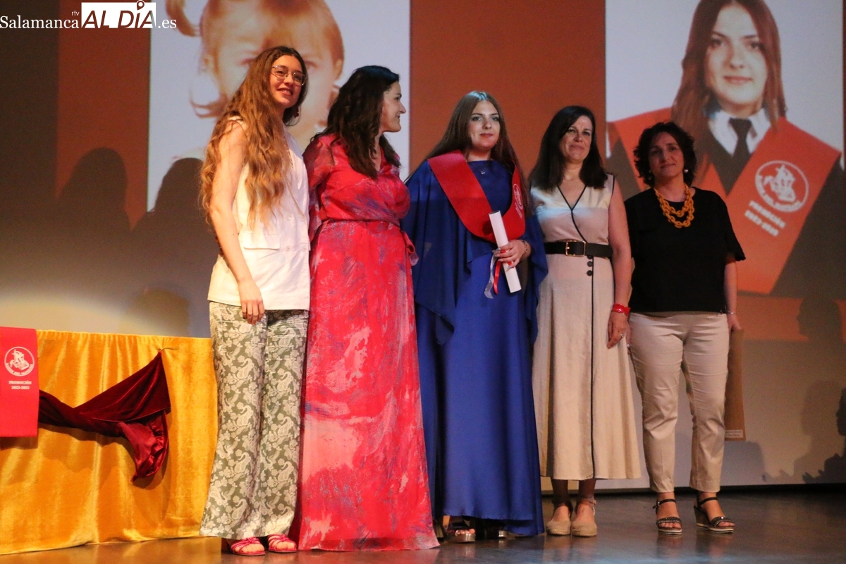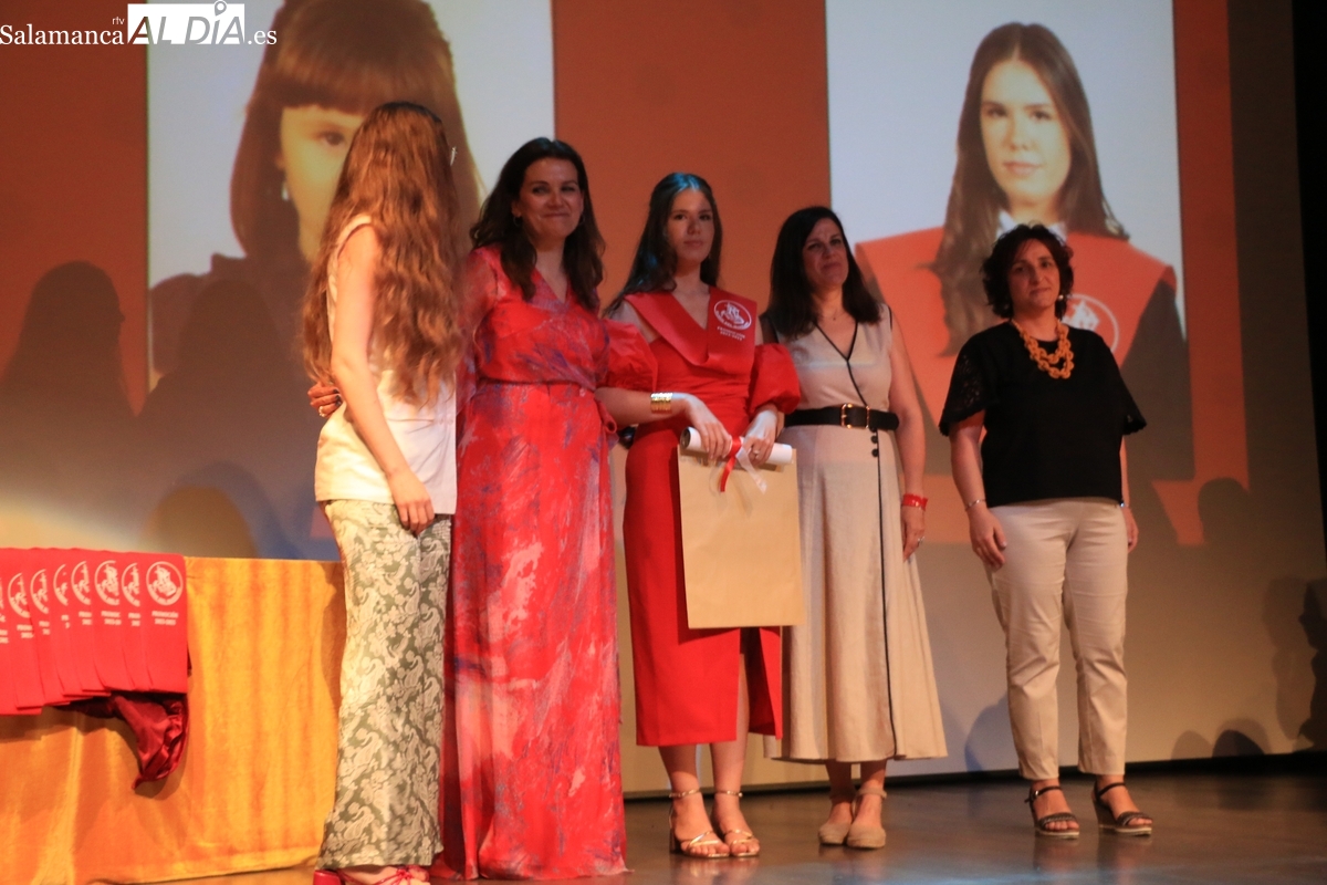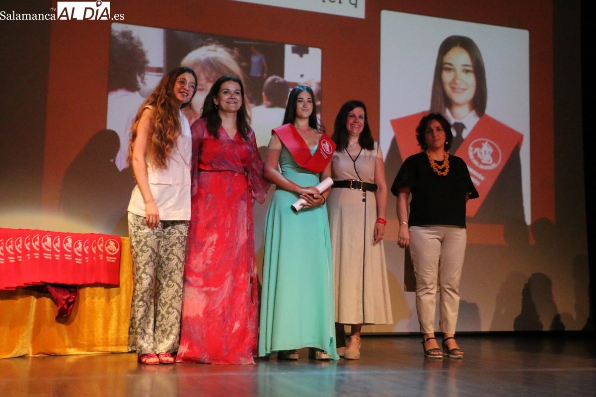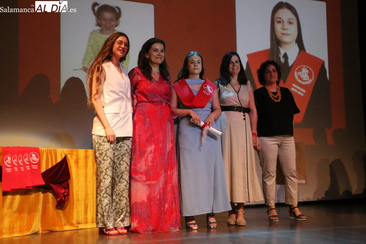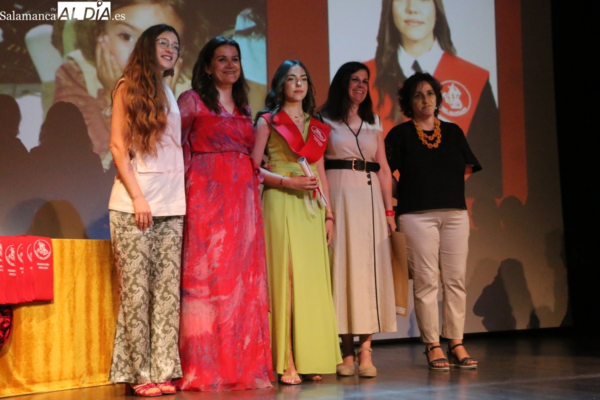 La ceremonia contó con discursos de la directora, alumnos y familias, la proyección de vídeos conmemorativos y la entrega de becas y orlas, culminando con un obsequio de la AMPA