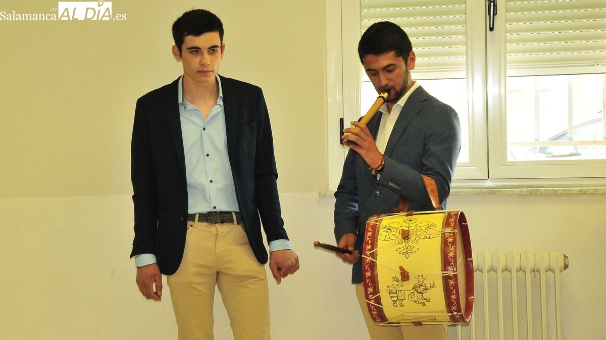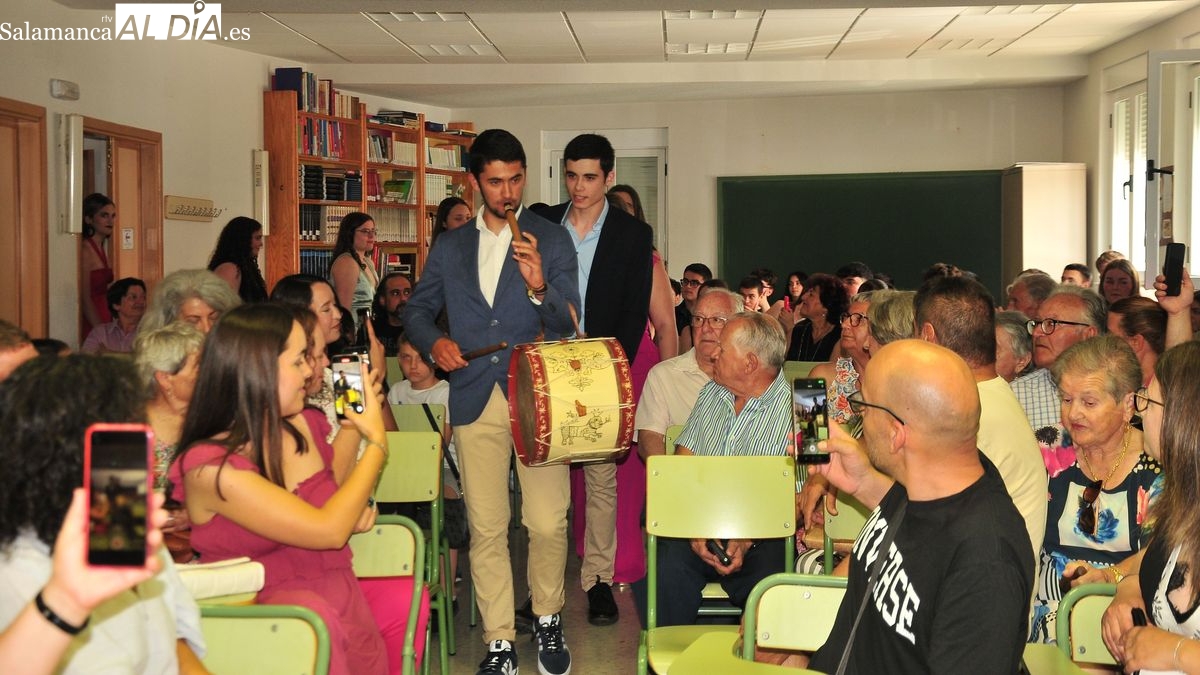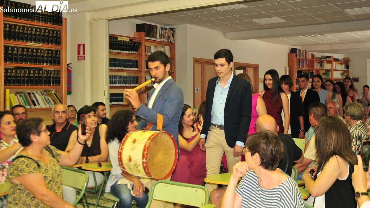 Los graduados entraron en el salón de actos acompañados de la música de la gaita y el tamboril tocados por Andrés, el joven tamborilero de Bañobárez que hoy se despedía, junto con sus compañeros del instituto en el que han convivido los últimos 6 años.