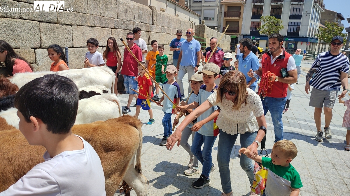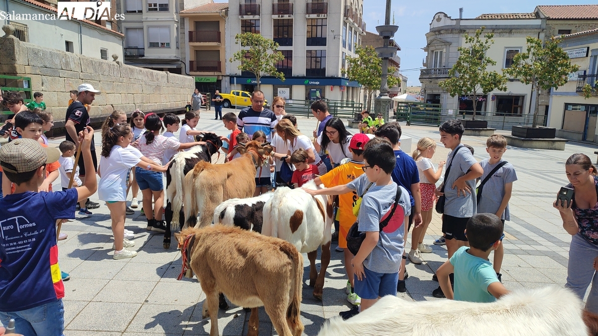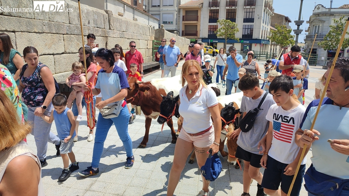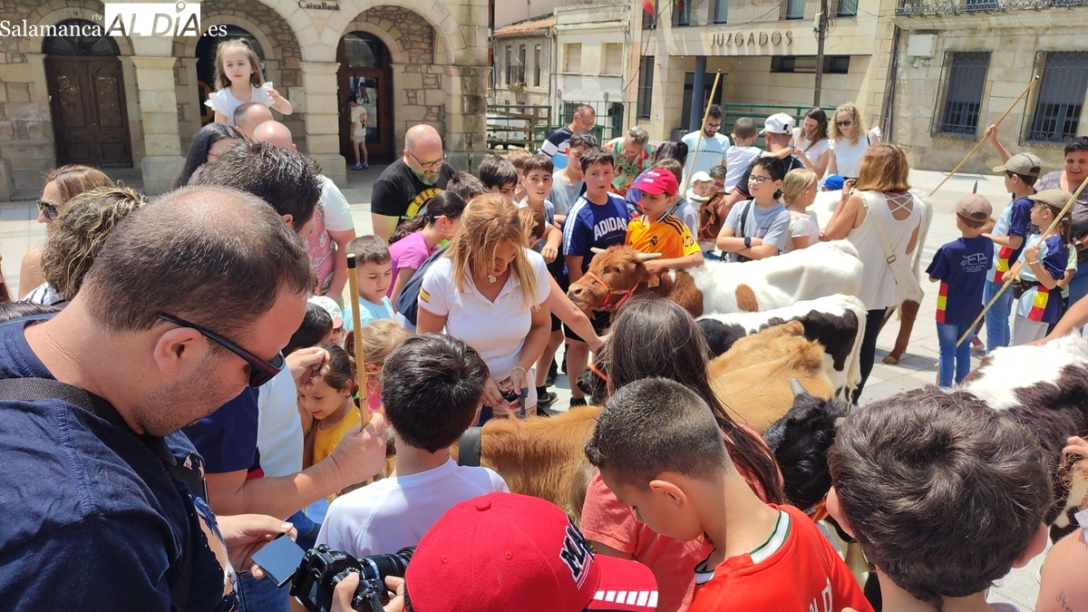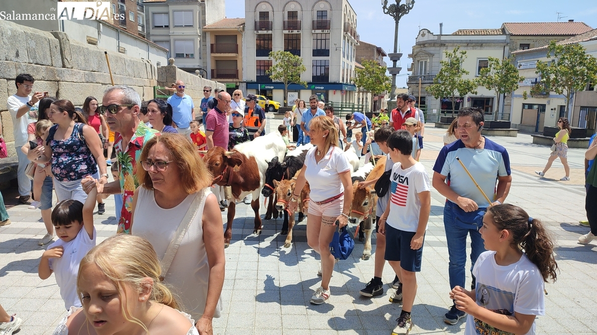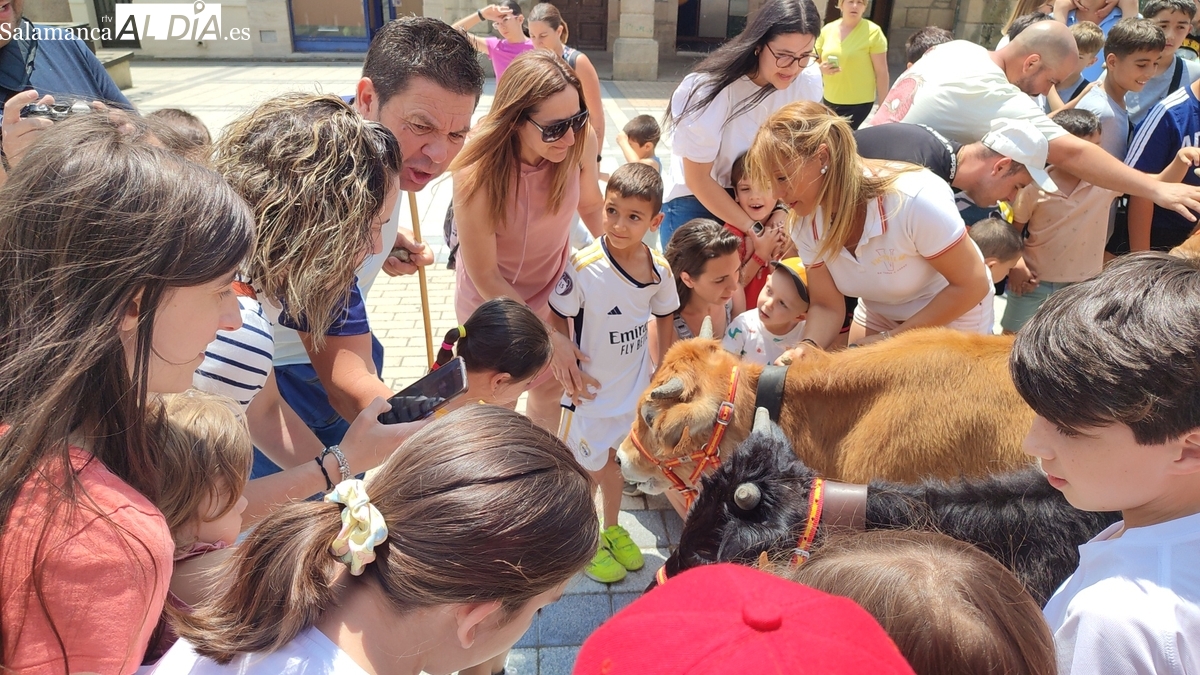 La bueyada infantil Tauro Tormes promovida por la Asociación Cultural Taurina Villa de Virtigudino llenaba de expectación este sábado las calles de Vitigudino, un espectáculo conmovedor para madres y padres cuando observaban cómo sus hijos acariciaban con ternura los pequeños mansos que recorrieron las calles hasta la Plaza de España.