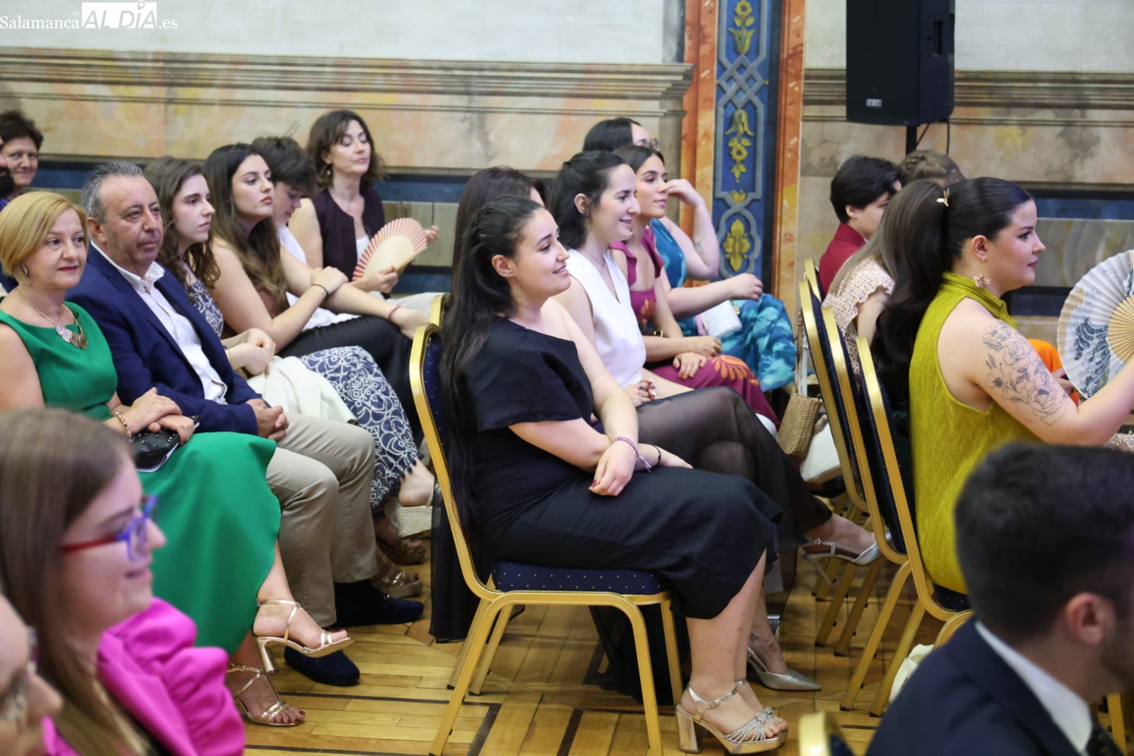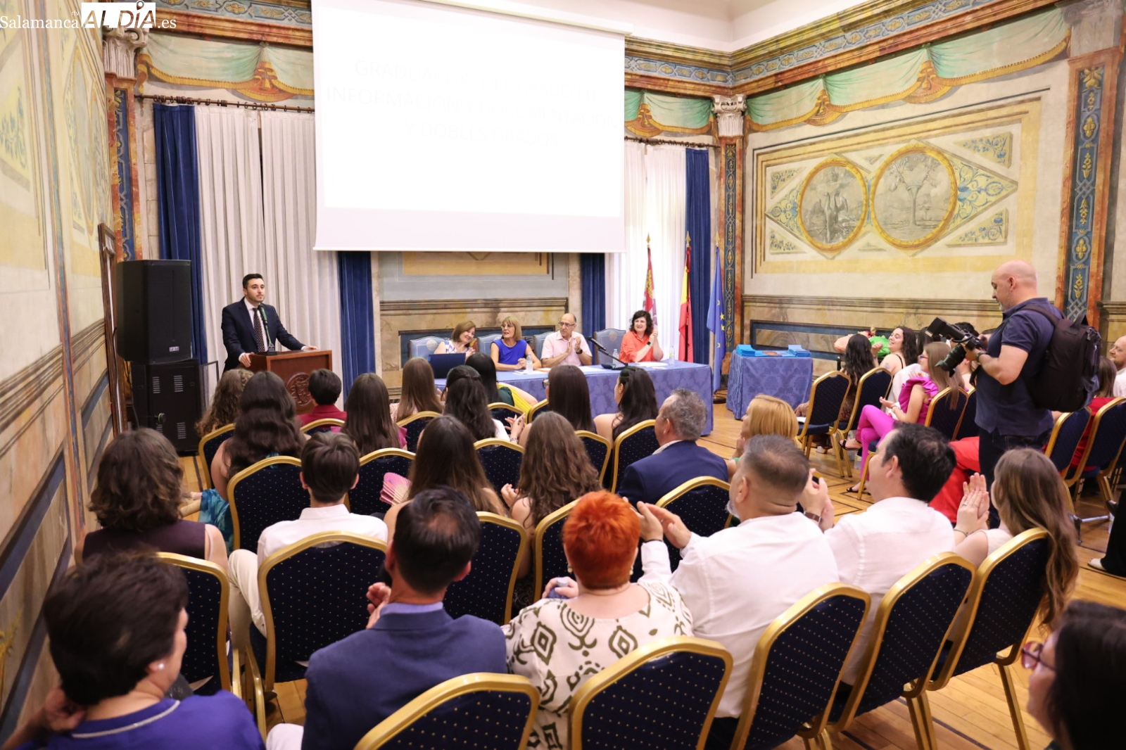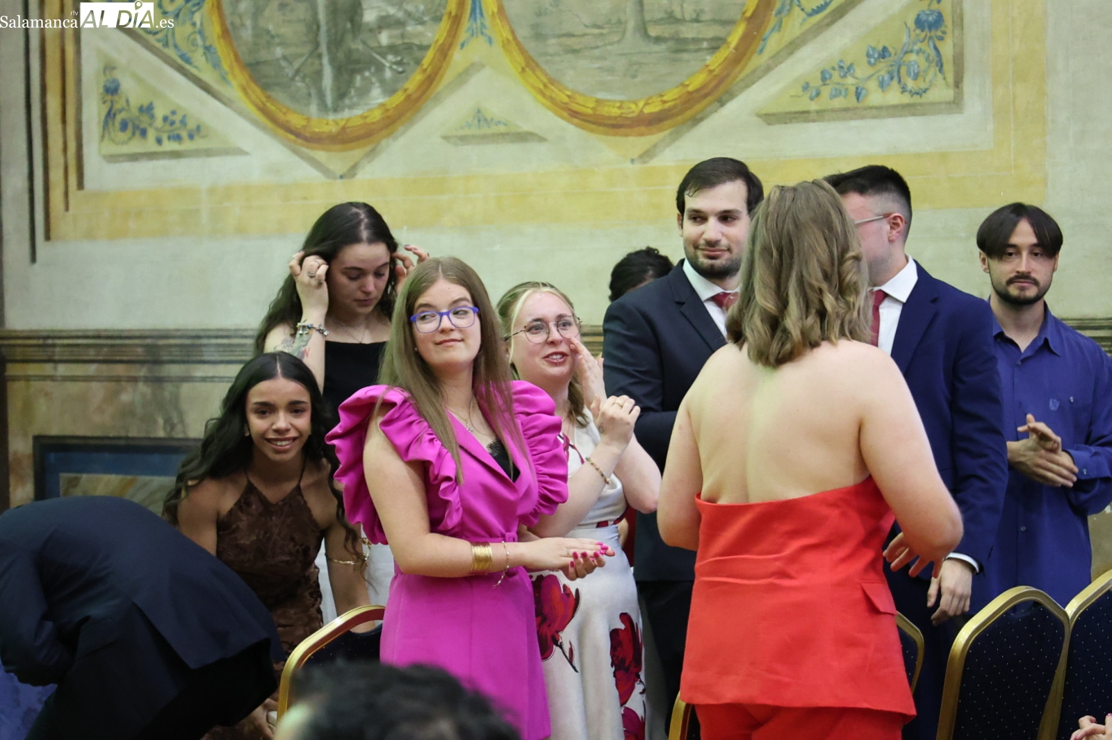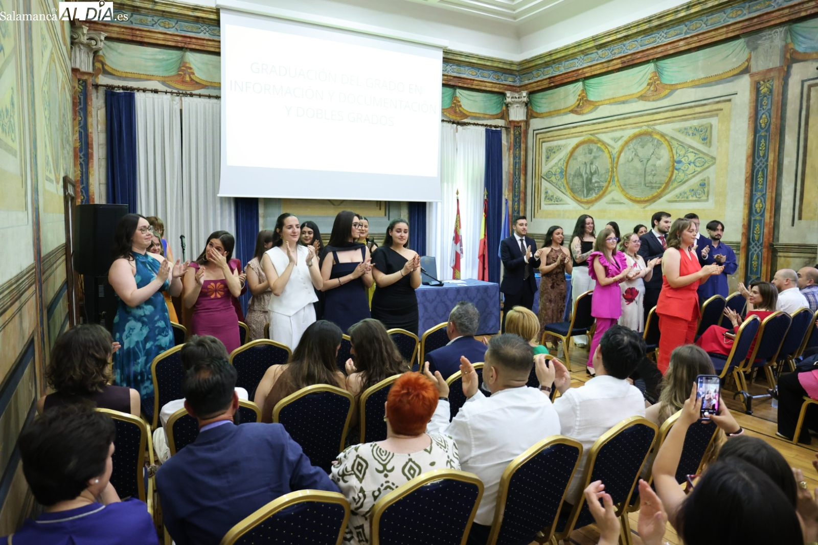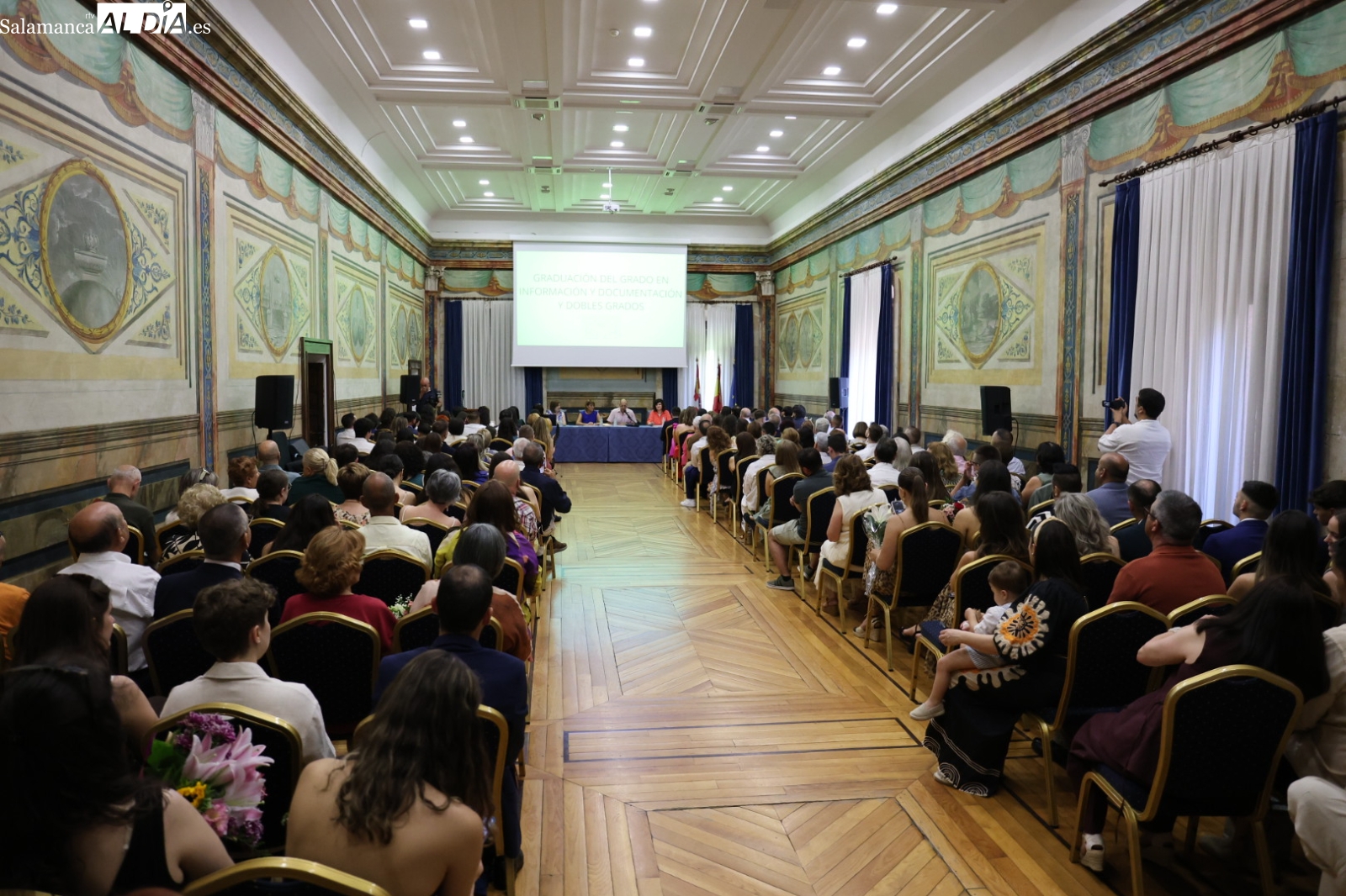 La histórica Sala de las Pinturas del Colegio Arzobispo Fonseca se llenó de emoción y alegría, al acoger el acto de graduación de los estudiantes del Grado en Información y Documentación de la Universidad de Salamanca (USAL), así como de sus dobles grados.