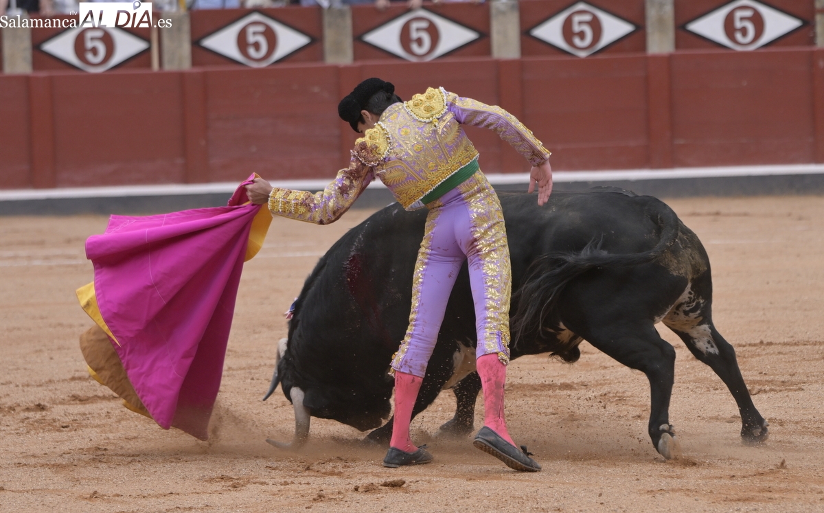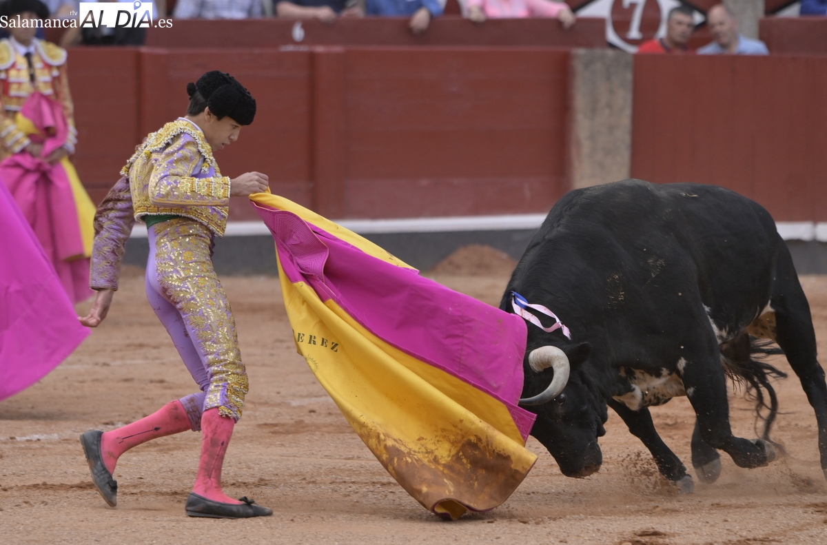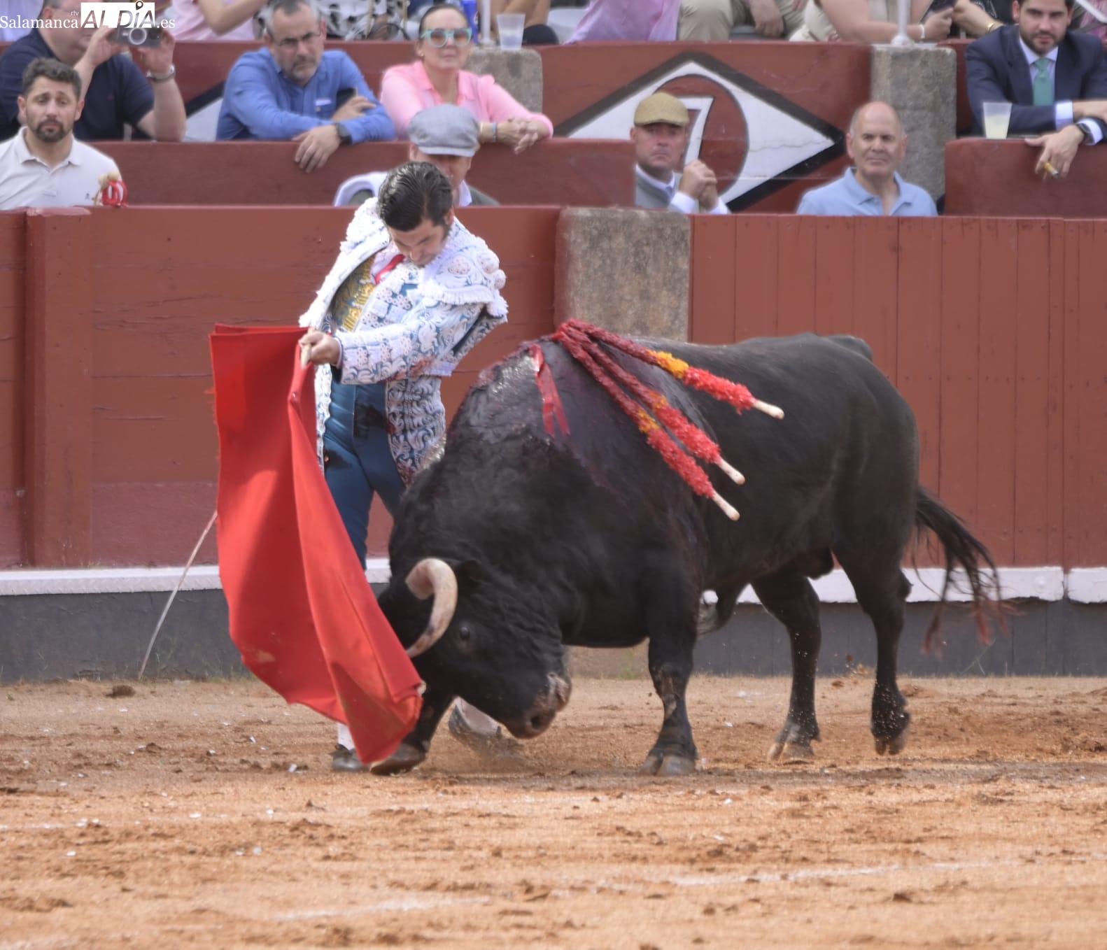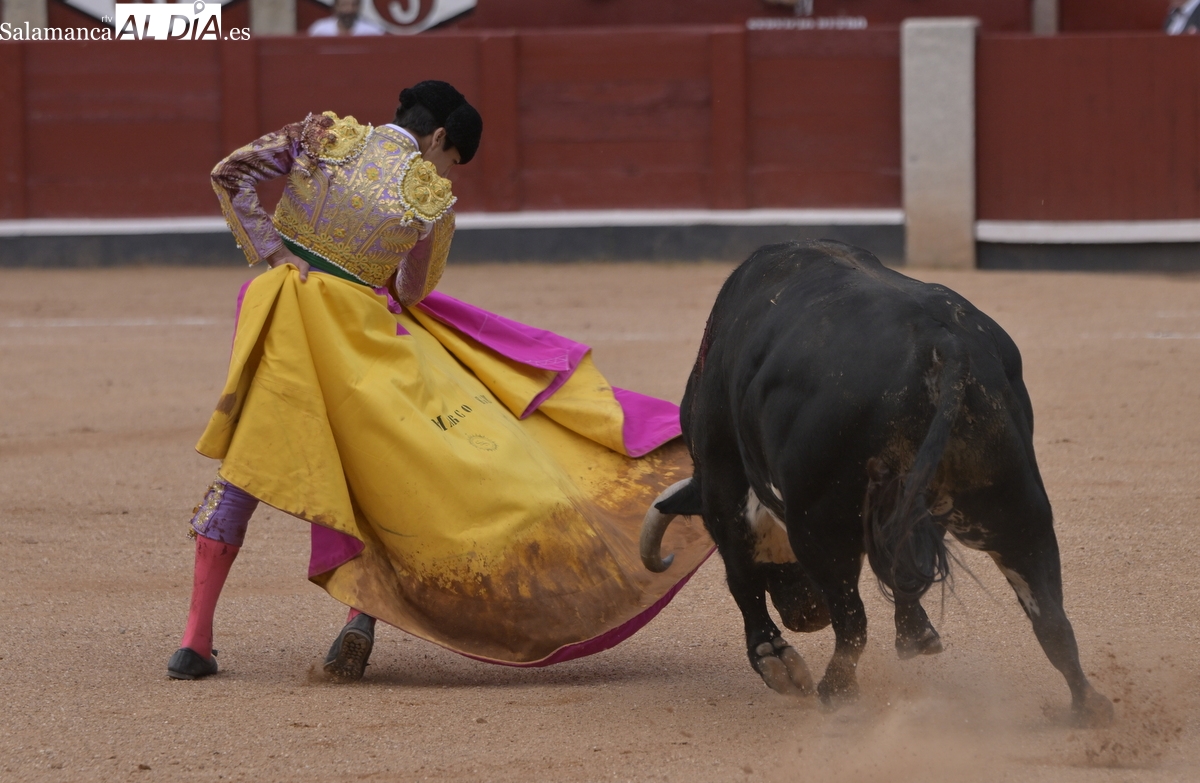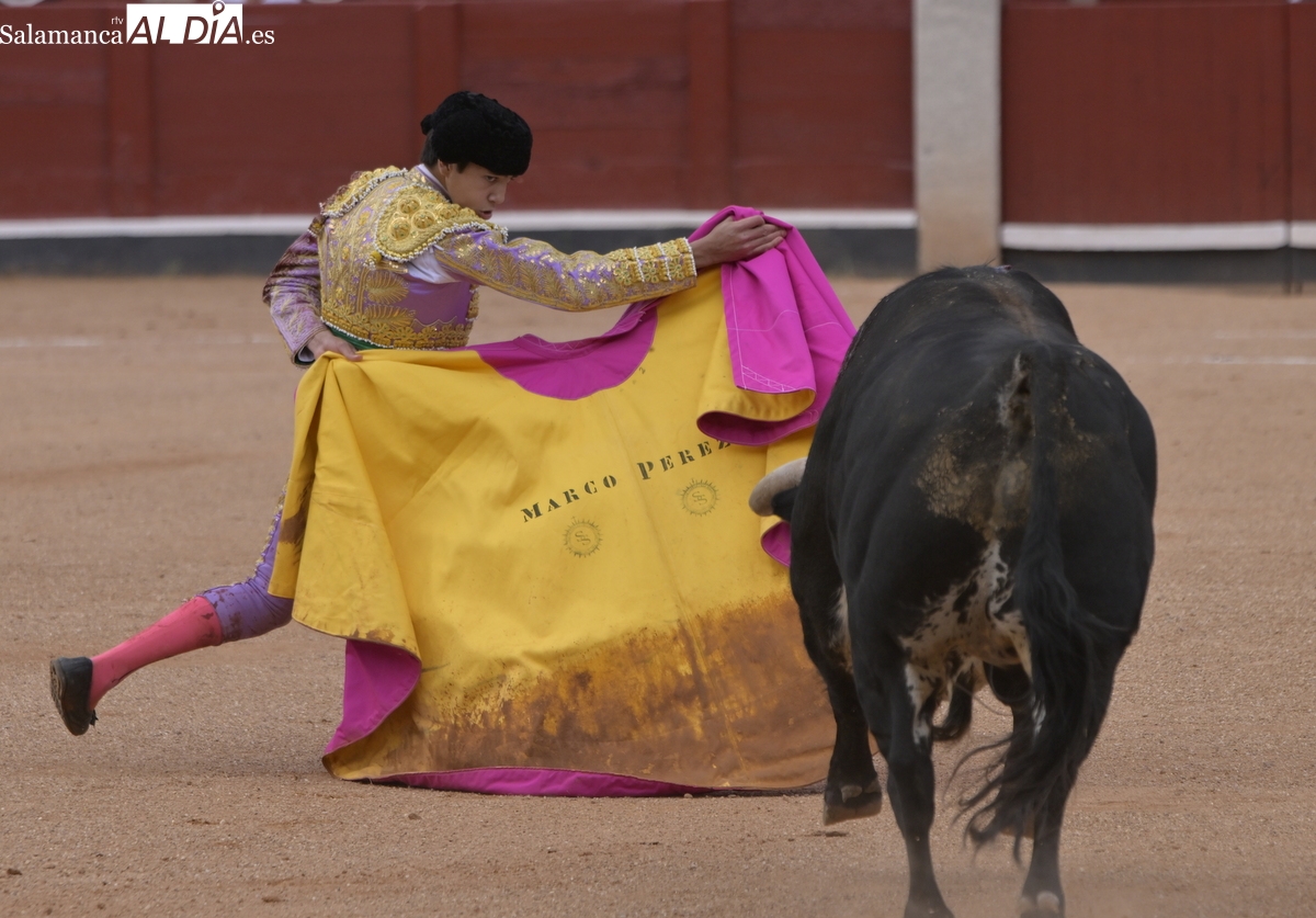De más alzada el cuarto, de Puerto de San Lorenzo, que se quedó muy corto y repuso mucho en el capote de Marco Pérez. Buen puyazo de Alberto Sandoval. Brindó el salmantino su faena a Alfonso Fernández Mañueco, antes de comenzar por templados doblones para irse saliendo hasta los medios. Poderoso Marco Pérez en el toreo a derechas, sometiendo mucho al de Puerto de San Lorenzo, noble pero al que le costó salirse de los vuelos. Muy al limite de fuerzas el astado, ante el que el espada apostó para robar naturales de mucho mérito, siempre a media altura para no quebrantar. Tremendo valor de Marco Pérez, aguantando parones y miradas de pánico. Muy importante el joven salmantino, que no se aburrió nunca frente al del Puerto y que fue un manantial de verdad, temple y capacidad. Pisó terrenos muy comprometidos Marco en un epílogo apabullante y que puso la plaza en pie. Hubo un cambio de mano soberbio, a cámara lenta. Todo lo hizo bien el charro menos la rúbrica con los aceros.