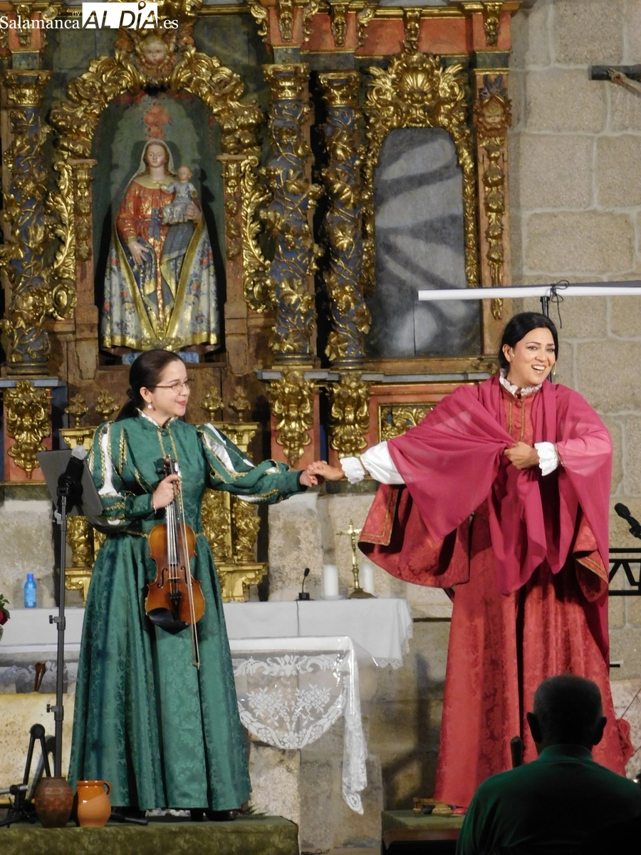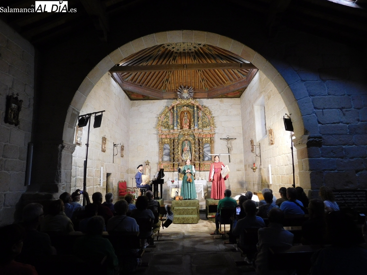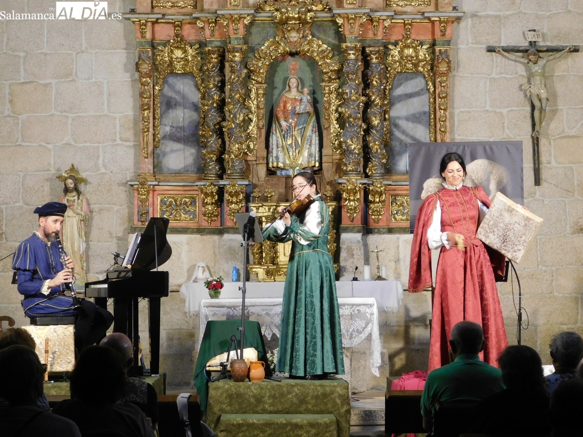 El espléndido artesonado mudéjar que corona el templo de El Manzano fue testigo y parte de la cuidada puesta en escena de ‘Arcos y Ecos’. El montaje, protagonizado por los talentosos artistas Guadalupe Lancho, Jenny Leyva y Juan Francisco Vicente, cautivó al numeroso público que abarrotó la iglesia, haciendo las delicias de los asistentes.