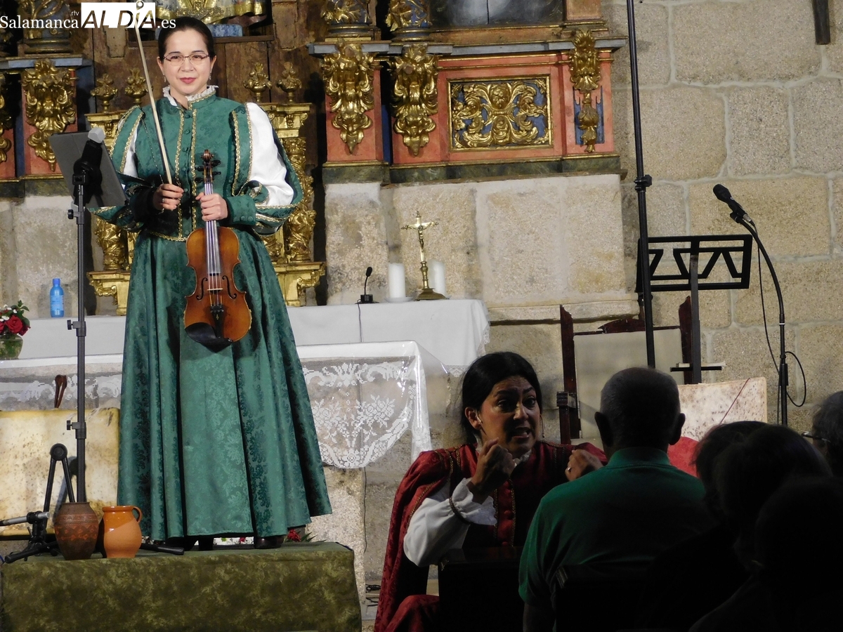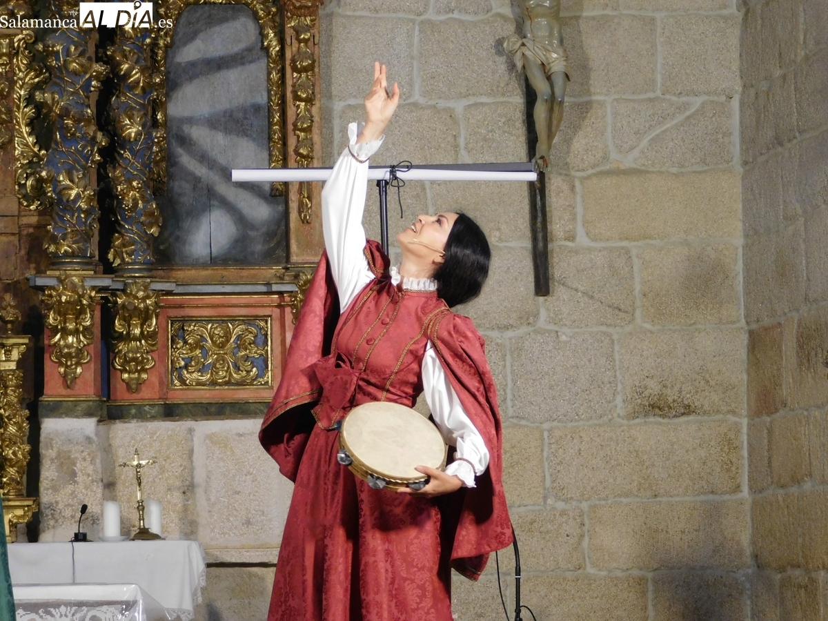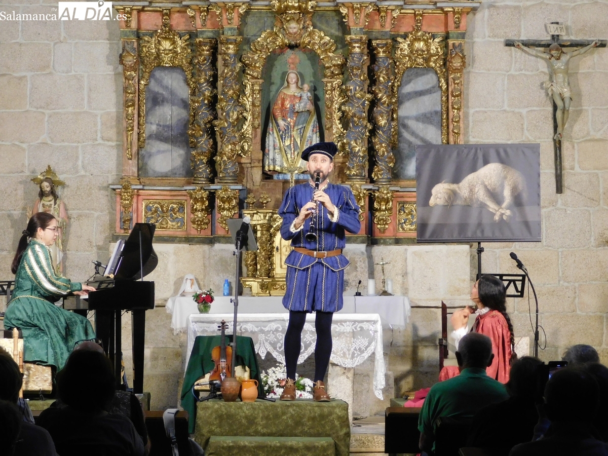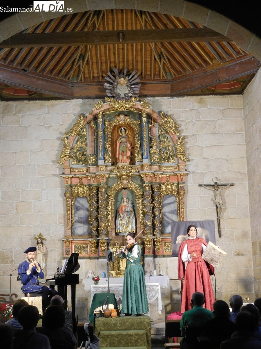 El espléndido artesonado mudéjar que corona el templo de El Manzano fue testigo y parte de la cuidada puesta en escena de ‘Arcos y Ecos’. El montaje, protagonizado por los talentosos artistas Guadalupe Lancho, Jenny Leyva y Juan Francisco Vicente, cautivó al numeroso público que abarrotó la iglesia, haciendo las delicias de los asistentes.