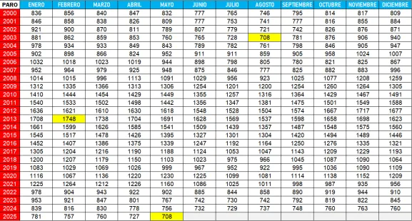 Hasta ahora, la cifra más baja de parados en un mes de mayo en lo que va de siglo eran los 756 del año pasado, seguidos de los 760 de mayo de 2003, tres meses antes de que se marcase el citado mínimo en lo que va de siglo. Frente a ello, la cifra más alta en mayo fueron los 1.691 parados de 2013 (tres meses antes, en febrero, se marcó el registro más alto del siglo, con 1.748 desempleados). Desde 2013, el paro ha ido bajando de mayo a mayo, salvo en 2020 debido a la pandemia (se pasó de 999 en mayo de 2019 a 1.230 en mayo de 2020).